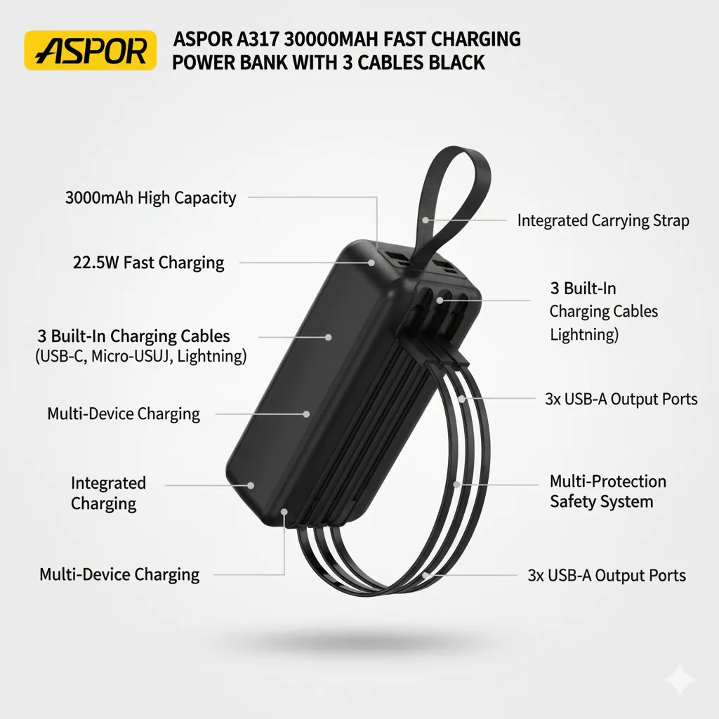 Meet the Aspor A317 22.5W 30000mAh Power Bank — the ultimate high-capacity portable charger built for performance and convenience.