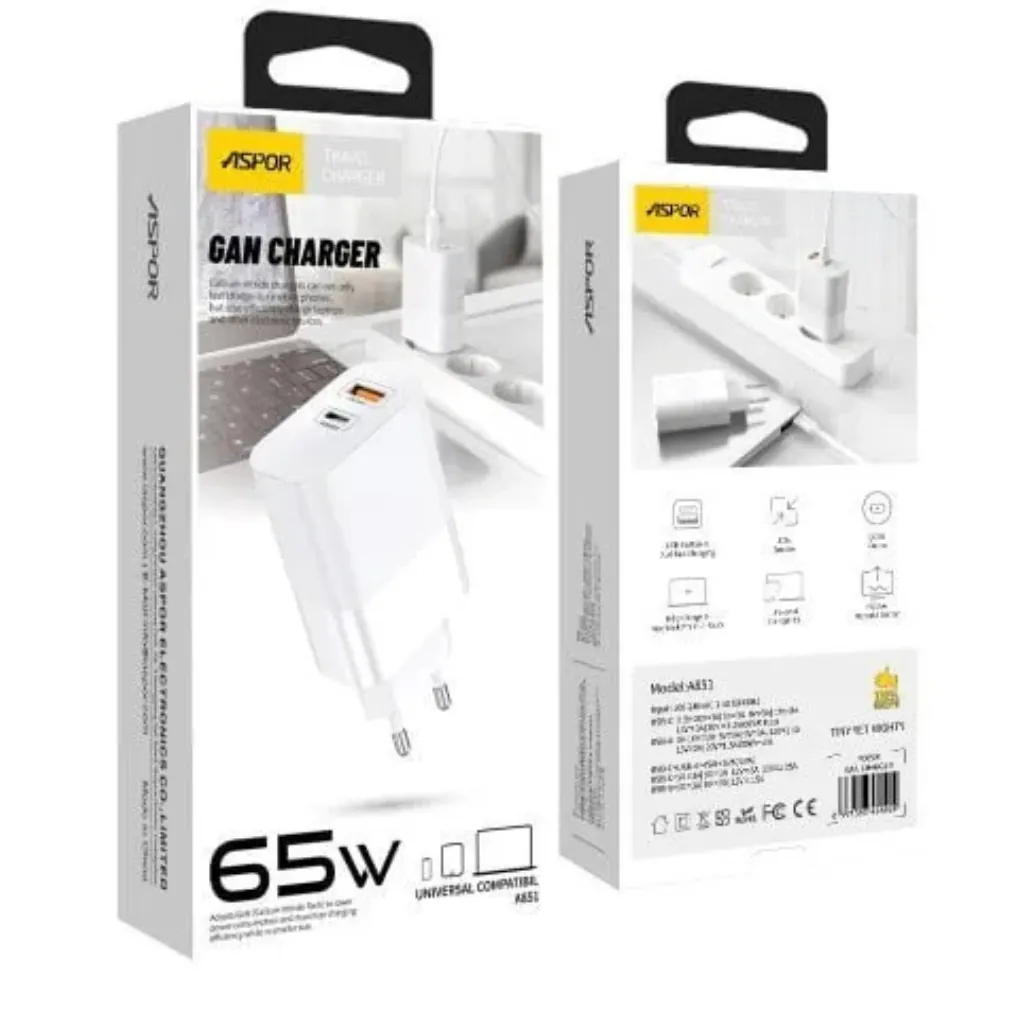 Power up smarter with the ASPOR A851 GaN 65W QC3.0 Multi-Port Wall Charger — a next-generation fast charger built for speed, efficiency, and versatility. Featuring Gallium Nitride (GaN) technology, this charger provides high-power output with lower heat generation, making it more compact and energy-efficient than traditional adapters.