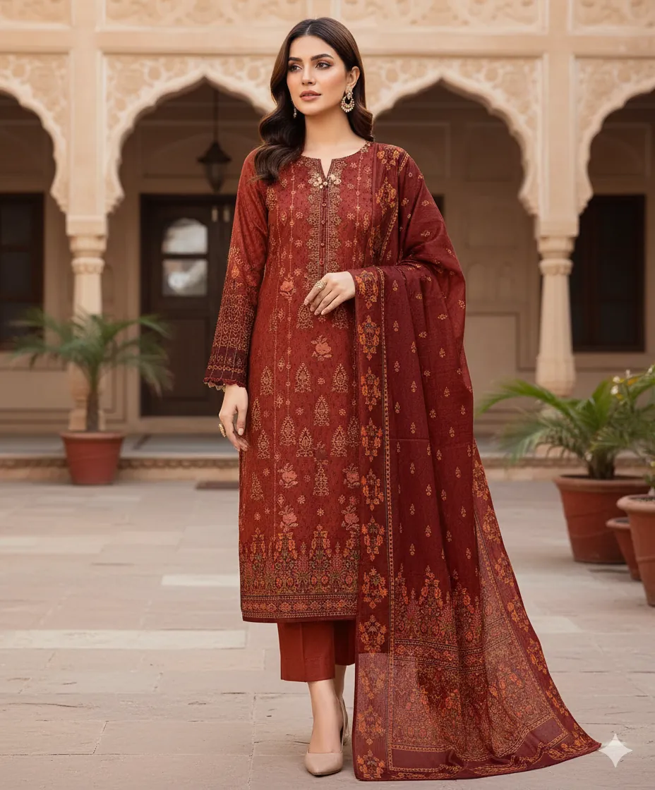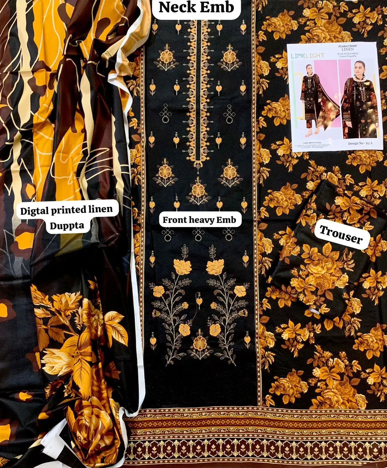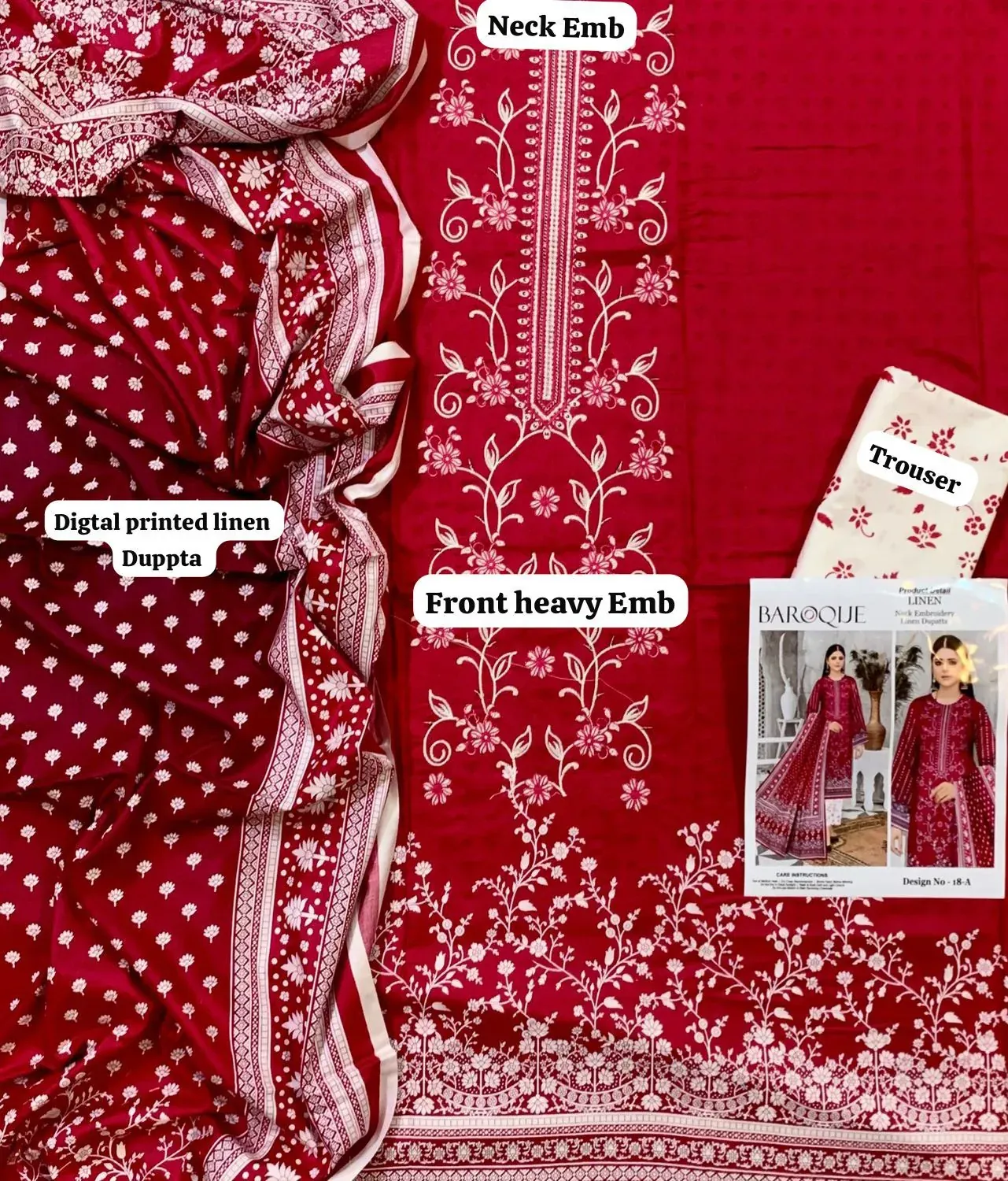 The collection features various designs from popular brands like Limelight, Edenrobe, Class Stitch, and Baroque, each with a distinct aesthetic. The shirts are adorned with beautiful neck and heavy front embroidery, showcasing a variety of patterns from delicate floral motifs to traditional geometric designs. Complementing the shirts are vibrant digital printed dupattas, which add a touch of modern flair and a graceful drape. The plain matching trousers complete the look, providing a clean and classic finish.