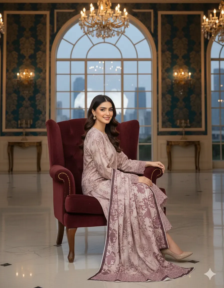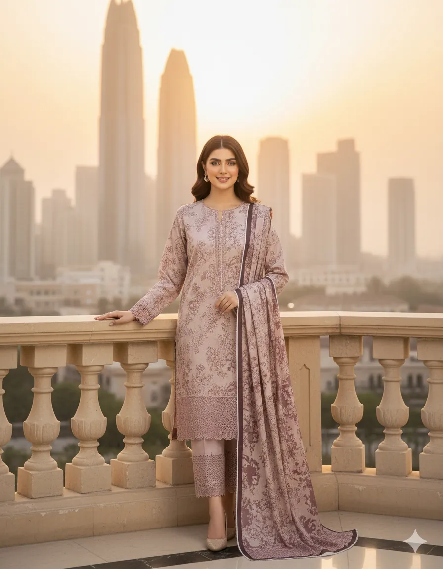 Step into the winter season with style and grace in our most demanded Baroque Winter 2025 collection. This premium quality (72/72) 3-piece linen suit is a masterpiece of digital printing, featuring an elegant, all-over pattern that exudes sophistication. The shirt's front is adorned with intricate embroidery, while the daman boasts stunning appliqué and cutwork, adding a touch of unique artistry.