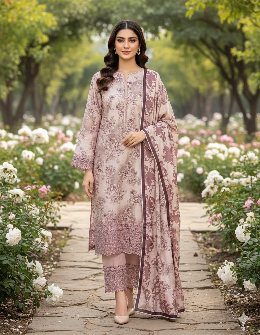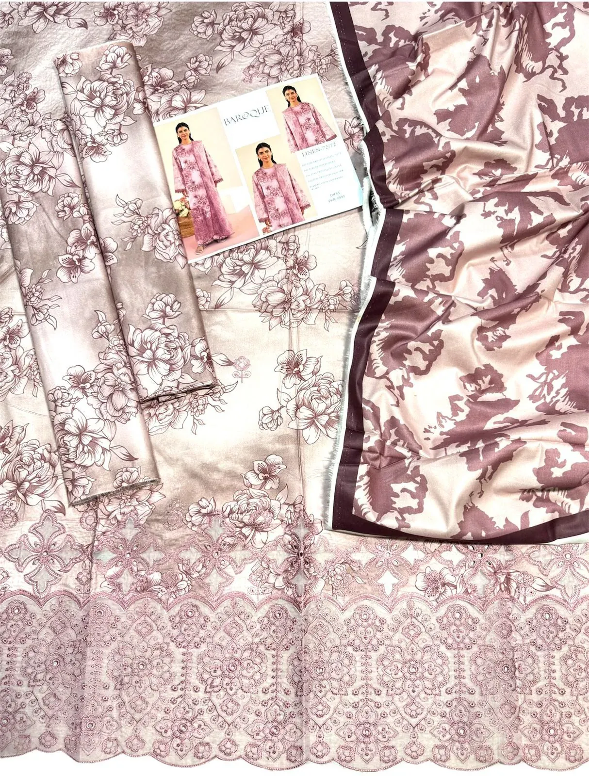 Authentic Baroque Winter 2025: Unstitched 3-Piece Linen Digital Print Dress with Intricate Front Embroidery & Daman Appliqué Cutwork