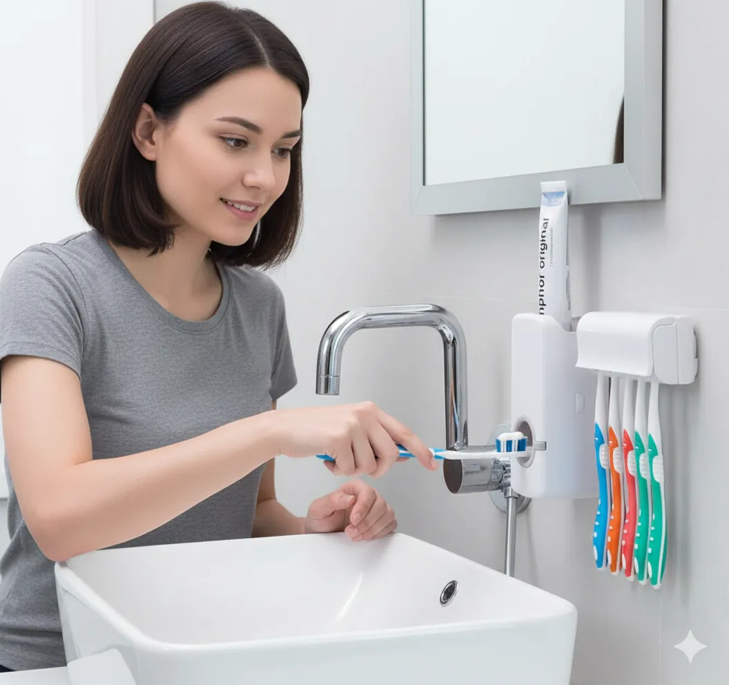 The automatic dispenser works with a simple push, providing the perfect amount of toothpaste every time, which helps reduce waste and keeps your counter clean and clutter-free. The accompanying holder can neatly store up to five toothbrushes, protecting them from dust and airborne particles, ensuring hygiene for the whole family.