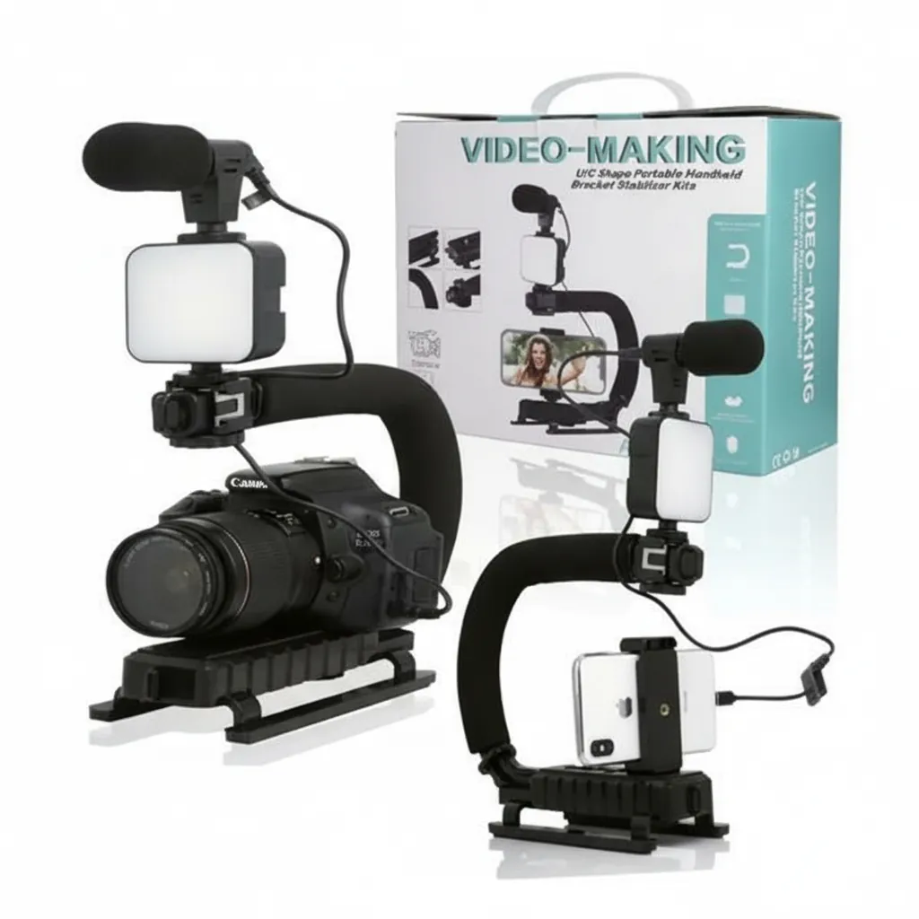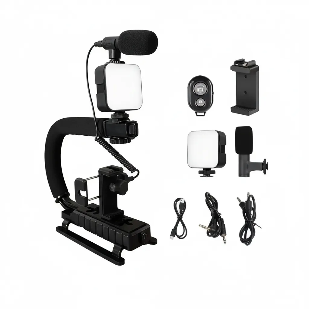 The U-Shape Portable Handheld Bracket Stabilizer Kit is an all-in-one video-making solution designed for content creators, vloggers, and mobile filmmakers. Its unique U-shaped ergonomic handle provides a comfortable, anti-slip grip for extended shooting sessions while minimizing hand fatigue and camera shake. The kit includes a sturdy base with a universal 1/4" screw mount, compatible with most smartphones (via adjustable phone clip) and DSLR/mirrorless cameras. It comes equipped with a detachable mini LED fill light (with adjustable brightness) to ensure well-lit footage in low-light conditions, and a high-sensitivity external microphone with windscreen for clear, professional-grade audio capture. The flexible gooseneck arms allow precise positioning of accessories, while the lightweight yet durable ABS and foam construction ensures portability without compromising stability. Ideal for YouTube, TikTok, Instagram Reels, interviews, or travel vlogs, this compact kit transforms your device into a professional handheld rig. Foldable design for easy storage and transport.