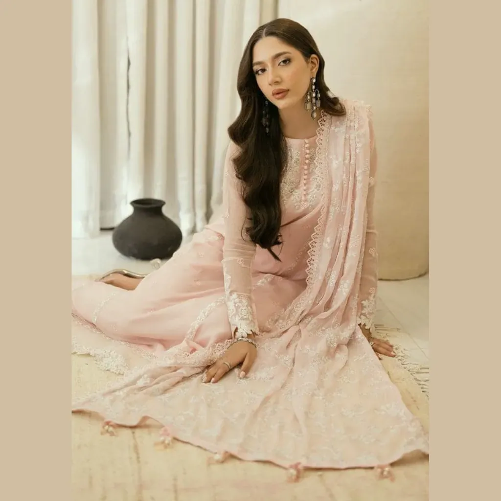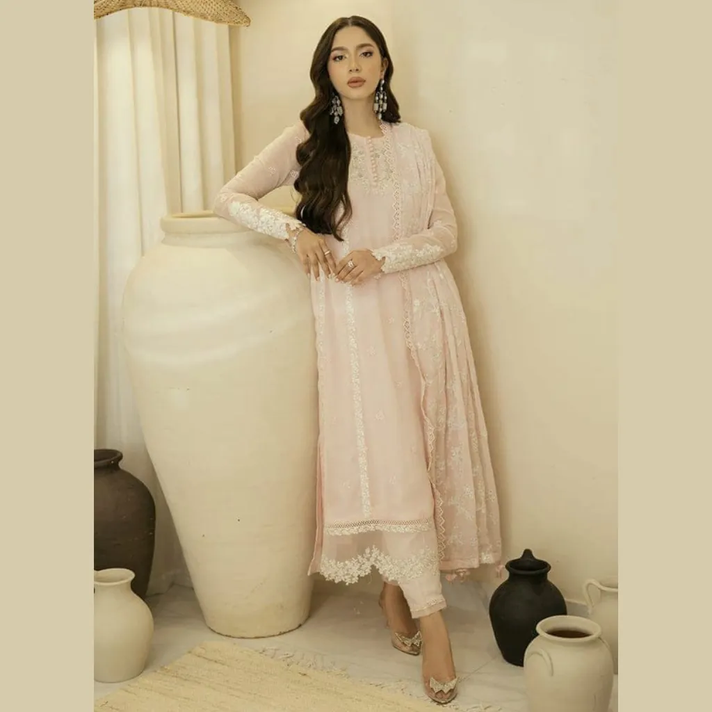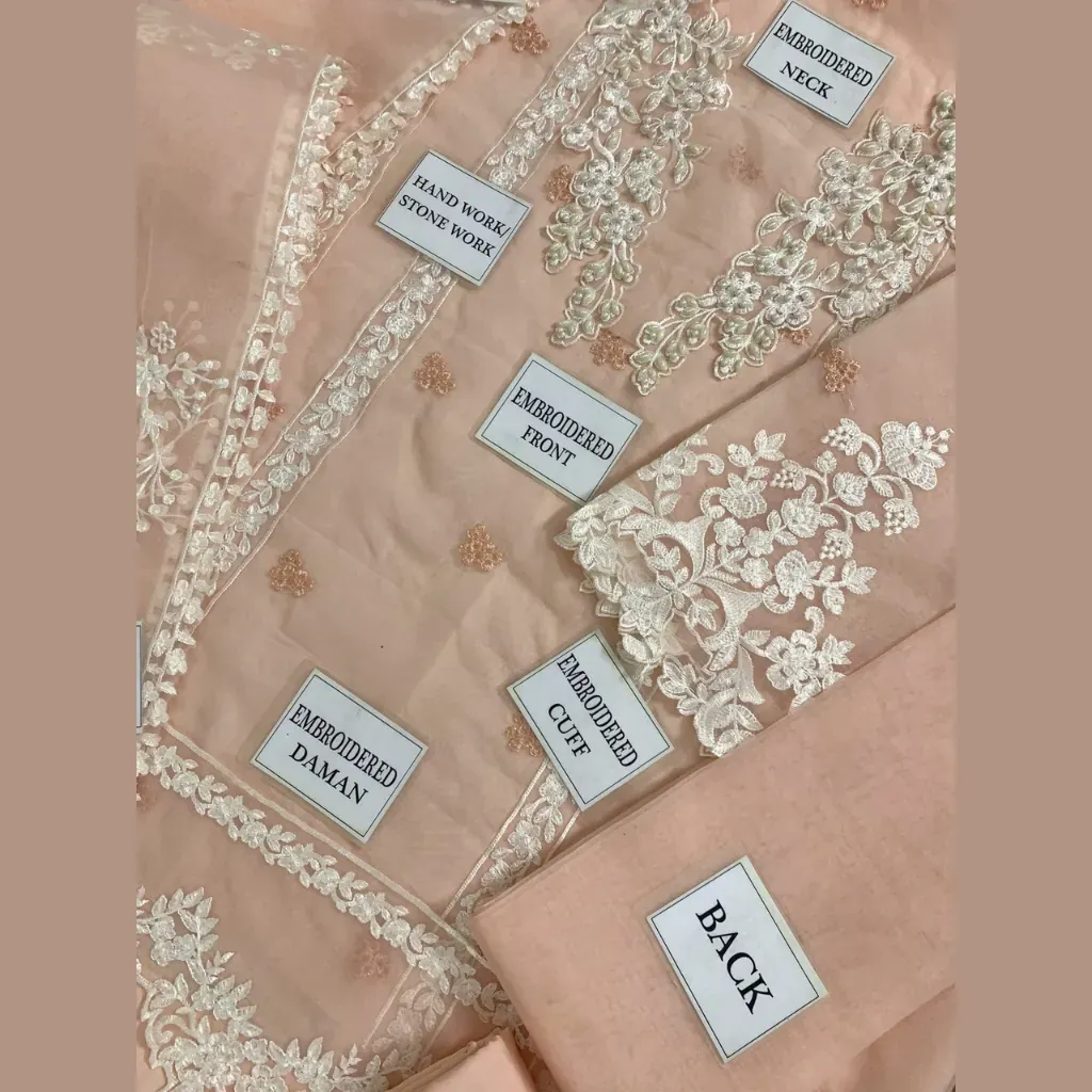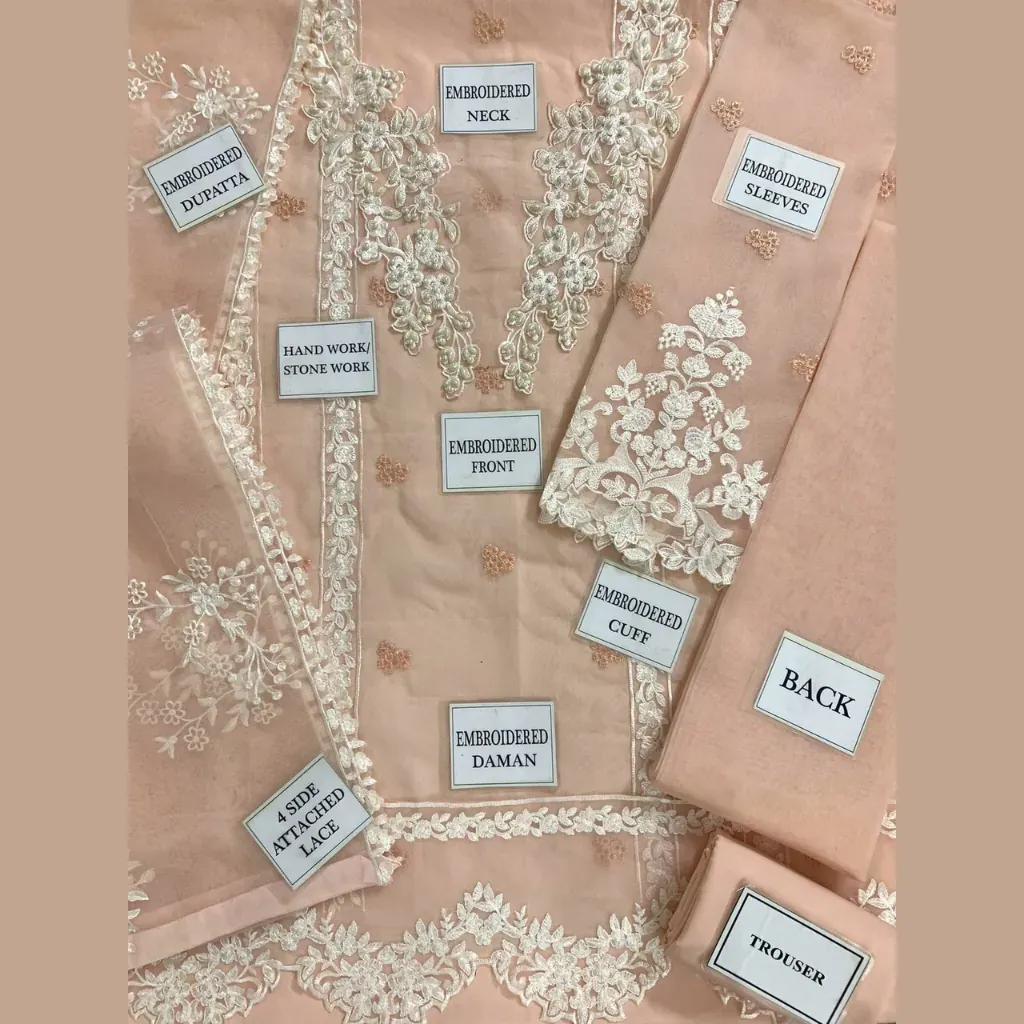 Step into elegance with this Azure organza embroidered luxury 3pc unstitched suit, crafted with exquisite detailing for weddings, festive events, and formal occasions. The front is finely embroidered on premium organza, while the neckline shines with handwork embellishment for a graceful statement. The daman features handwork and intricate cutwork, giving the outfit a luxurious finish. Embroidered organza sleeves add refinement, while the plain organza back balances the look. The outfit is paired with a plain malai trouser for comfort and style. Completing the ensemble, the organza embroidered dupatta with cutwork (ready to wear) enhances the overall grace and elegance.