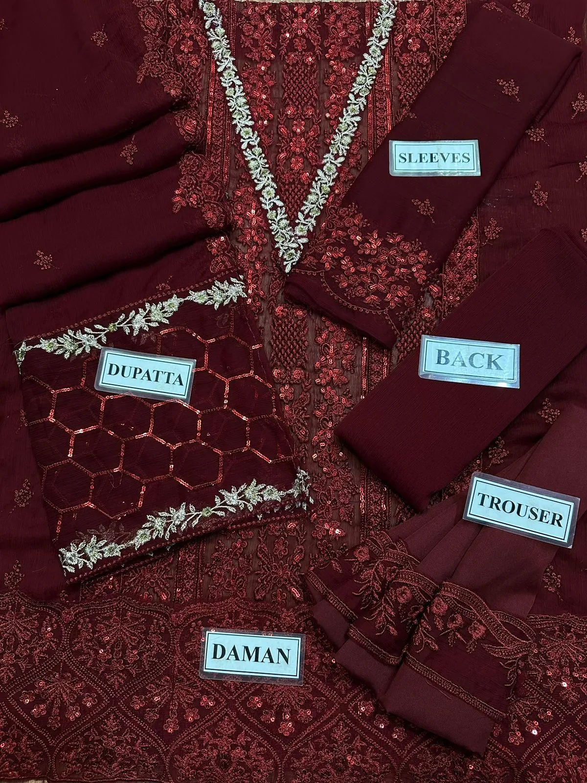 Azure MD 1143 Luxury Chiffon Embroidered Suit - 3PC Unstitched Dress with 4-Sided Dupatta (Maroon/Burgundy)