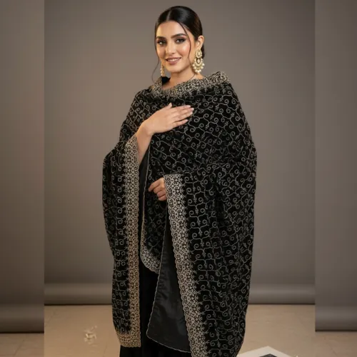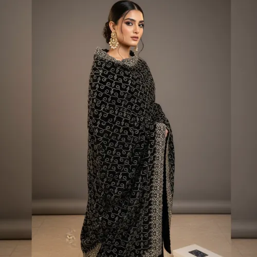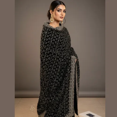 Drape yourself in sheer luxury this winter with our exquisite Bareeza Embroidered Velvet Shawl, a pinnacle of sophisticated design and unparalleled comfort. Crafted from the finest quality velvet, this shawl offers a sumptuously soft touch and a rich, elegant drape that is perfect for any special occasion or adding a touch of grandeur to your everyday attire. The deep black velvet is beautifully adorned with intricate golden embroidery, featuring a flowing, curvilinear pattern that exudes classic charm and modern grace.