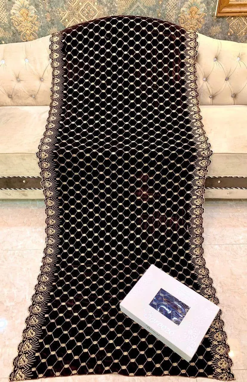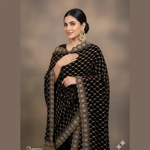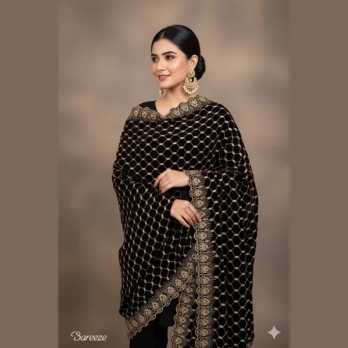 Bareeza Luxury Velvet Shawl - 2.5m Winter Collection | Intricate Golden Net Design. Embrace timeless elegance with this beautiful Bareeza Velvet Shawl, a standout piece from our exclusive winter collection. Crafted from rich, high-quality velvet, this shawl provides exceptional warmth and a luxurious feel, making it the perfect choice for special occasions. The deep black velvet serves as a stunning canvas for the exquisite golden embroidery. The design features a delicate, intricate net-like grid pattern that covers the entire shawl, with beautifully detailed borders.