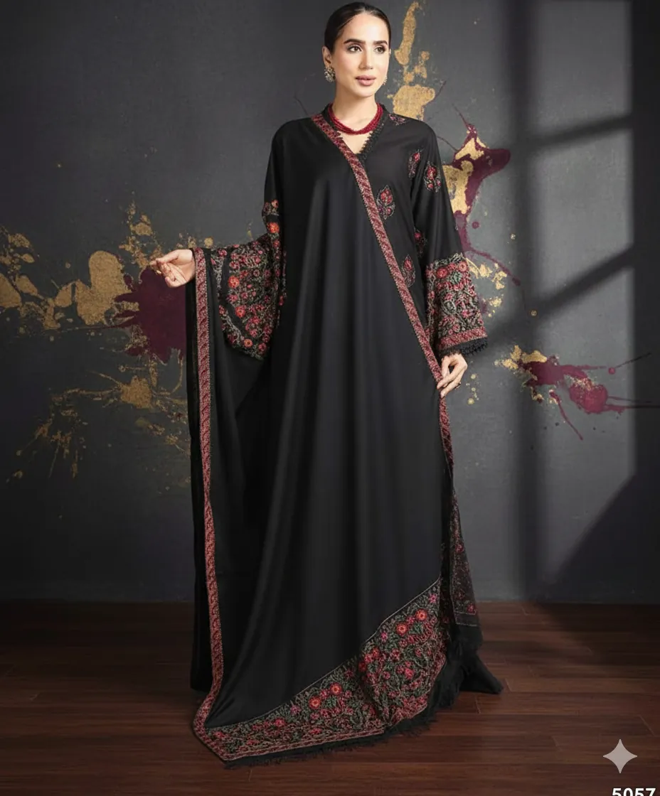 This is the fully embroidered Dhanak shirt in a striking black base, showcasing intricate, heavy embroidery—often in rich red, green, and gold threadwork—across the front, especially on the daman (hemline) and neckline, reflecting traditional Pakistani craftsmanship. The design often mimics a stylish, contemporary silhouette like the displayed kaftan.