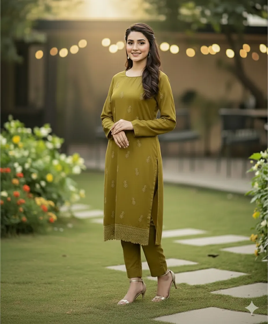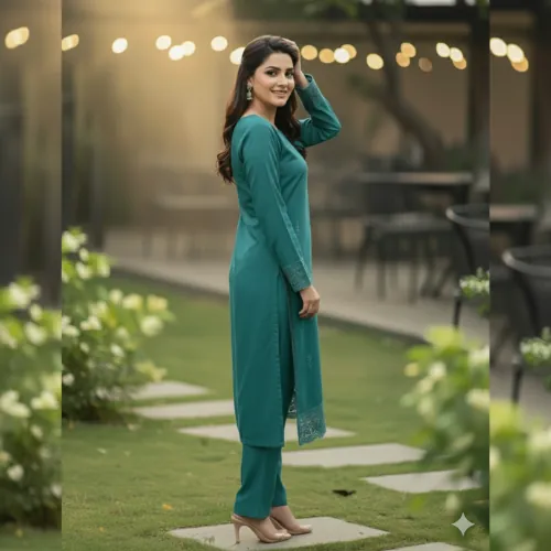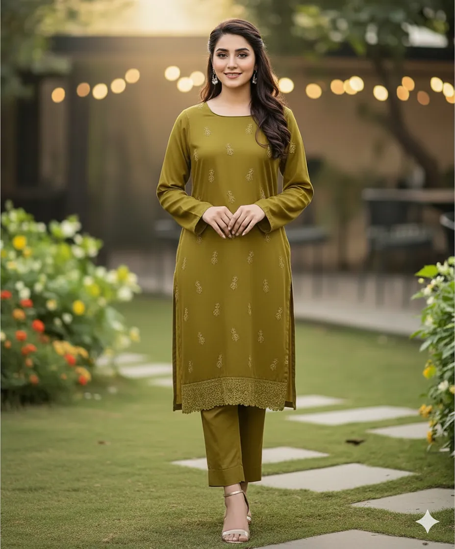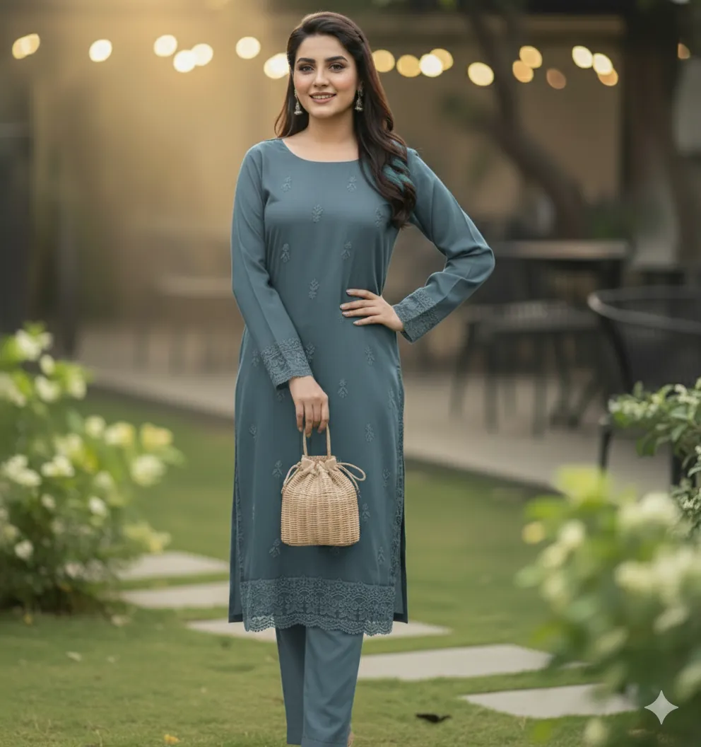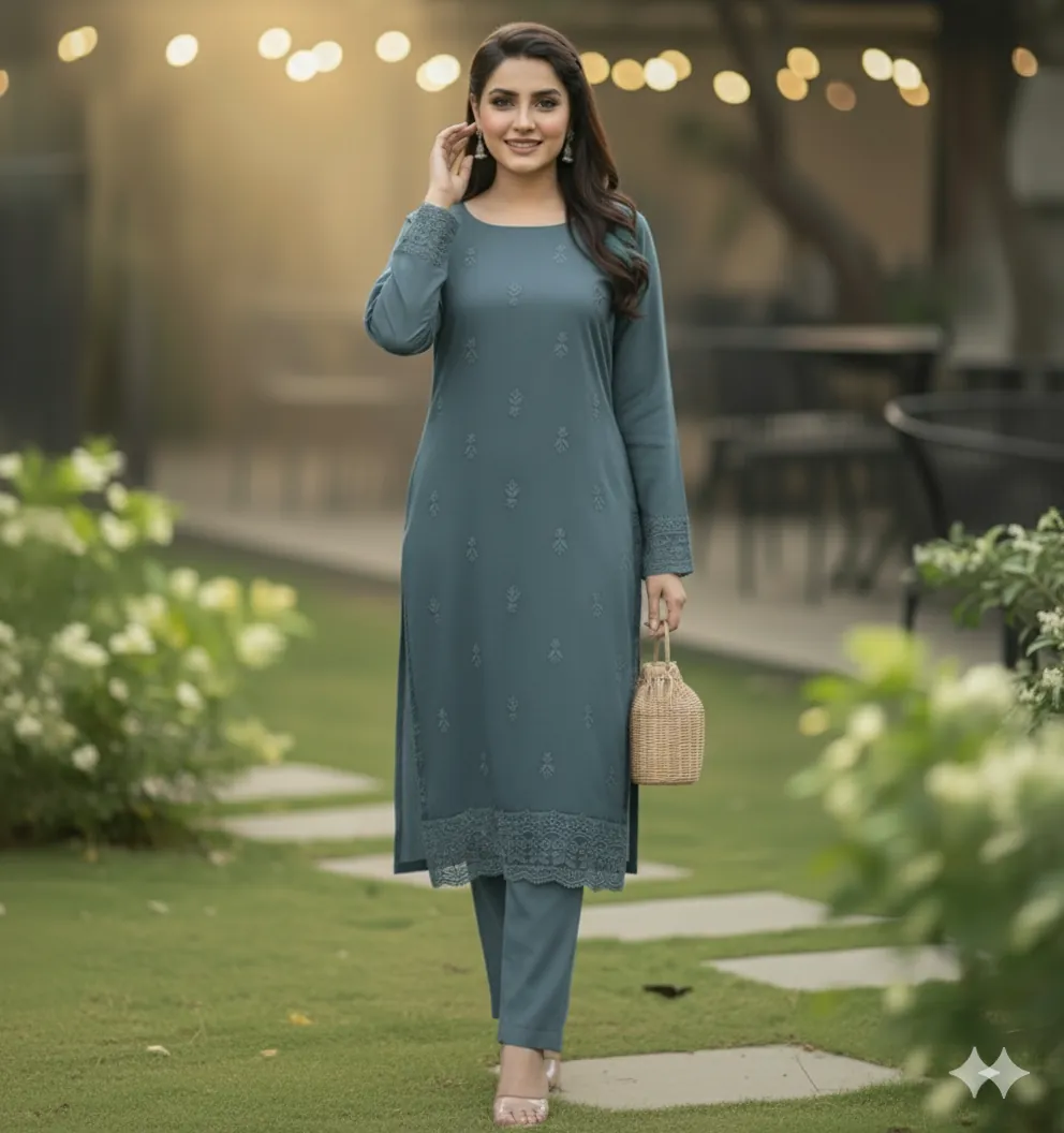 Design & Embroidery: The ensemble captivates with its understated yet intricate embroidery. The front, back, and sleeves of the kameez are adorned with delicate, self-colored threadwork. To add a touch of grandeur, the set includes two separate embroidered patches for the front and back daman (hemline), allowing for a customized and polished finish. The trousers are kept plain to perfectly balance the detailed craftsmanship of the shirt.