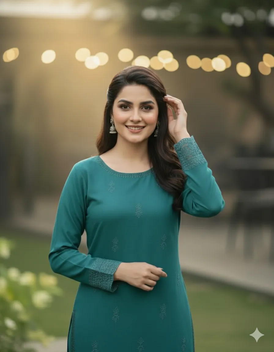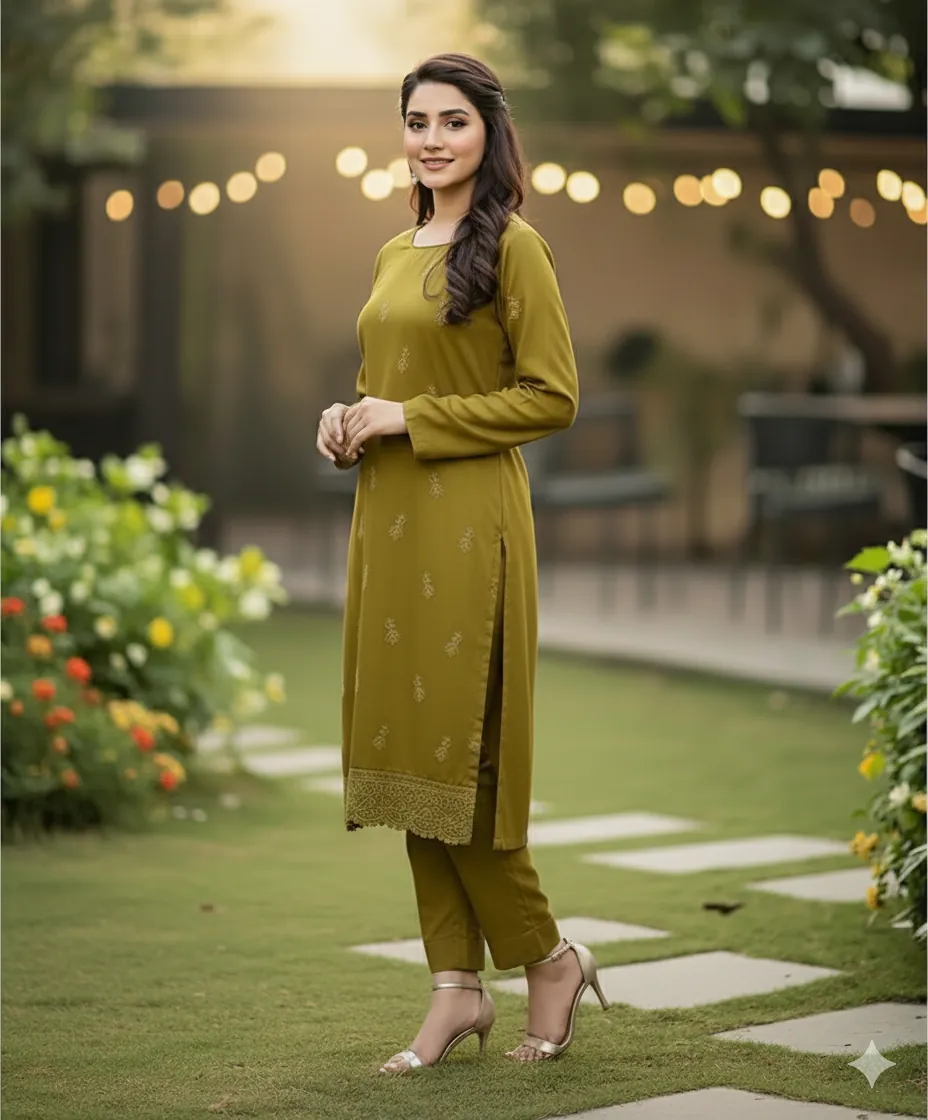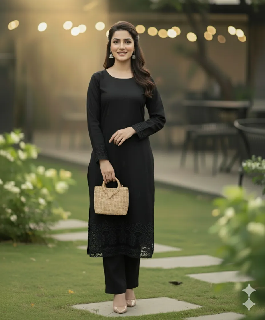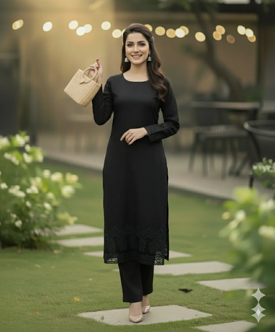 Design & Embroidery: The ensemble captivates with its understated yet intricate embroidery. The front, back, and sleeves of the kameez are adorned with delicate, self-colored threadwork. To add a touch of grandeur, the set includes two separate embroidered patches for the front and back daman (hemline), allowing for a customized and polished finish. The trousers are kept plain to perfectly balance the detailed craftsmanship of the shirt.