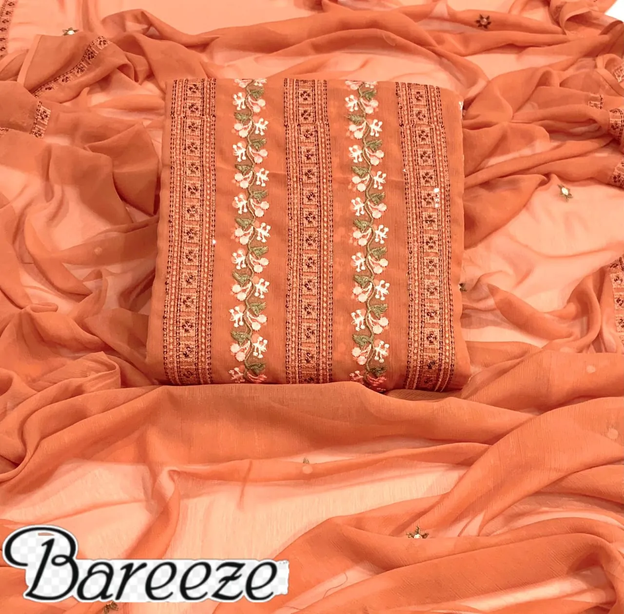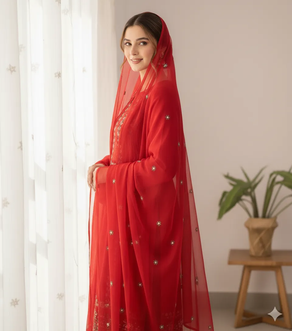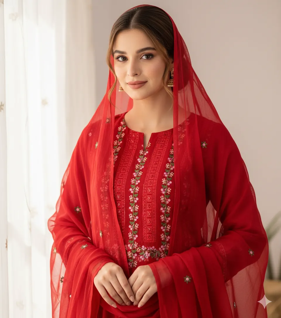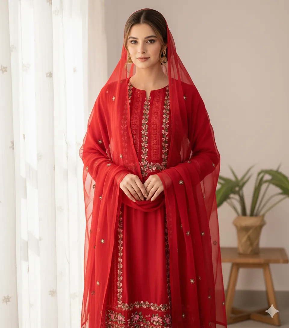 Bareeze Fancy Winter 2025 | Red Embroidered 2-Piece Bamber Chiffon Suit.Introducing a new arrival from the Bareeze Fancy Winter 2025 Collection. This 2-piece suit is made from high-quality Bamber Chiffon and features a heavily embroidered front and a fancy embroidered dupatta. Make a striking statement with this elegant and fancy suit from the Bareeze Winter 2025 Collection. Crafted from guaranteed high-quality Bamber Chiffon fabric, this two-piece set offers both style and comfort. The shirt is adorned with heavy embroidery on the front, complemented by delicate embroidery on the back and sleeves. The ensemble is completed with a beautifully embroidered and fancy dupatta. This unstitched suit provides 2.5 meters of shirt fabric and 2.5 meters of dupatta fabric, allowing you to get the perfect fit.