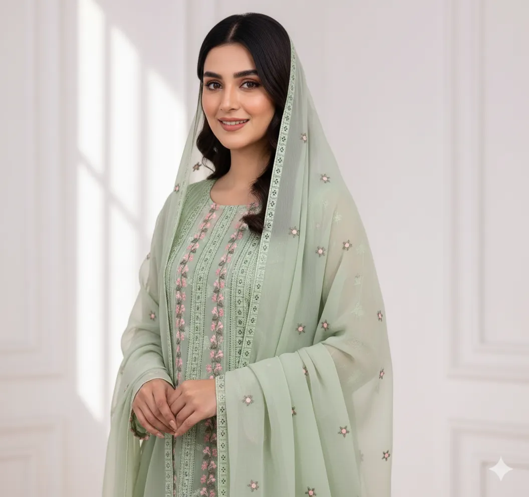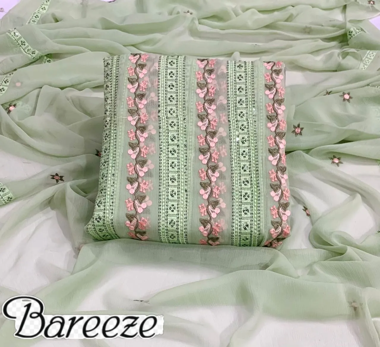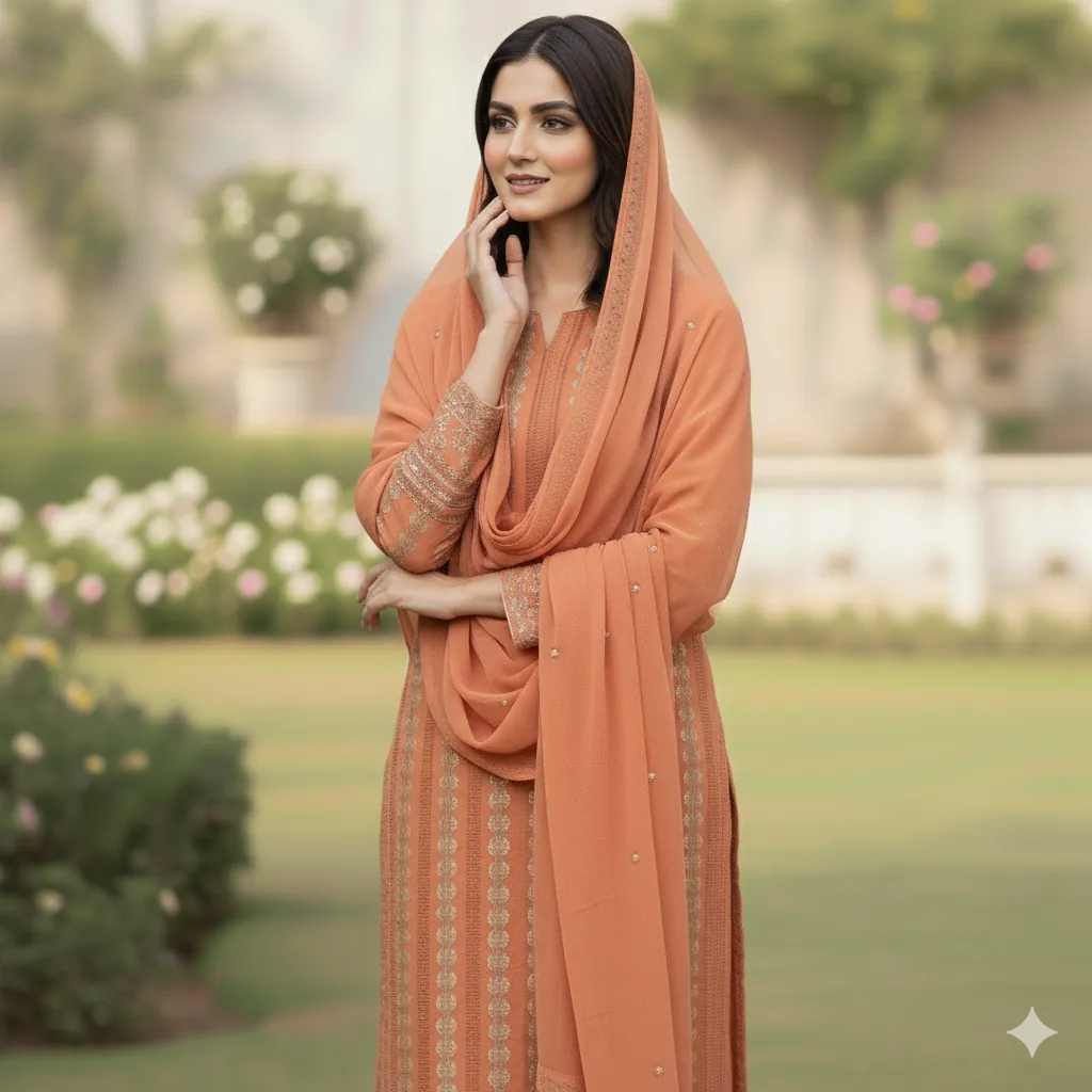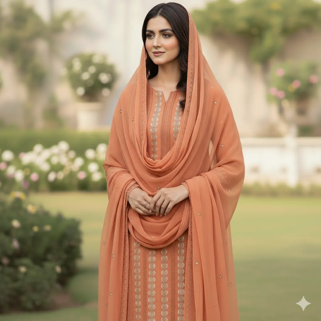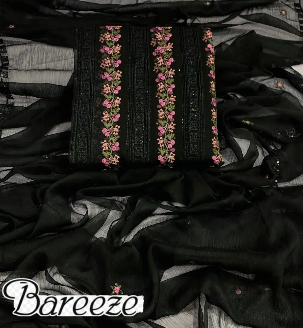 Bareeze Fancy Winter 2025 | Red Embroidered 2-Piece Bamber Chiffon Suit.Introducing a new arrival from the Bareeze Fancy Winter 2025 Collection. This 2-piece suit is made from high-quality Bamber Chiffon and features a heavily embroidered front and a fancy embroidered dupatta. Make a striking statement with this elegant and fancy suit from the Bareeze Winter 2025 Collection. Crafted from guaranteed high-quality Bamber Chiffon fabric, this two-piece set offers both style and comfort. The shirt is adorned with heavy embroidery on the front, complemented by delicate embroidery on the back and sleeves. The ensemble is completed with a beautifully embroidered and fancy dupatta. This unstitched suit provides 2.5 meters of shirt fabric and 2.5 meters of dupatta fabric, allowing you to get the perfect fit.