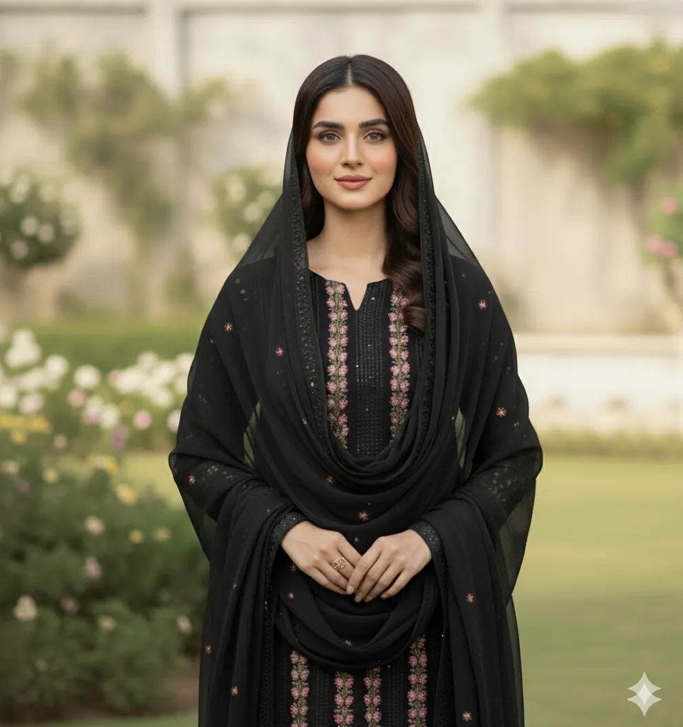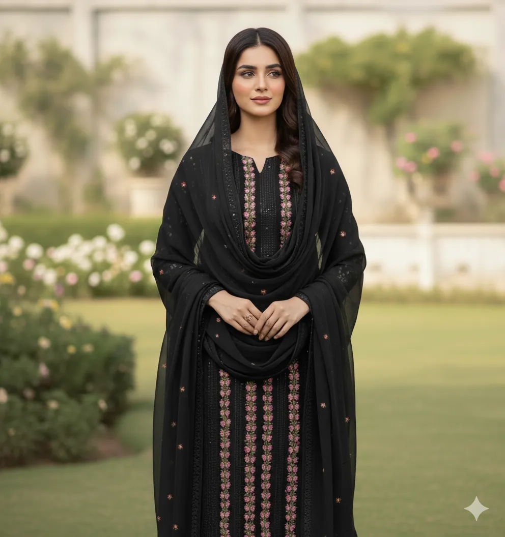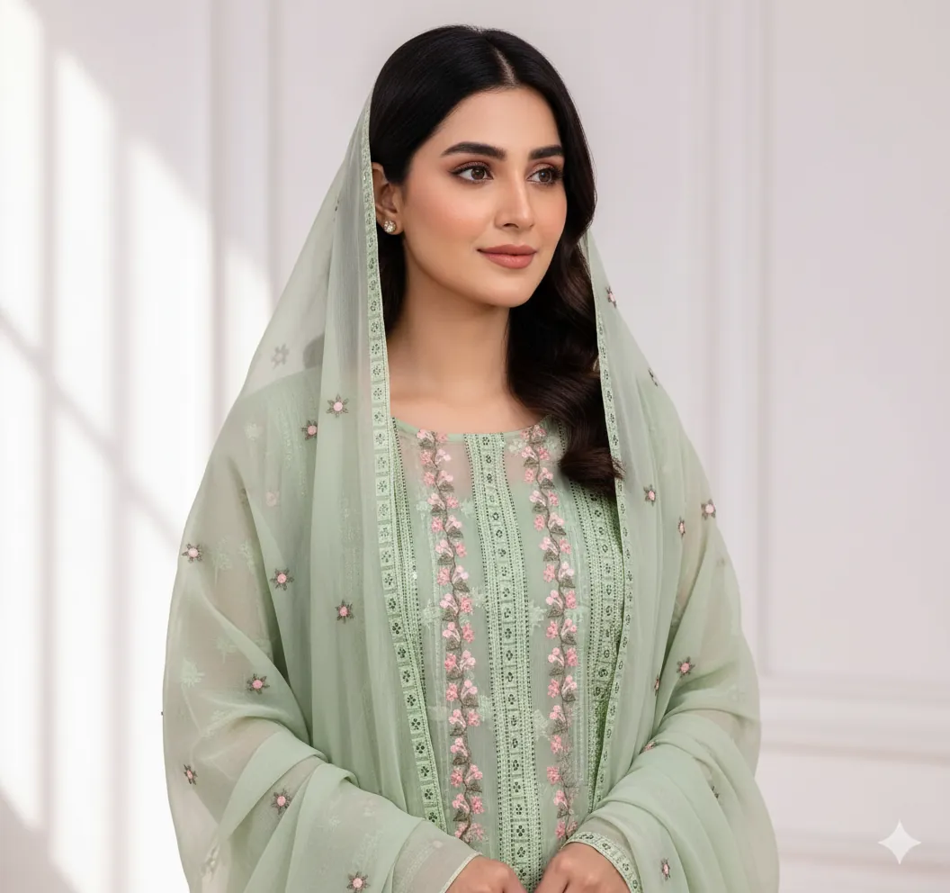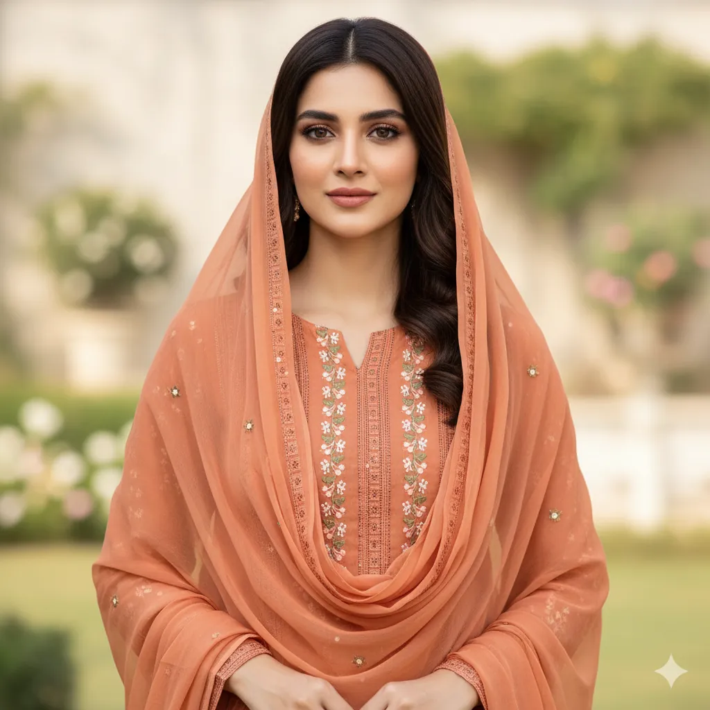 Bareeze Fancy Winter 2025 | Red Embroidered 2-Piece Bamber Chiffon Suit.Introducing a new arrival from the Bareeze Fancy Winter 2025 Collection. This 2-piece suit is made from high-quality Bamber Chiffon and features a heavily embroidered front and a fancy embroidered dupatta. Make a striking statement with this elegant and fancy suit from the Bareeze Winter 2025 Collection. Crafted from guaranteed high-quality Bamber Chiffon fabric, this two-piece set offers both style and comfort. The shirt is adorned with heavy embroidery on the front, complemented by delicate embroidery on the back and sleeves. The ensemble is completed with a beautifully embroidered and fancy dupatta. This unstitched suit provides 2.5 meters of shirt fabric and 2.5 meters of dupatta fabric, allowing you to get the perfect fit.