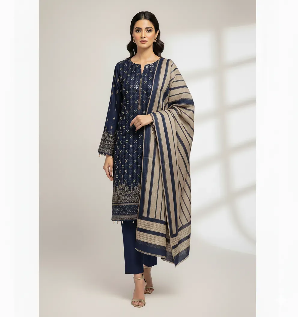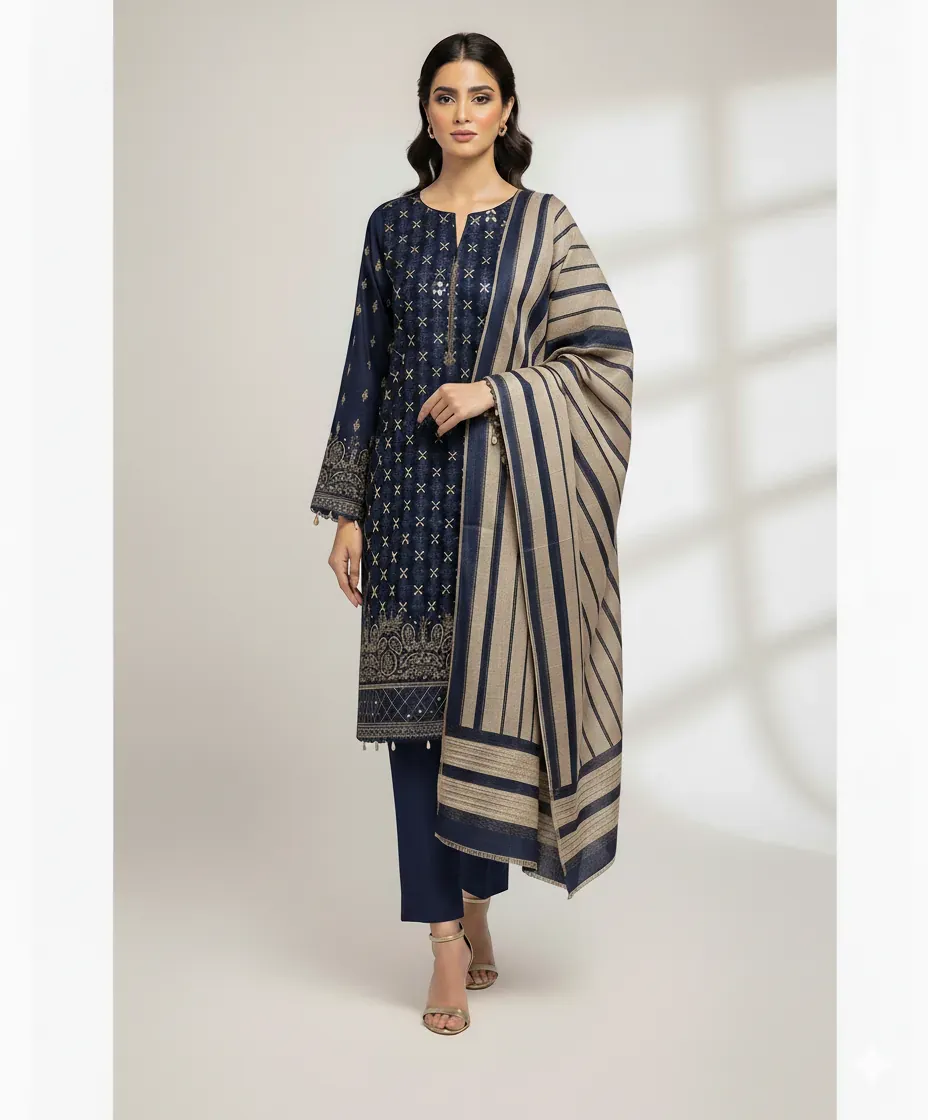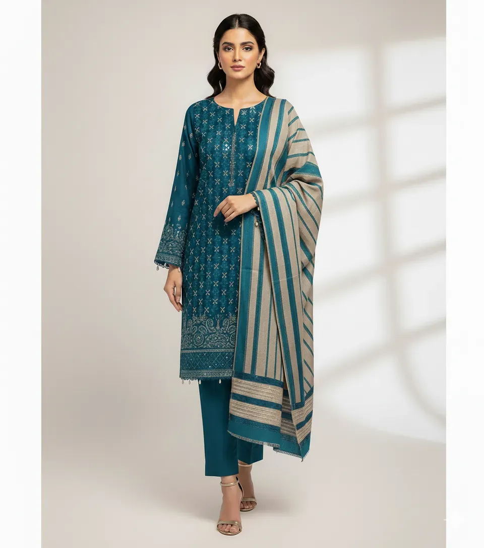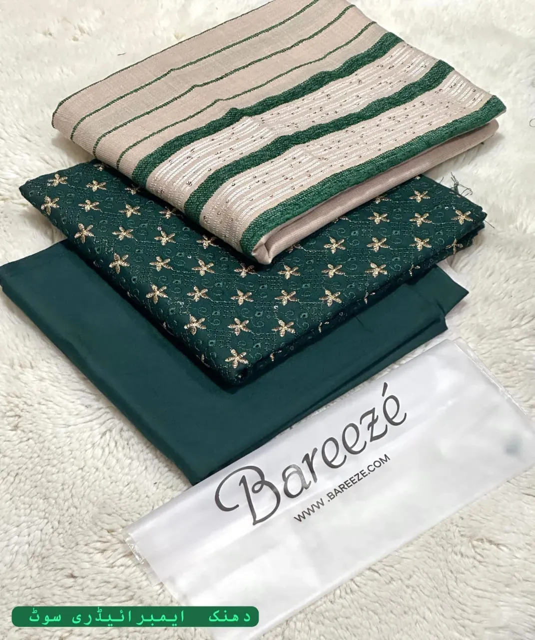 Introducing the Bareezé Original Dhanak Embroidered Suit, a stunning and elegant addition to your wardrobe. This exquisite three-piece ensemble includes a beautifully embroidered Dhanak shirt, a matching dyed Dhanak trouser, and intricate embroidered shirt patches for added detail. The fabric is a high-quality Dhanak, known for its soft texture and warmth, making it perfect for the winter season. Each suit is a testament to Bareezé's commitment to quality, with a 100% guarantee on the fabric and embroidery. The collection is available in a variety of vibrant colors, ensuring a perfect choice for any occasion.