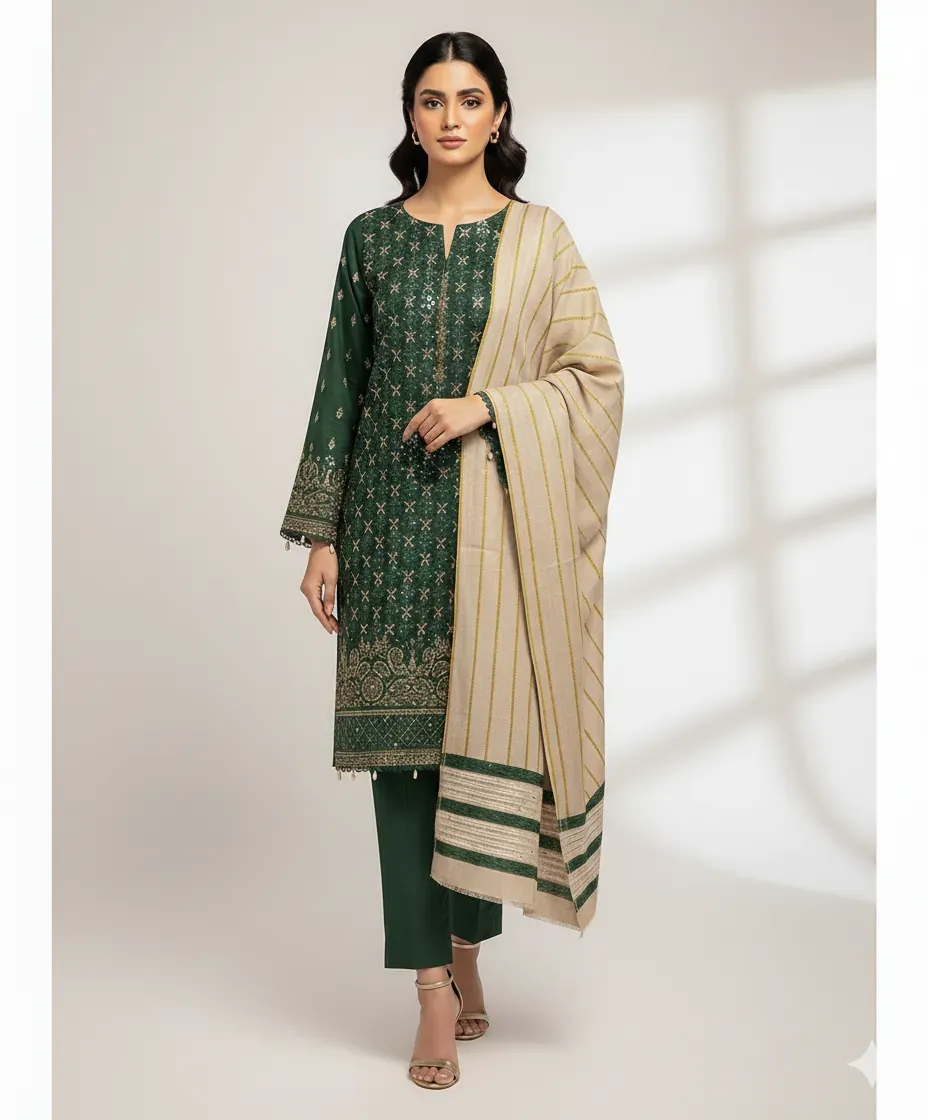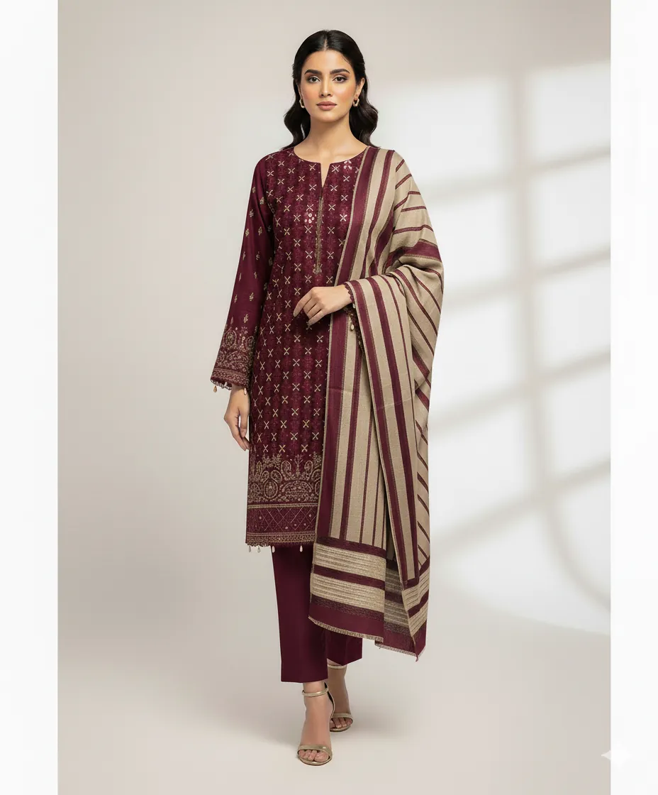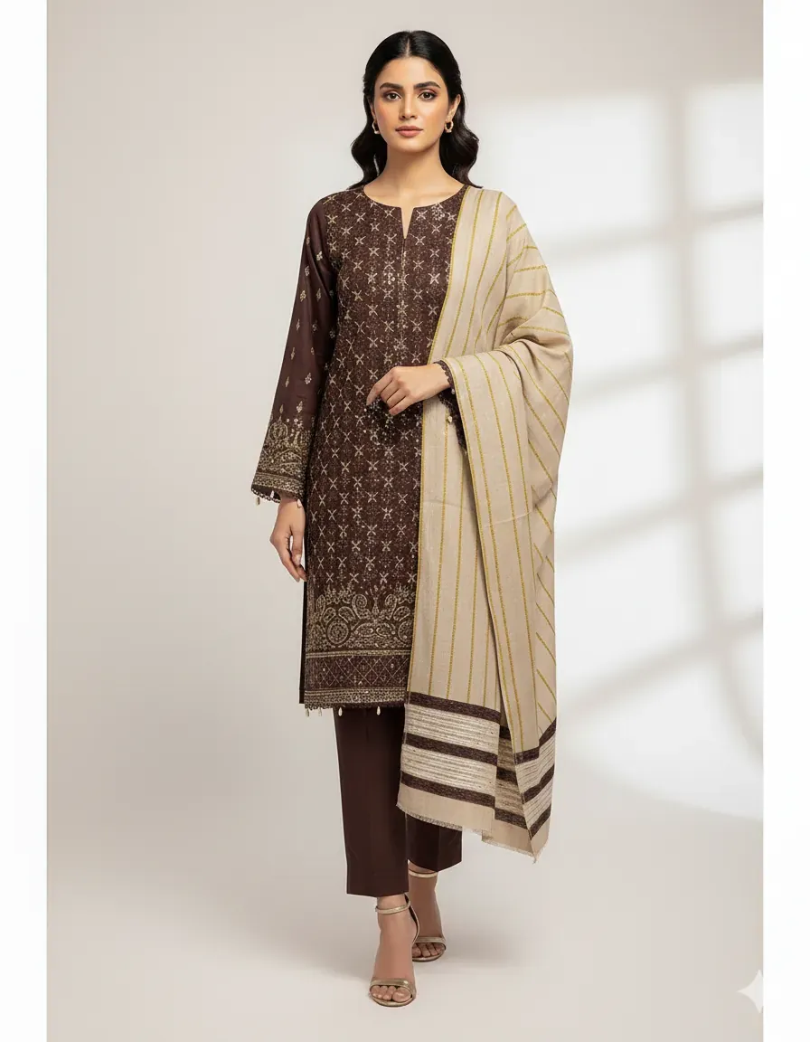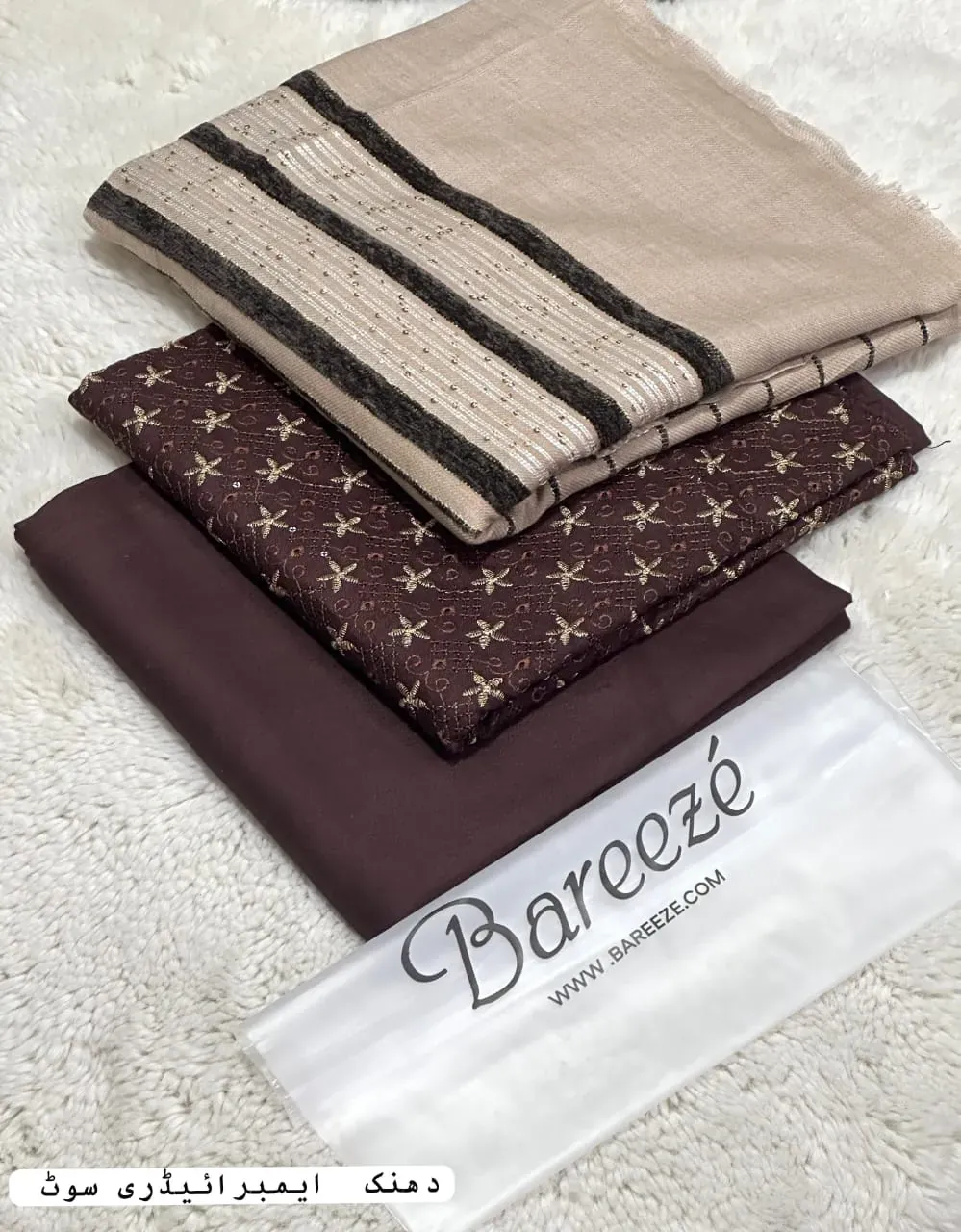 Bareezé Original Dhanak Embroidered Suit Collection with Shirt, Trouser, and Patchwork - Premium Winter Fabric