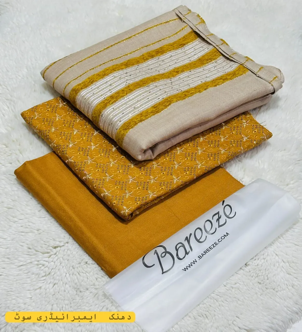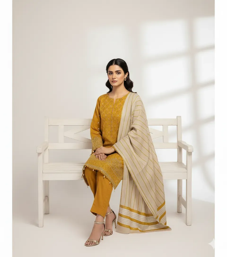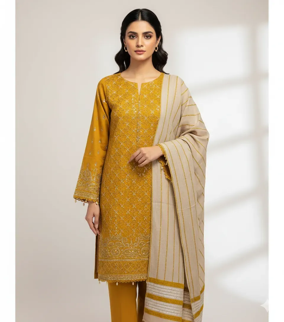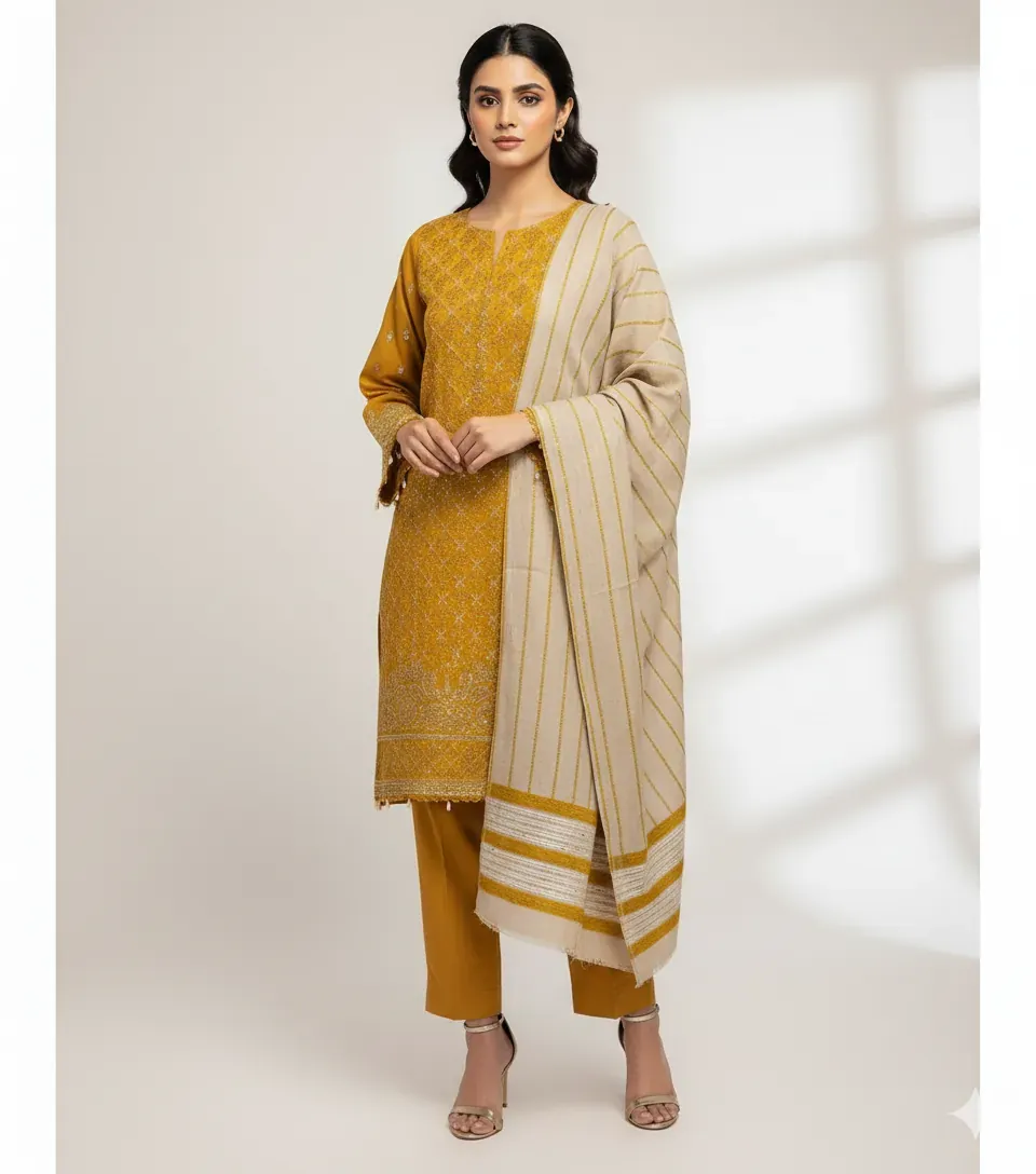 Experience the warmth and elegance of the Bareeze Original Dhanak winter suit. This high-quality 3-piece set is crafted from luxurious Dhanak fabric, ensuring a comfortable and cozy feel. The set includes a beautifully embroidered Dhanak shirt, complete with intricate patches, a dyed Dhanak trouser, and a matching dupatta. The suit comes in a stunning mustard color with sophisticated golden embroidery and thread work, as shown in the image. With a 100% guarantee on the fabric and stuff, this Bareeze Original suit is a perfect addition to your winter wardrobe, offering both style and durability.
