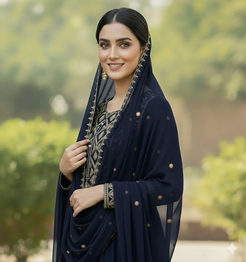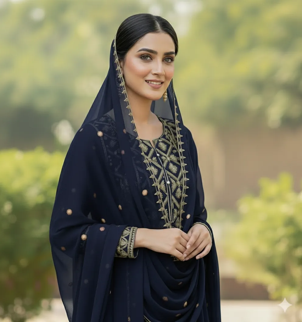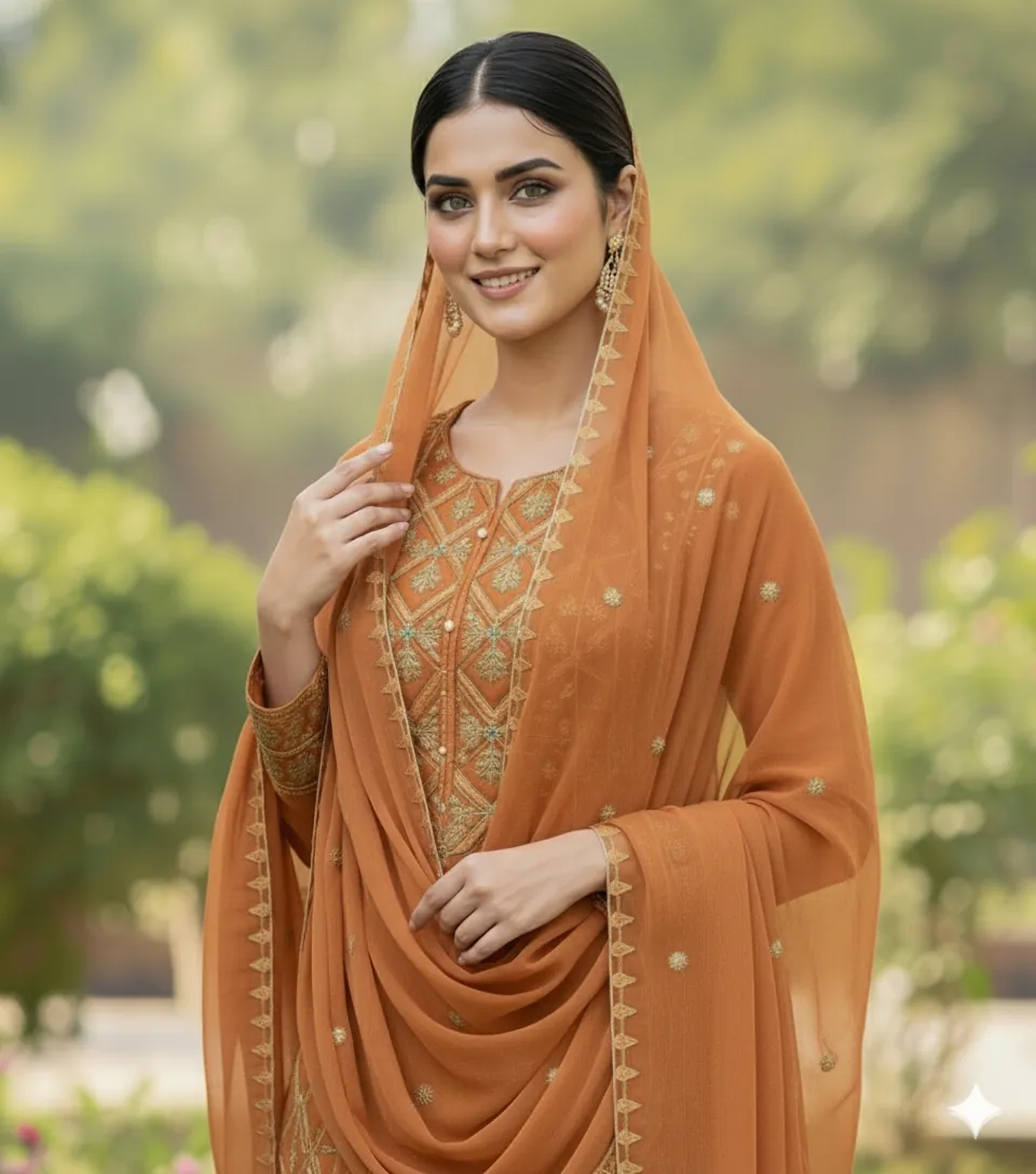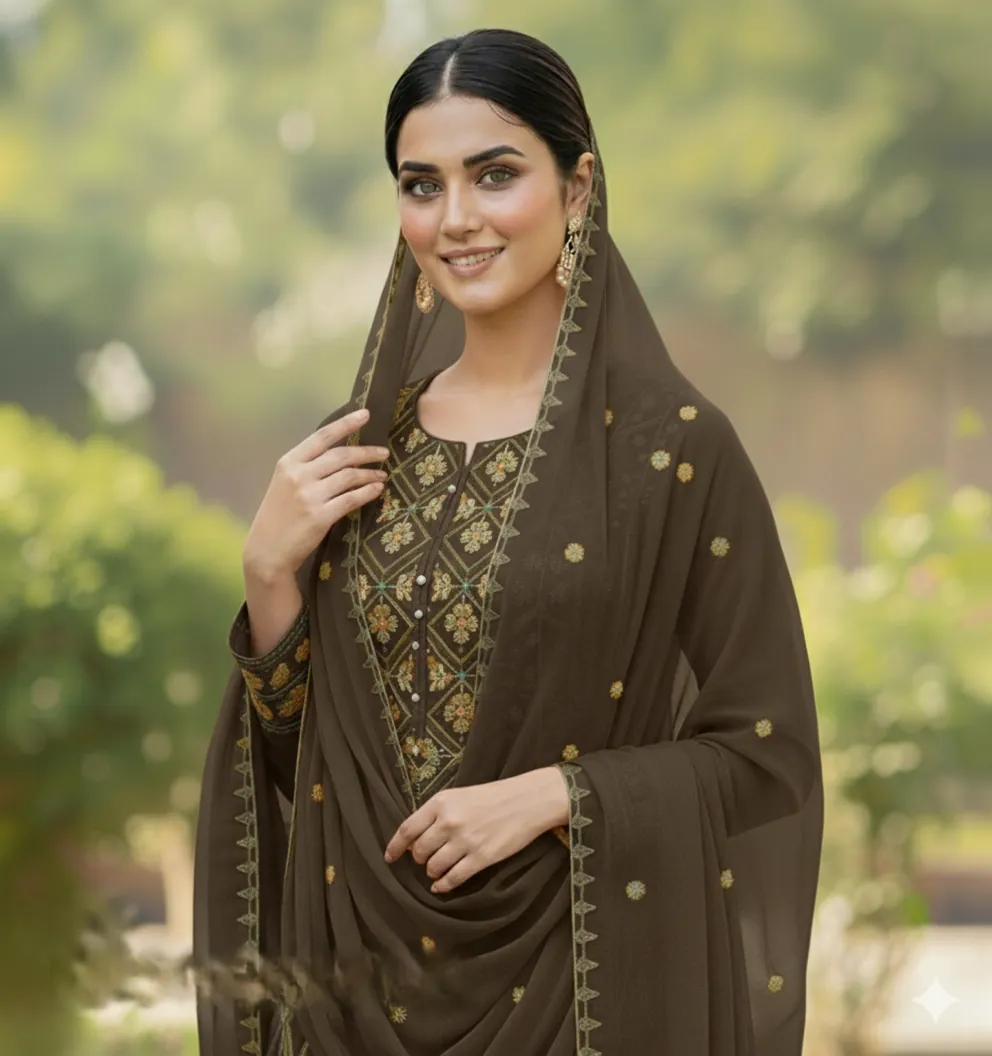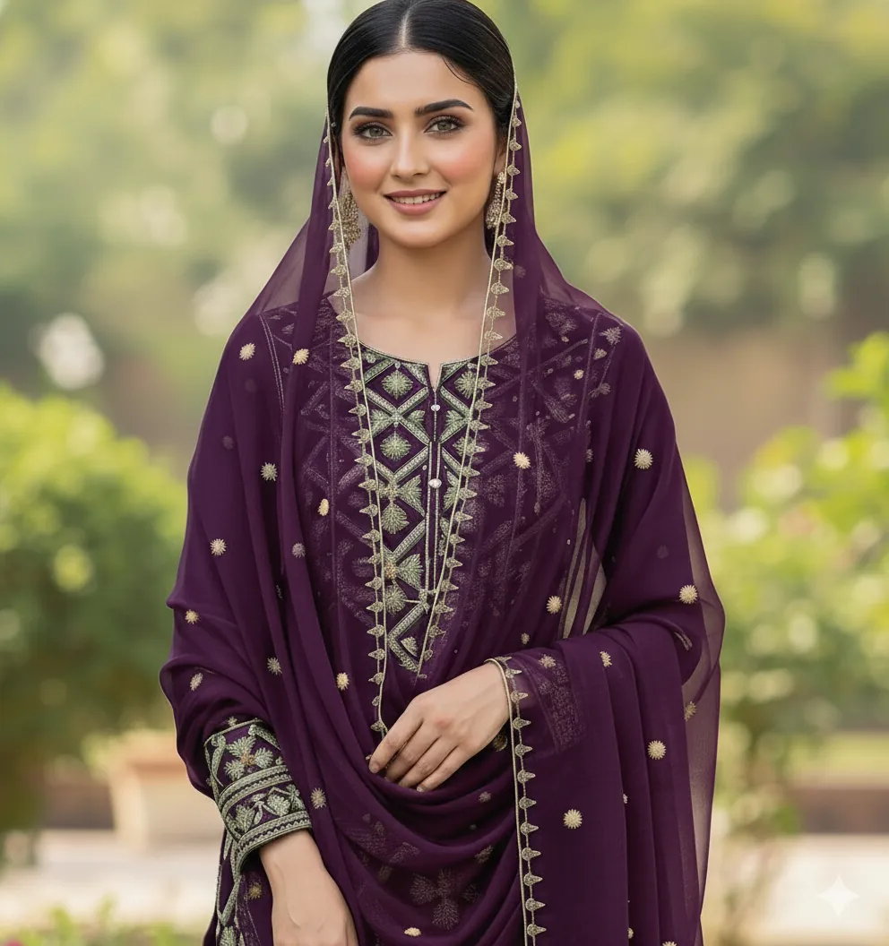 The shirt boasts heavy, detailed embroidery on the front, with delicate matching work on the back and sleeves. The look is completed with a stunning, generously embroidered dupatta, adding an extra touch of glamour. With 2.5 meters of fabric for both the shirt and the dupatta, this suit provides the perfect canvas for your unique style.