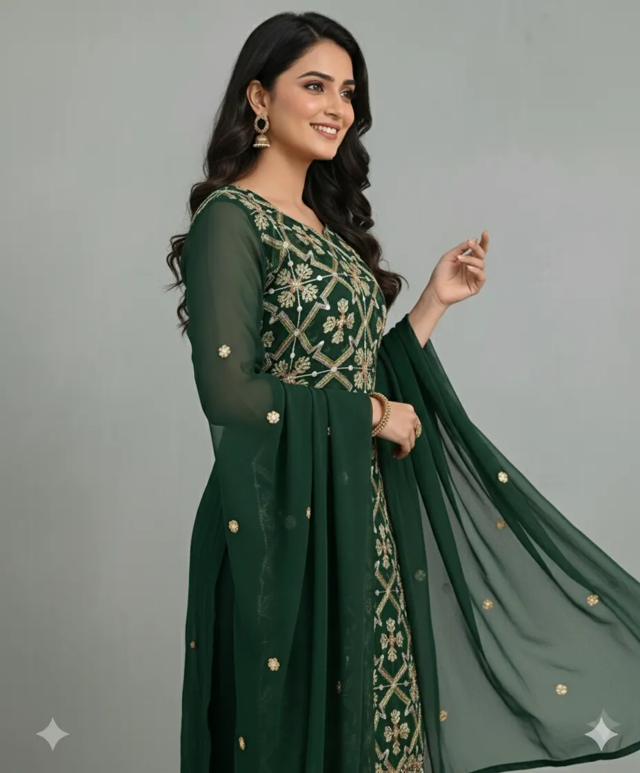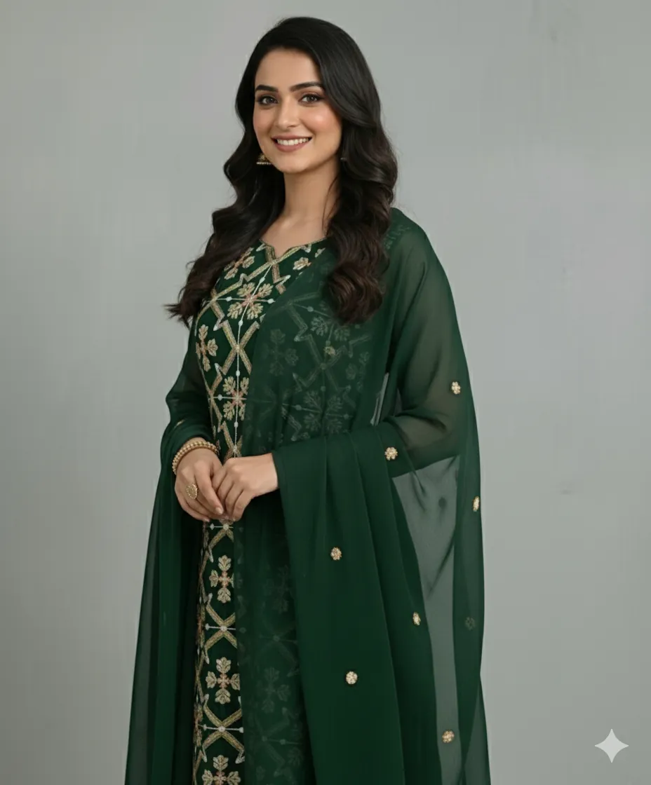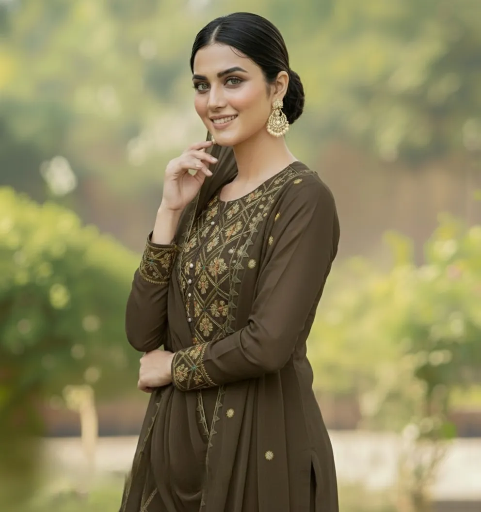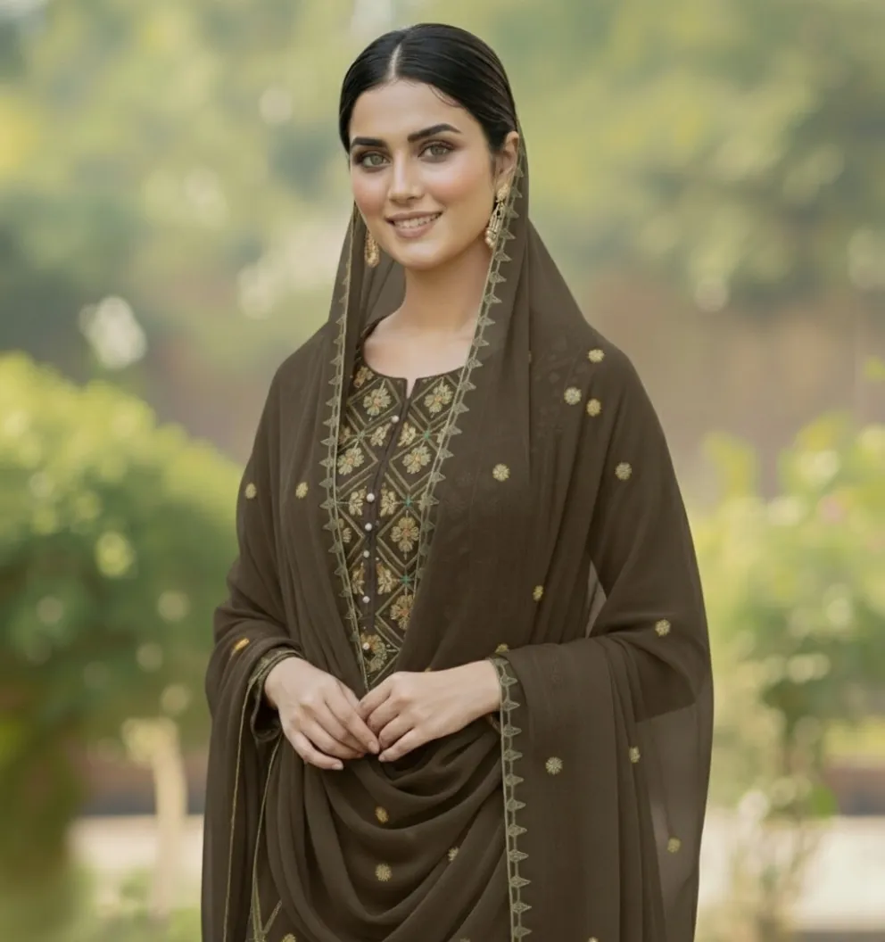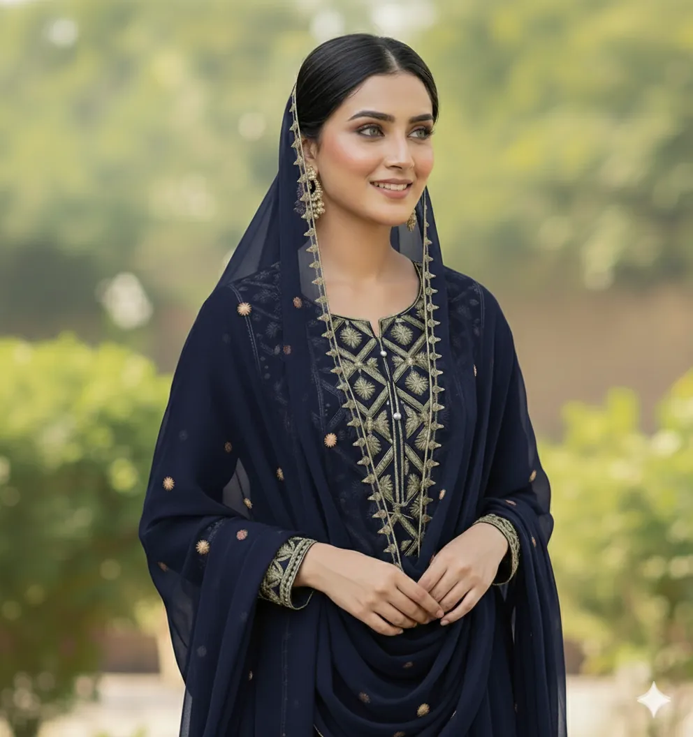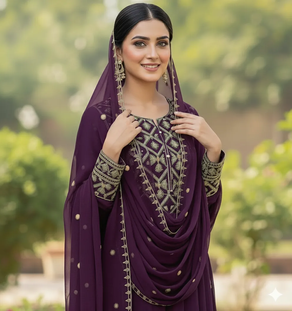 The shirt boasts heavy, detailed embroidery on the front, with delicate matching work on the back and sleeves. The look is completed with a stunning, generously embroidered dupatta, adding an extra touch of glamour. With 2.5 meters of fabric for both the shirt and the dupatta, this suit provides the perfect canvas for your unique style.