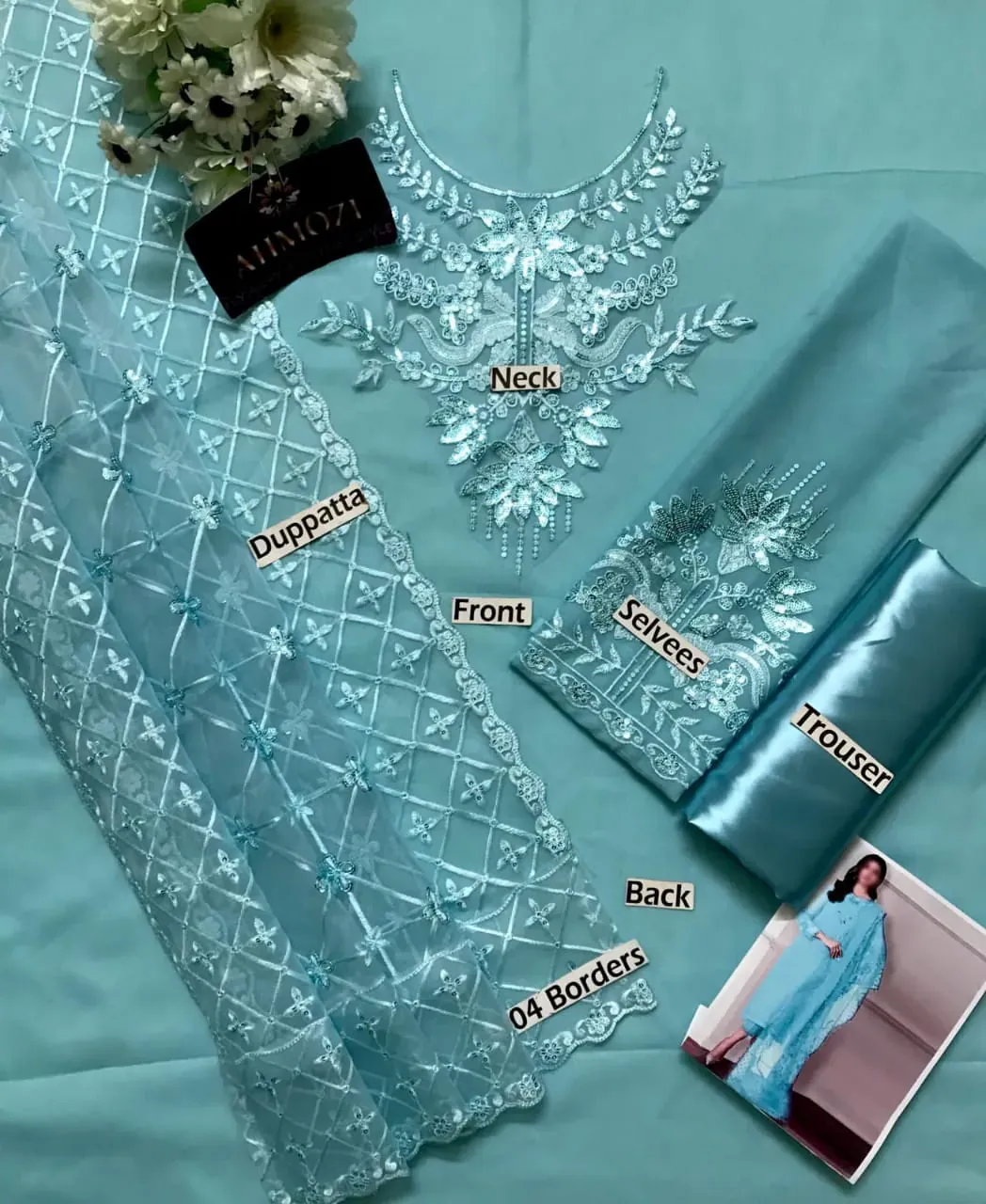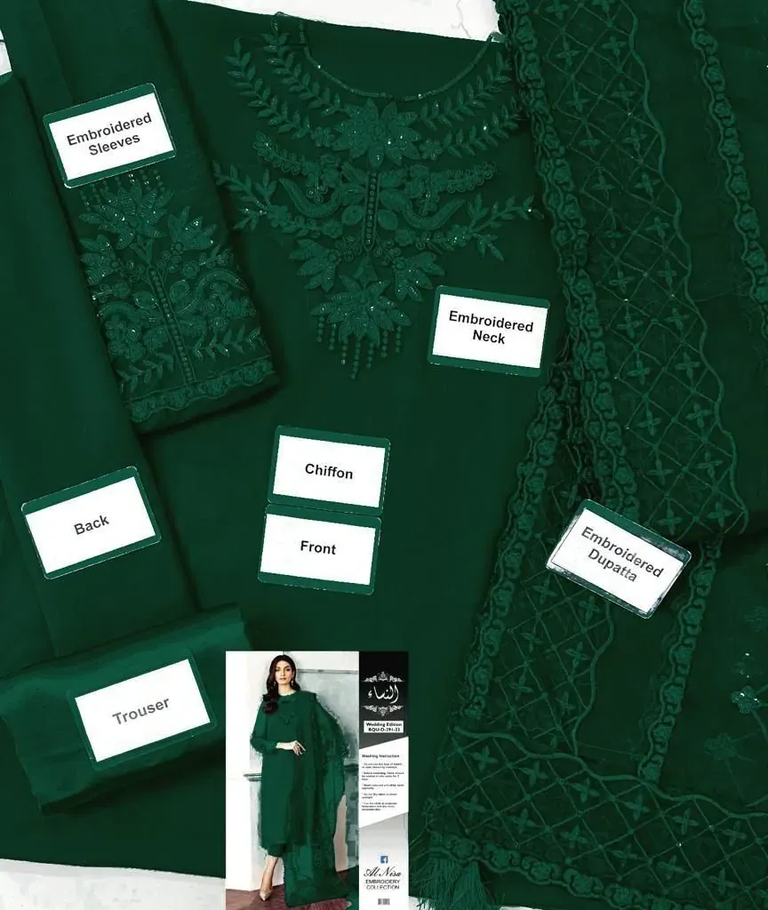 The outfit features a plain chiffon front and back with a delicately sequins-embroidered neck patch, and embroidered chiffon sleeves that add a refined touch. The heavy embroidered organza dupatta is beautifully enhanced with hanging tussles, creating a luxurious, graceful drape. A dyed malai inner provides a smooth base, while the satin silk trouser ensures a flawless finish for any celebration.