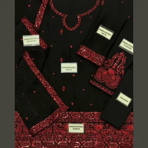 The BAROQUE chiffon embroidered and sequence 3-piece dress is a timeless ensemble crafted for refined elegance. The chiffon front is beautifully embroidered, complemented with embroidered patches on both the front and back daman. The sleeves add sophistication with delicate chiffon embroidery, while the plain chiffon back balances the design with subtle simplicity.