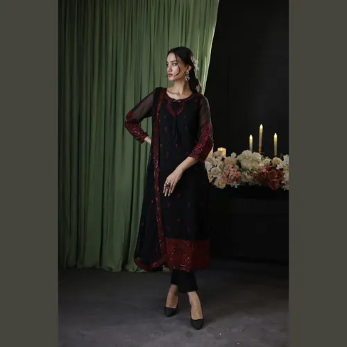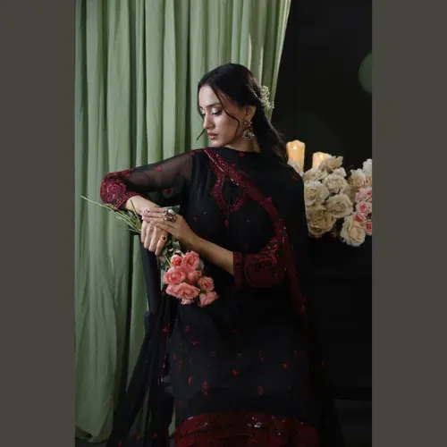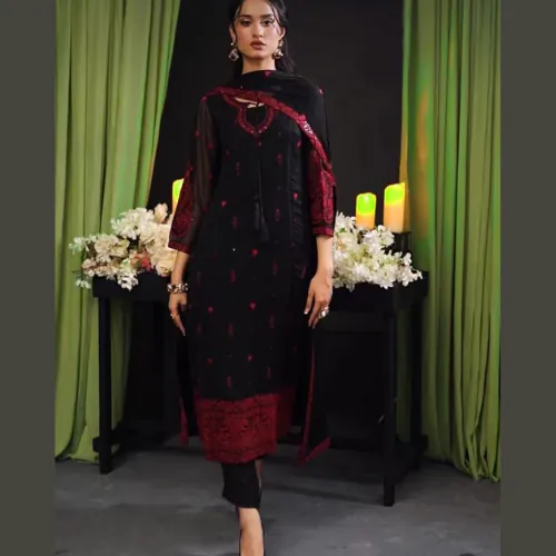 To complete the look, the set includes a malai plain trouser and an exquisite chiffon dupatta featuring embroidery with a graceful 4-side embroidered border. This unstitched suit offers the perfect opportunity to style it to your preference, making it an ideal choice for festive gatherings, formal occasions, or evening wear where elegance is key.