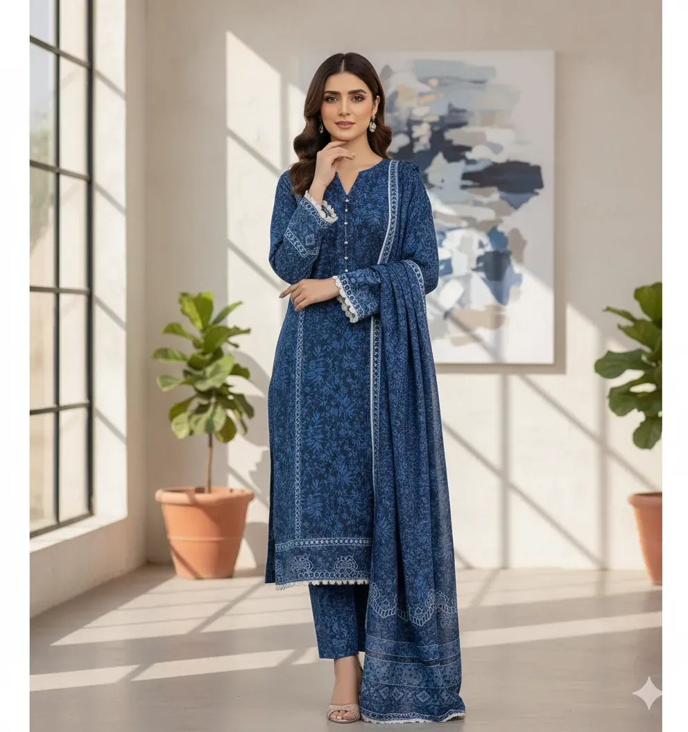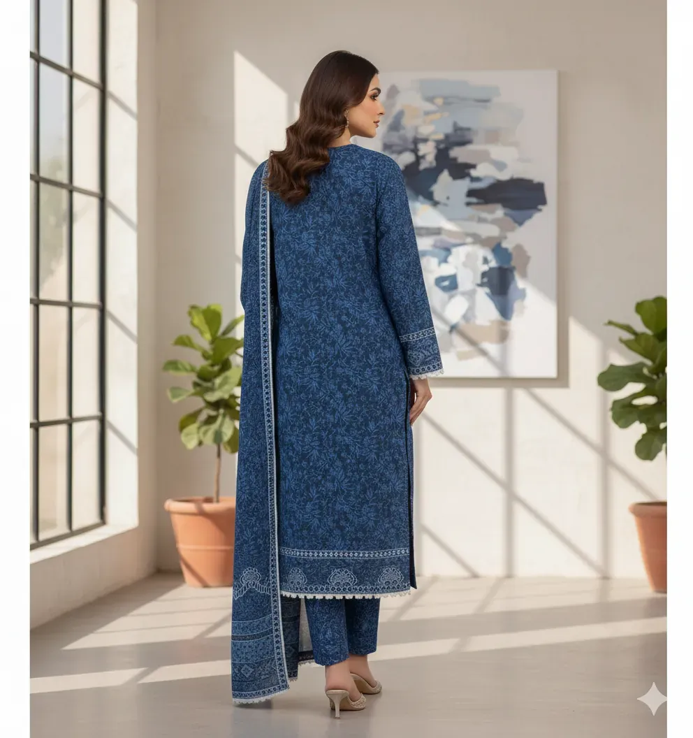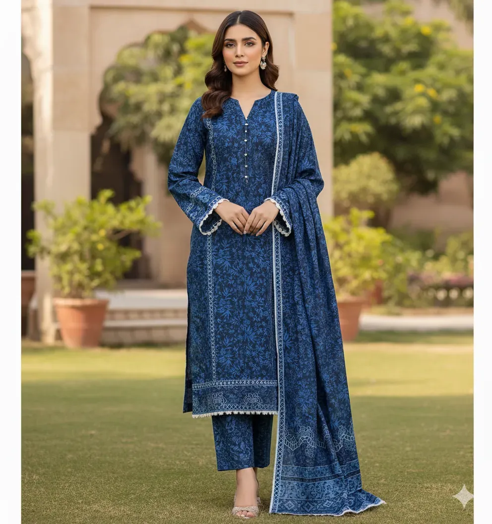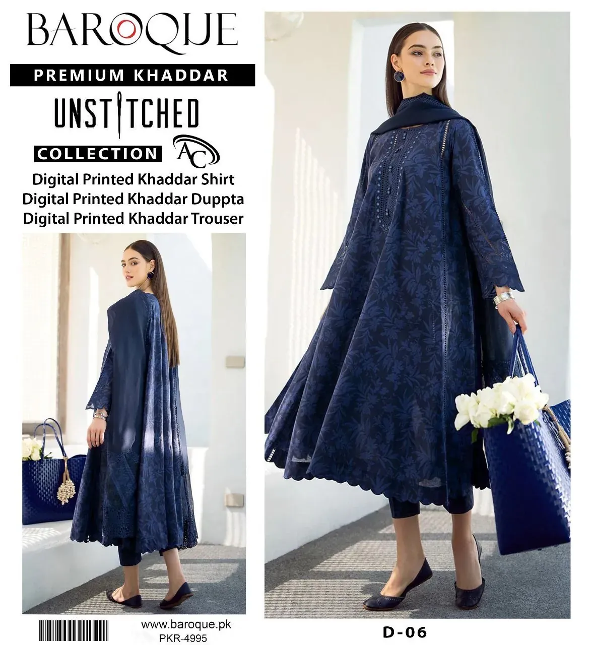 Elevate your winter wardrobe with this stunning Baroque Premium Khaddar Unstitched 3-Piece suit. This unstitched fabric set includes a beautifully digitally printed Khaddar shirt, a coordinating Khaddar dupatta, and a solid Khaddar trouser. The premium quality Khaddar fabric ensures both warmth and comfort, making it an ideal choice for the colder months. Its intricate floral print in shades of blue adds a touch of elegance and sophistication. Design and stitch this suit to your personal style and create a unique outfit that stands out. Perfect for casual wear, office wear, or any daytime event.