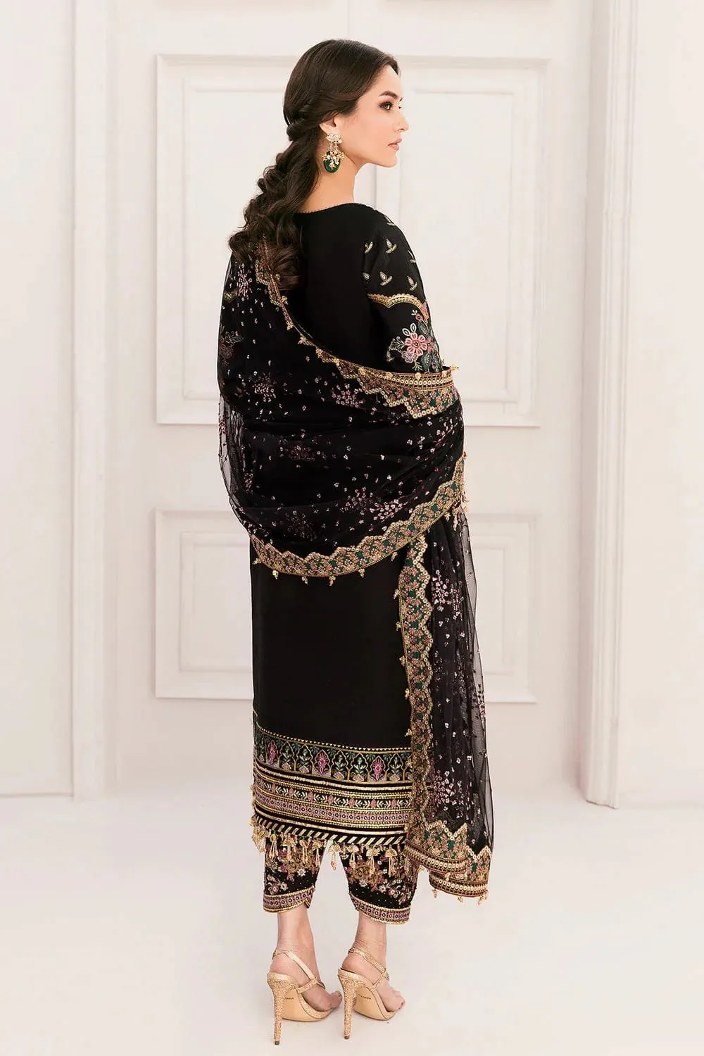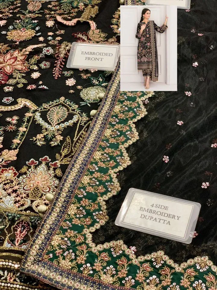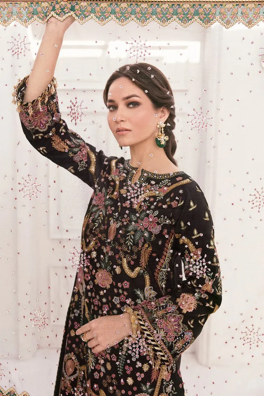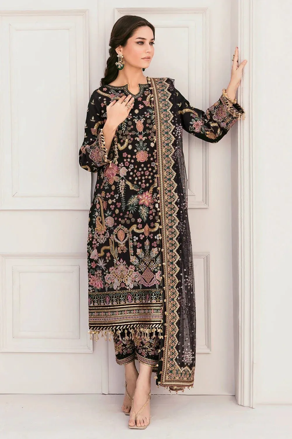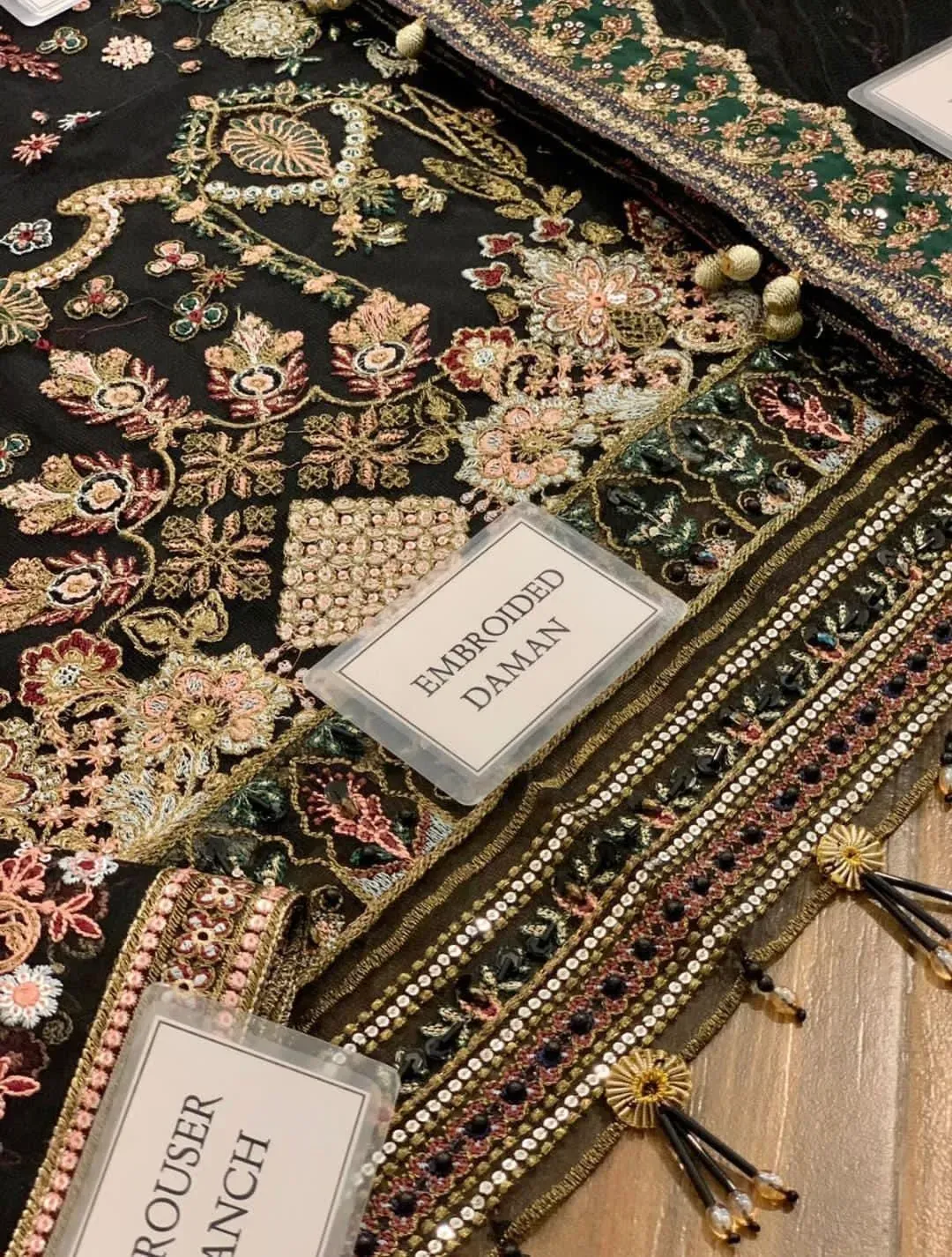 introducing an exclusive article from the Baroque Formal Bridal Collection, designed for customers who demand the highest quality. This stunning black dress is a "King Copy" of the original, with no noticeable difference in the intricate details. The three-piece suit features a luxurious net shirt with a heavily embroidered front and intricately designed sleeves, made without any joints to ensure a perfect fit and fall. The borders of the shirt's daman and sleeves are adorned with heavy embroidery and delicate handmade tassels, adding a graceful sway to every movement.