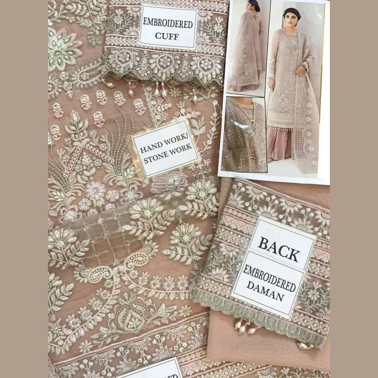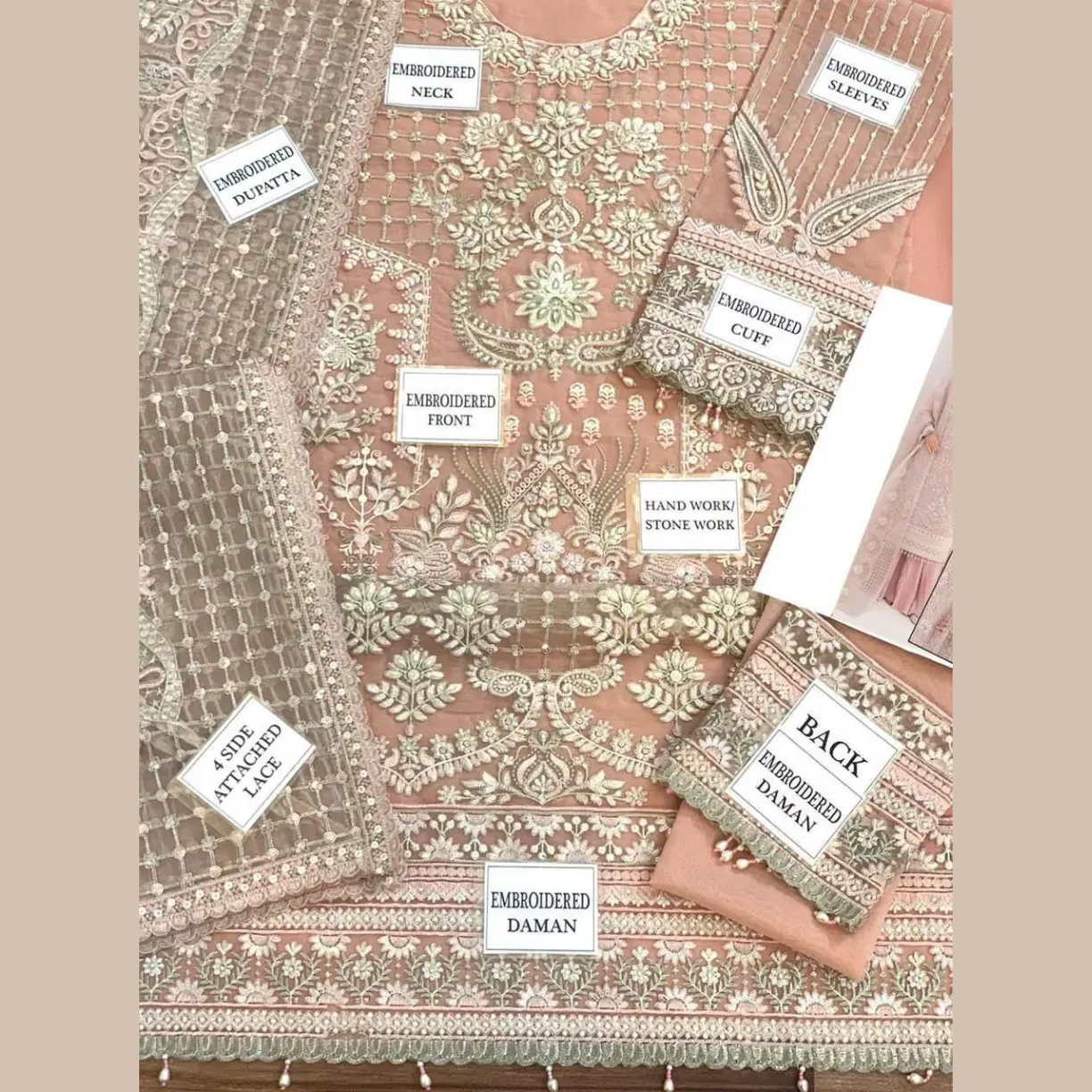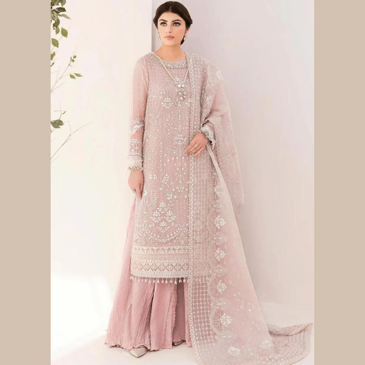 Bring luxury and sophistication to your wardrobe with the Baroque Organza Embroidered & Handwork Unstitched 3pc Suit. Crafted on premium organza, the front is adorned with delicate sequence embroidery, hand embellishments, and attached daman tussels for a statement finish. The plain organza back is styled with embroidered daman and tassel detailing for added grace. Beautifully embroidered sleeves with sequence, fine handwork, and stylish latkans enhance the overall charm.