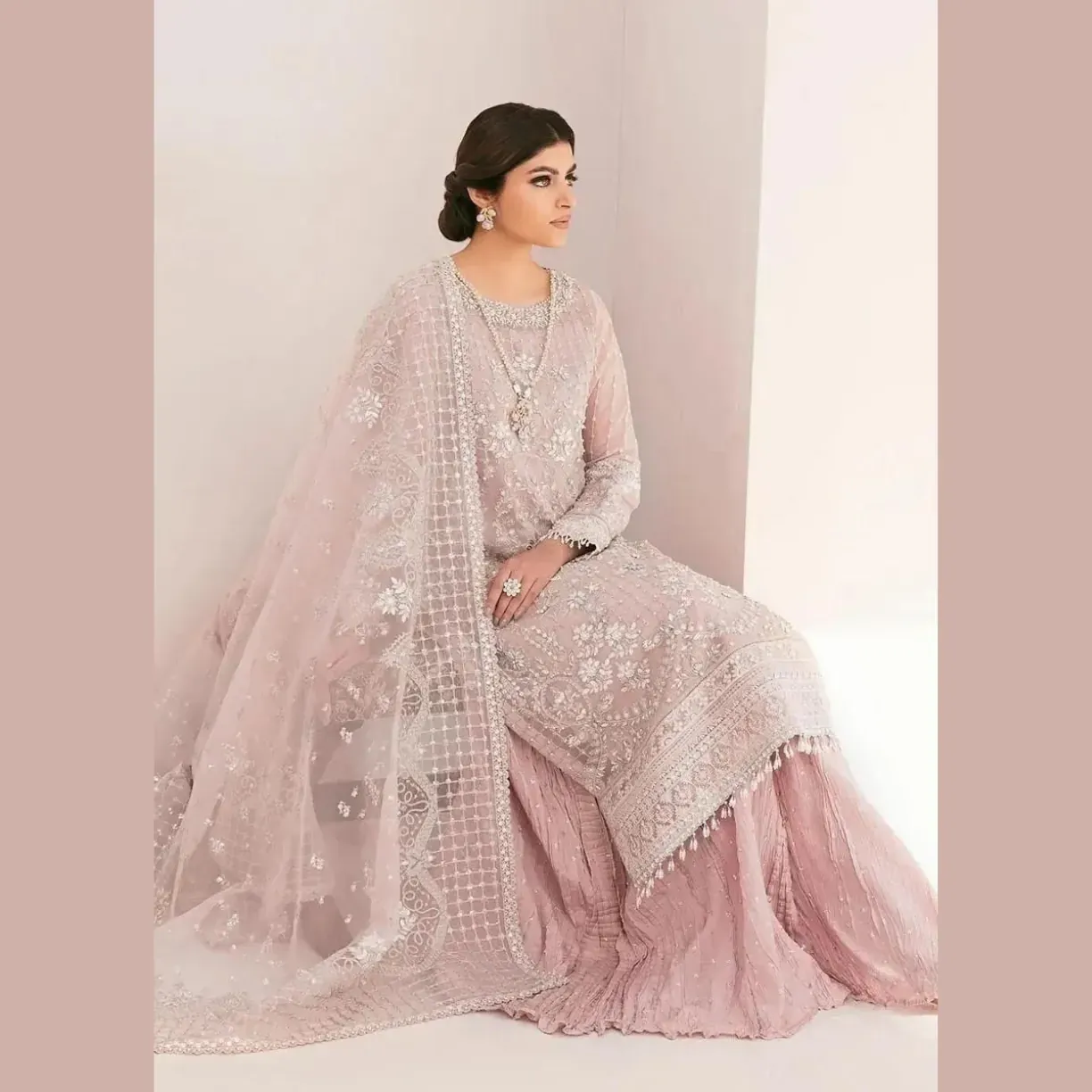 Paired with a plain silk trouser for a smooth and classy contrast, this outfit comes with a ready-to-wear embroidered sequence dupatta that completes the luxury look. Perfect for festive wear, weddings, and formal occasions, this Baroque creation is the definition of elegance and timeless fashion.