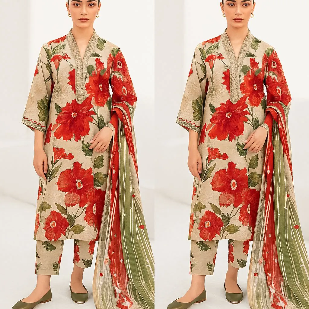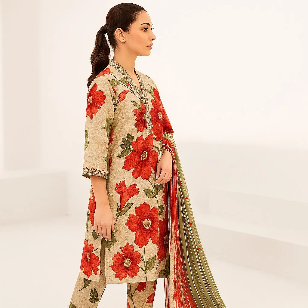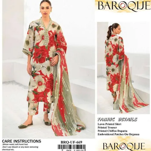 Baroque Original Unstitched 3-Piece Linen Suit - Printed Shirt & Trouser with Red & Green Printed Linen Dupatta. This is a beautiful 3-piece unstitched linen suit from the Baroque collection. The set features a printed shirt and trouser with a bold red and green printed dupatta.This is an elegant and artistic unstitched 3-piece linen suit from the Baroque collection. The ensemble features a sophisticated color palette and contrasting patterns that create a striking visual appeal. The shirt and trouser fabric has a beautiful, natural base with an all-over floral print in shades of muted red, white, and olive green. The accompanying dupatta is a bold and eye-catching piece, featuring a mix of horizontal red stripes and a scattered white polka dot pattern on an olive green background. This blend of classic floral design with a modern, geometric dupatta print offers a versatile and fashion-forward look. The unstitched fabric allows for custom tailoring, ensuring a perfect fit and personalized style.