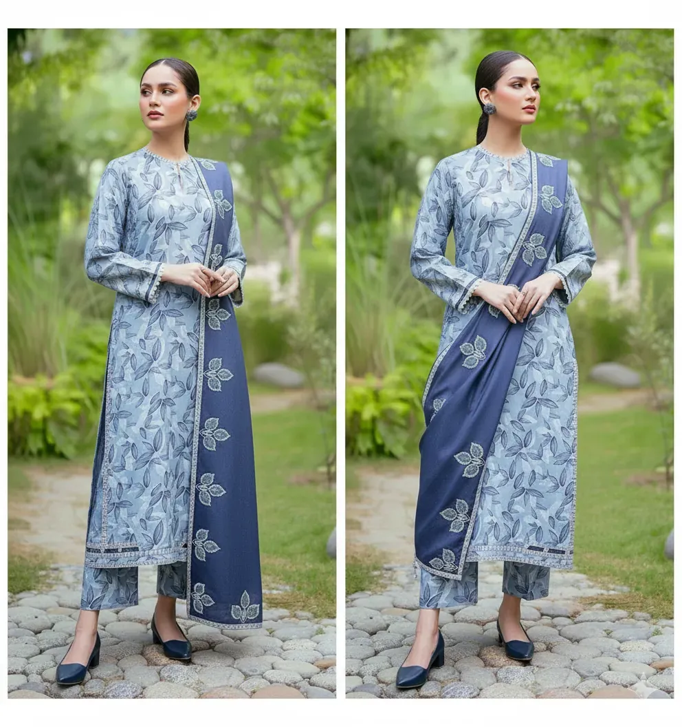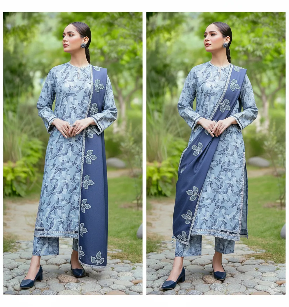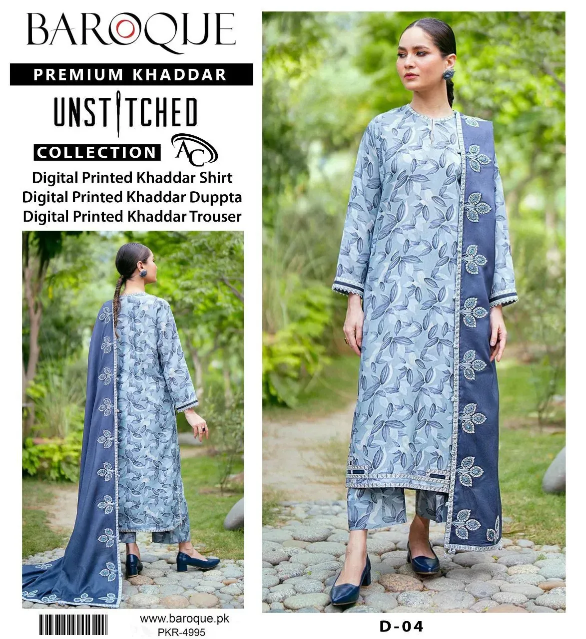 Step into style and comfort with the BAROQUE Premium Khaddar 3-piece unstitched suit, an exquisite offering from their latest winter collection. This ensemble is meticulously crafted from high-quality khaddar fabric, ensuring warmth and durability during colder months. The captivating design showcases a harmonious blend of deep and light blue tones, adorned with modern digital prints that include intricate leaf motifs and geometric patterns. As an unstitched suit, it provides the flexibility to be tailored to your precise measurements and preferred style. The set includes a digitally printed shirt piece, a coordinating trouser piece, and a matching khaddar dupatta, making it a complete and versatile outfit perfect for both daily wear and special occasions.