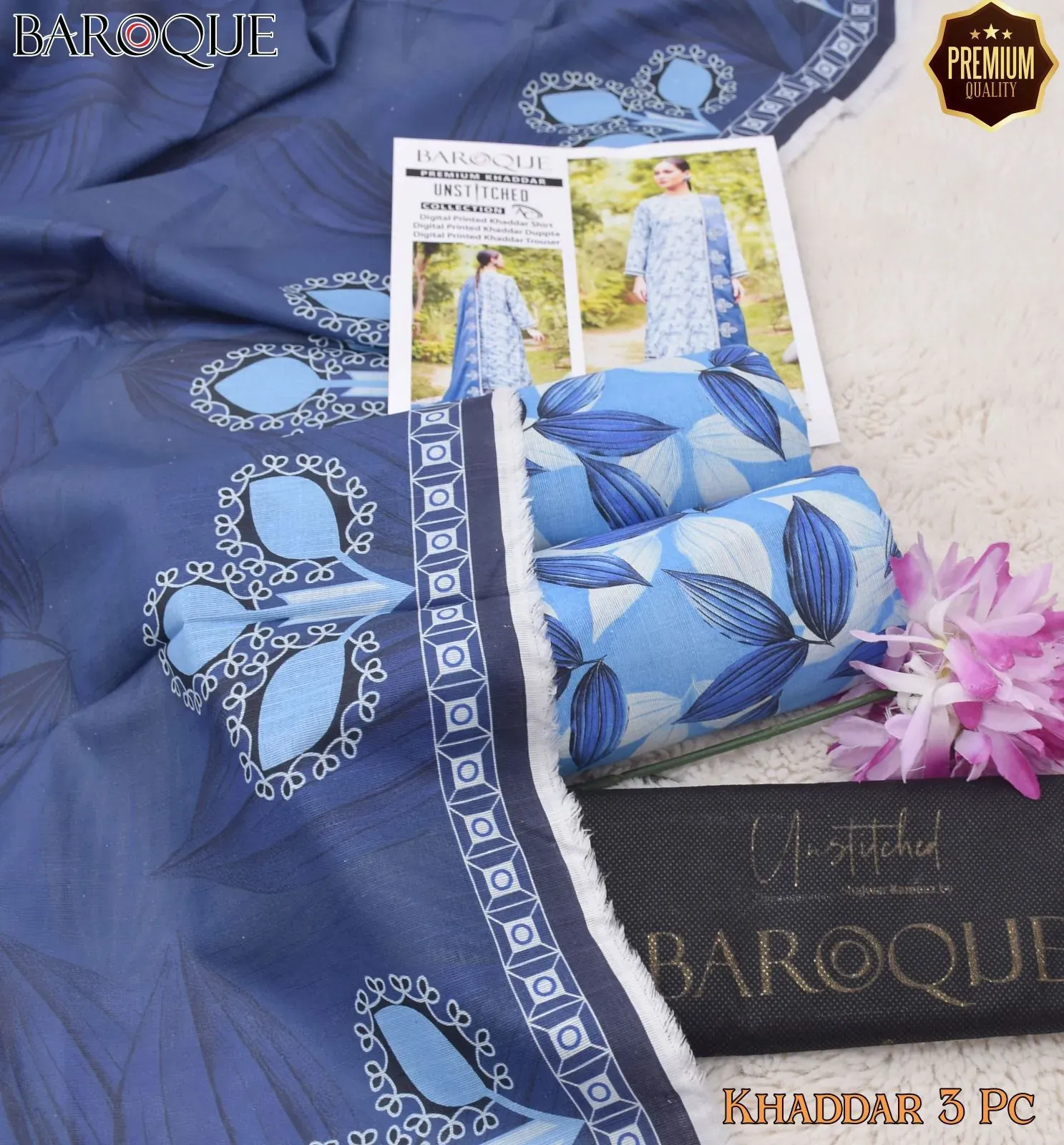 BAROQUE Premium Khaddar 3-Piece Unstitched Digital Printed Suit – Blue Winter Collection with Modern Motifs