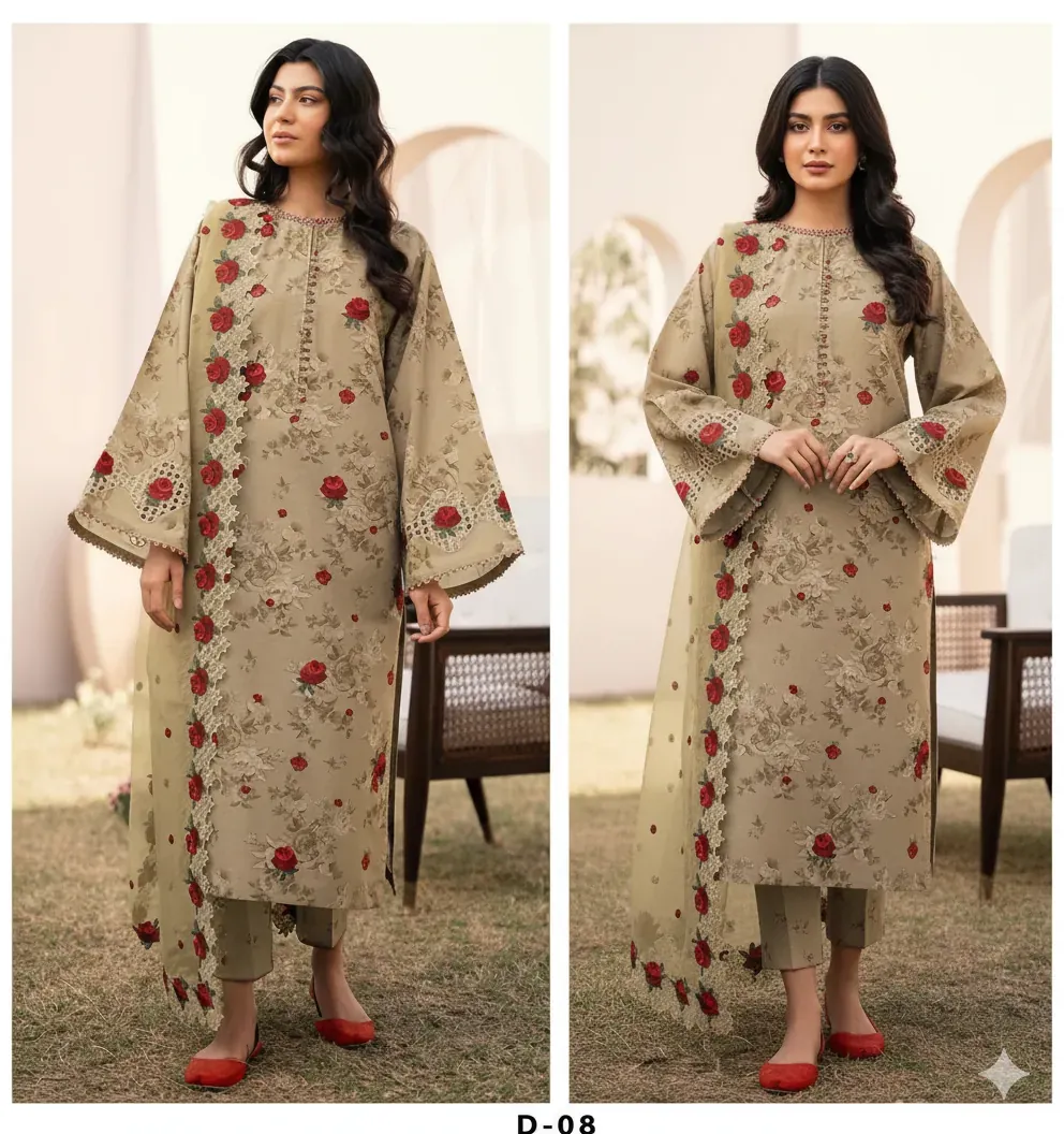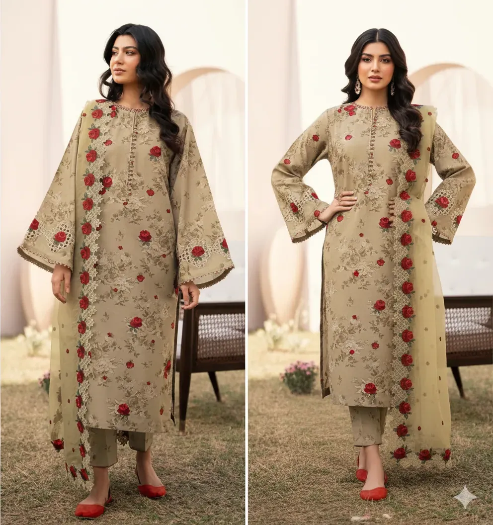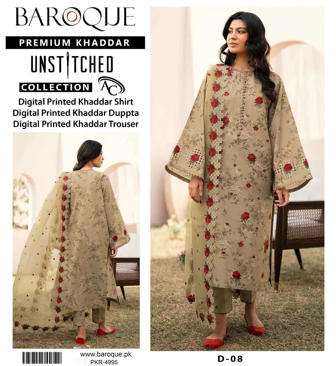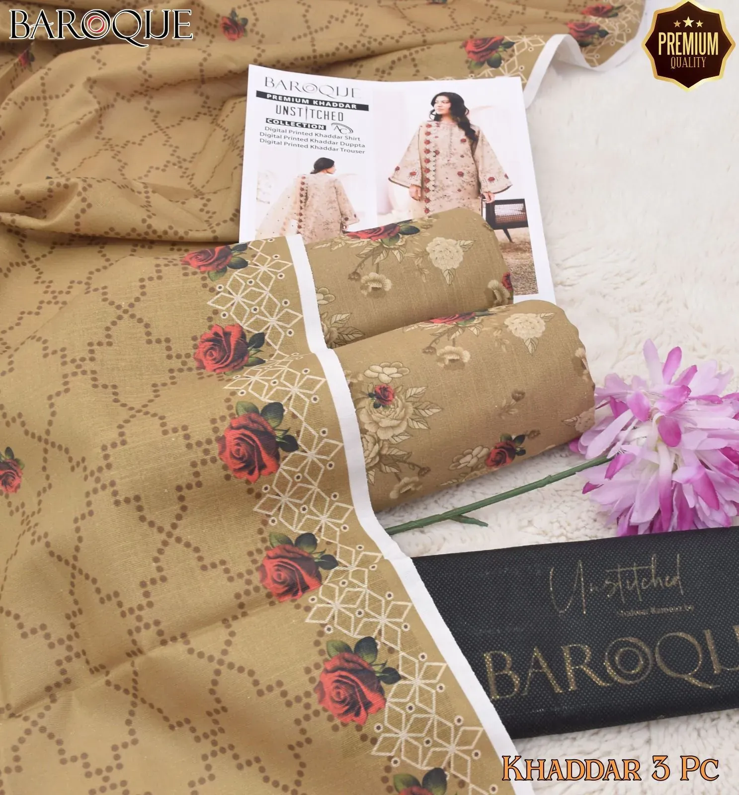 Discover timeless style and comfort with the Baroque Premium Khaddar Unstitched 3-Piece Suit. This exquisite collection features high-quality digital printed khaddar fabric, offering a luxurious feel and a stunning visual appeal. The set includes a beautifully printed khaddar shirt, a matching digital printed khaddar dupatta, and a coordinated khaddar trouser, allowing you to tailor it to your perfect fit and style. The elegant floral patterns and warm, earthy tones make this suit ideal for both casual outings and semi-formal gatherings. Experience the blend of traditional craftsmanship and contemporary design with Baroque's latest Khaddar collection, ensuring you stand out with grace and sophistication.
