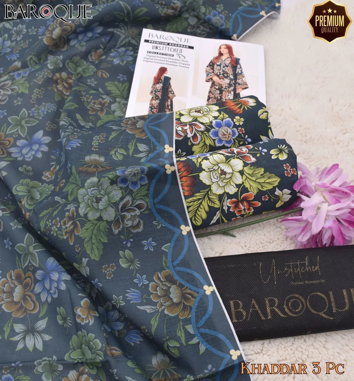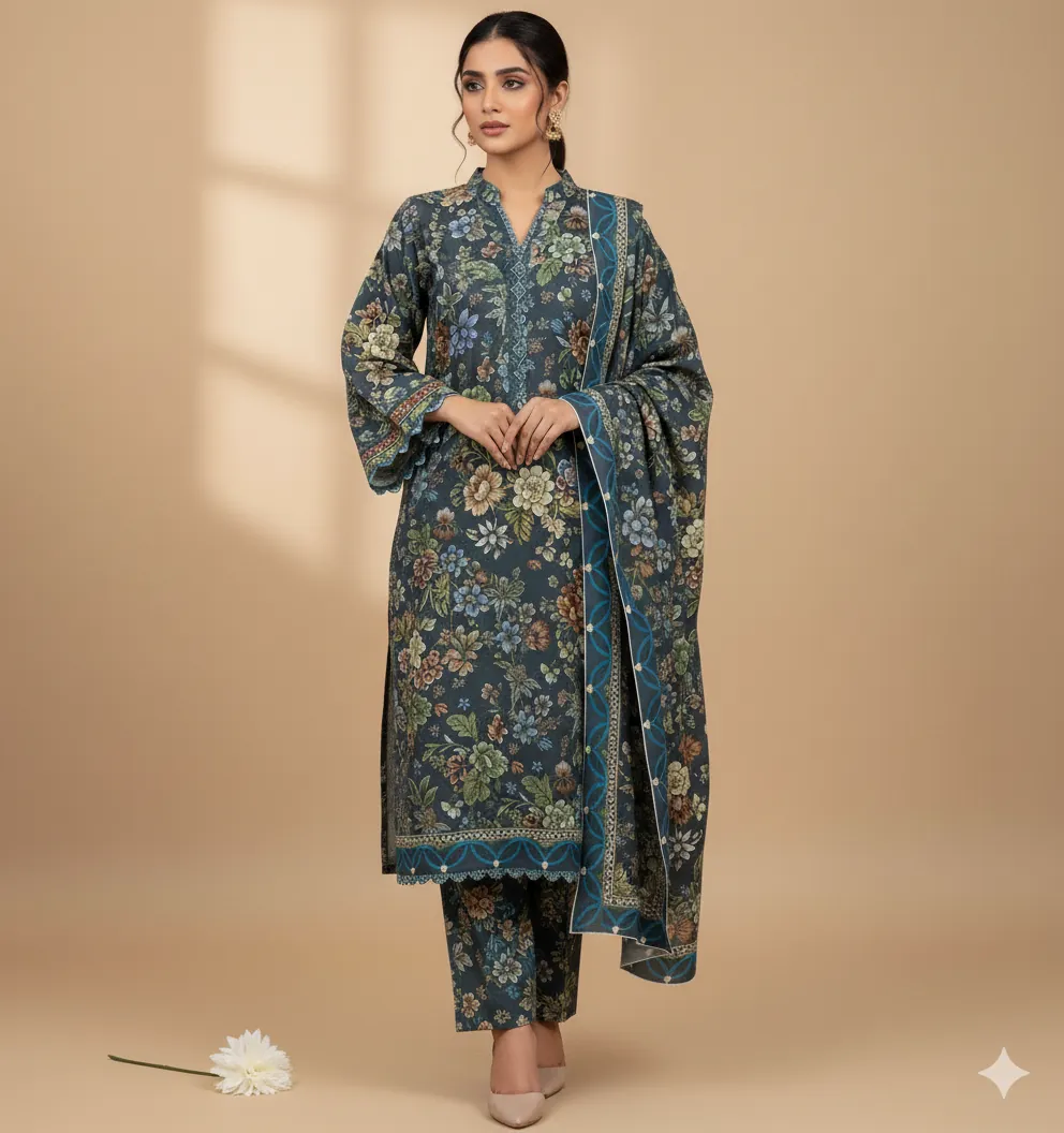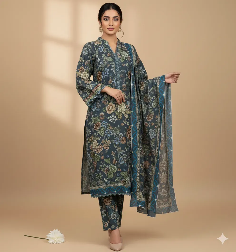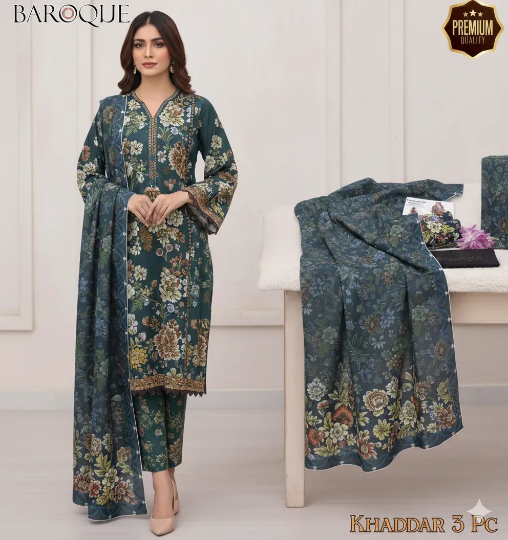 Baroque Premium Unstitched Khaddar 3-Piece Suit: Digital Printed Shirt & Dupatta for Winter