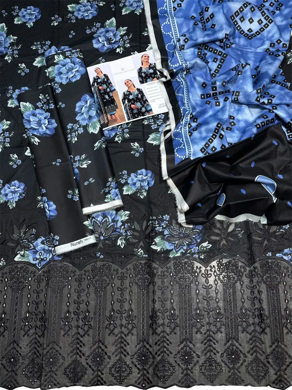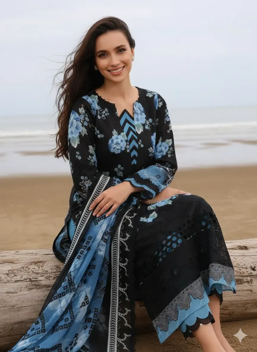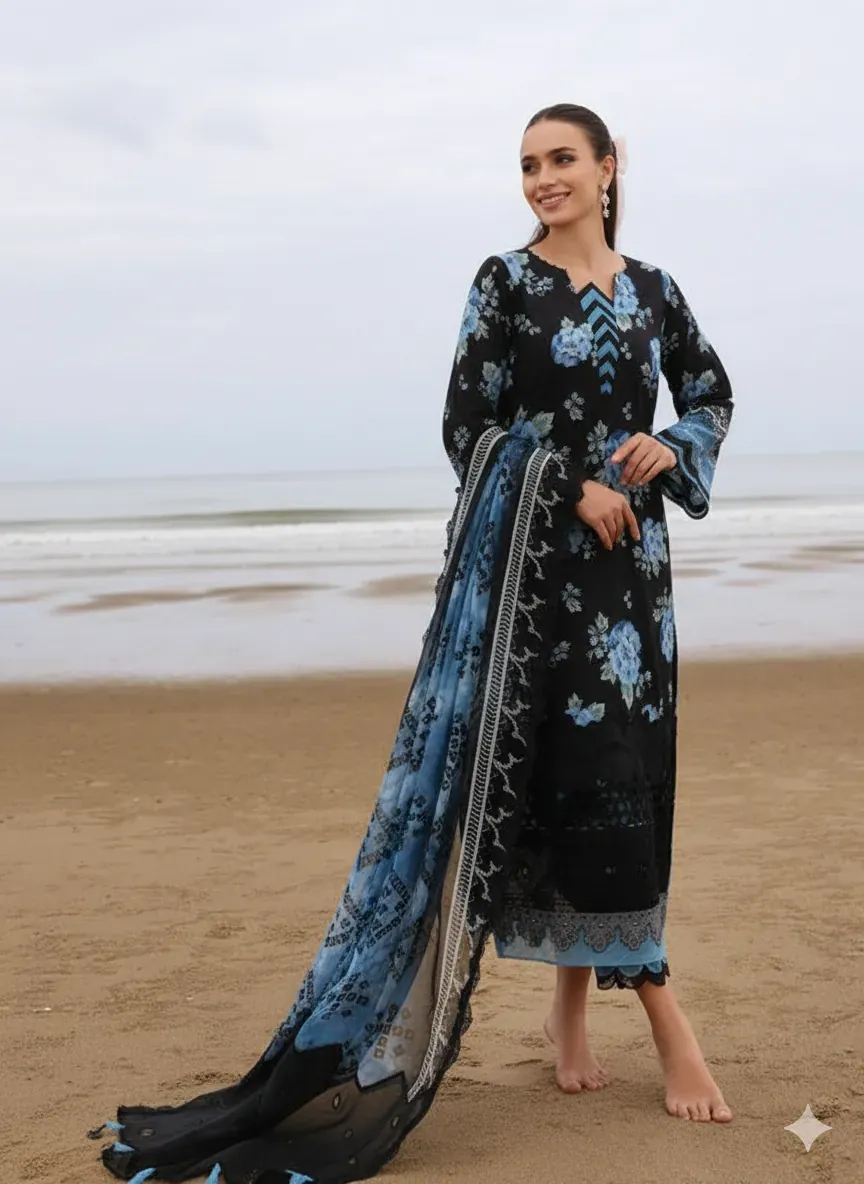 BAROQUE Winter 2025 Linen 3-Piece Suit | Digital Printed Black & Blue with Embroidered Cutwork Daman