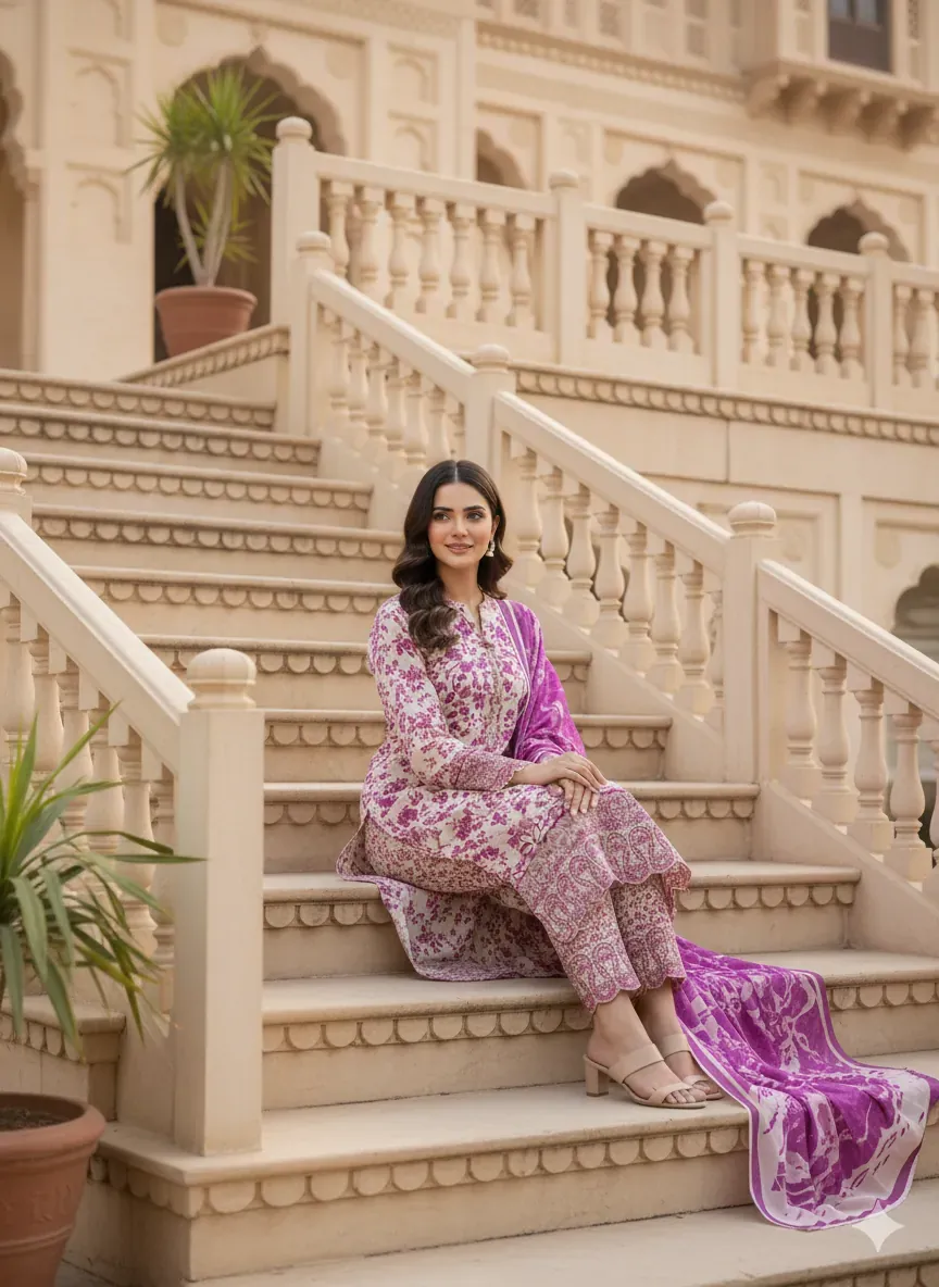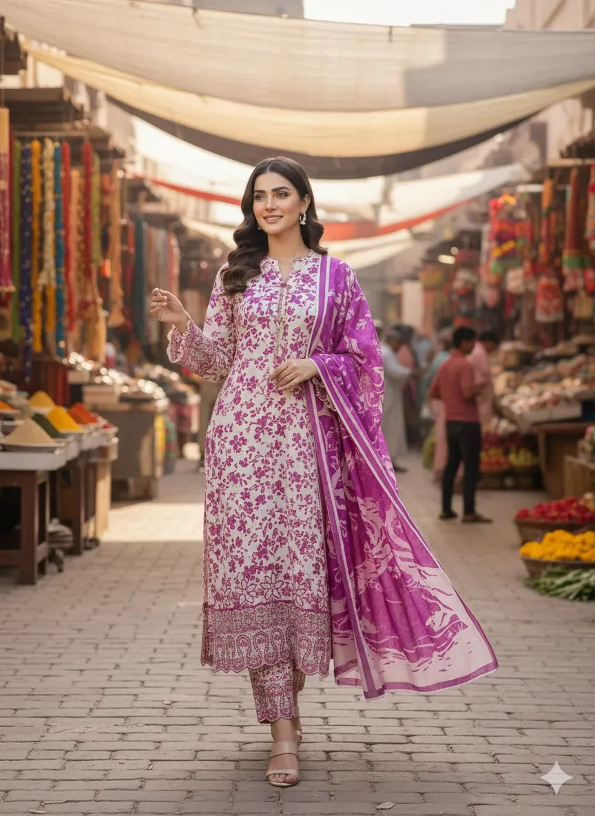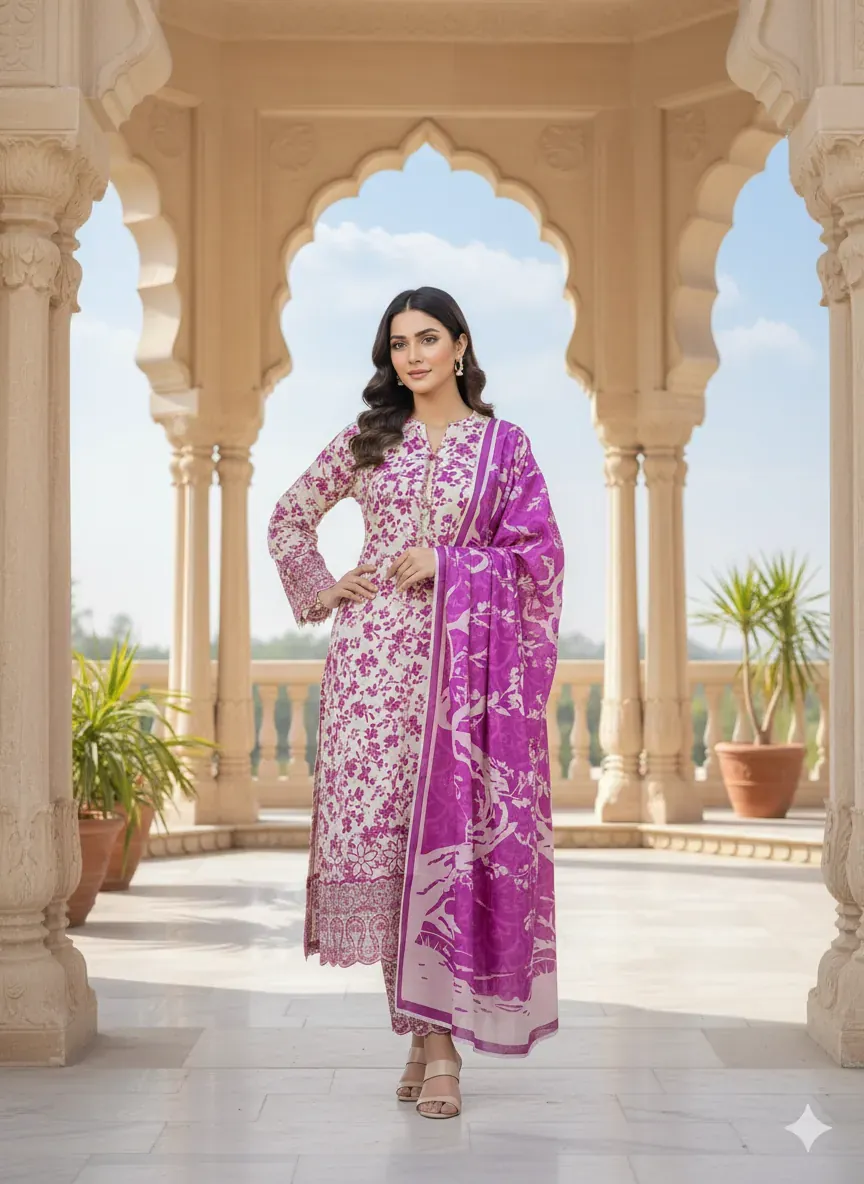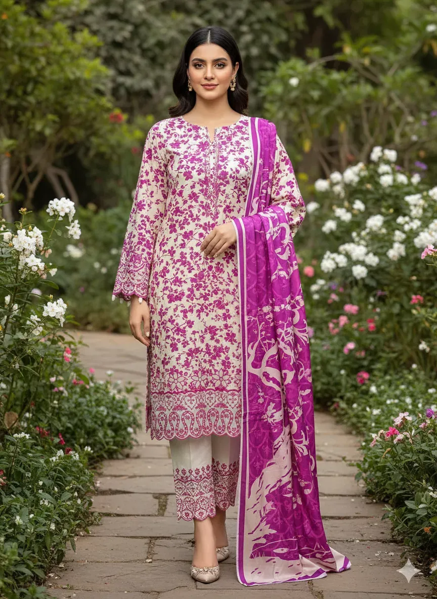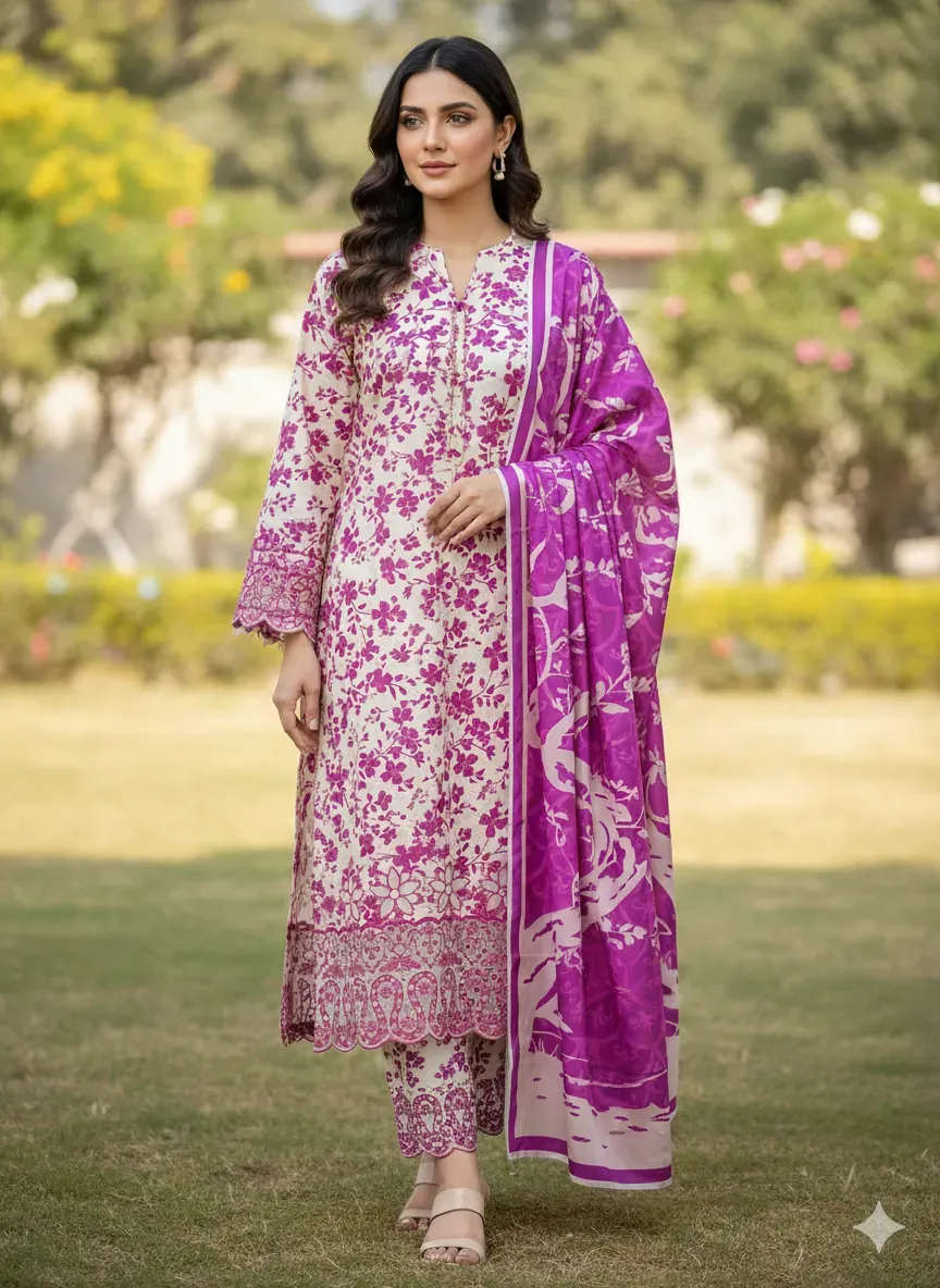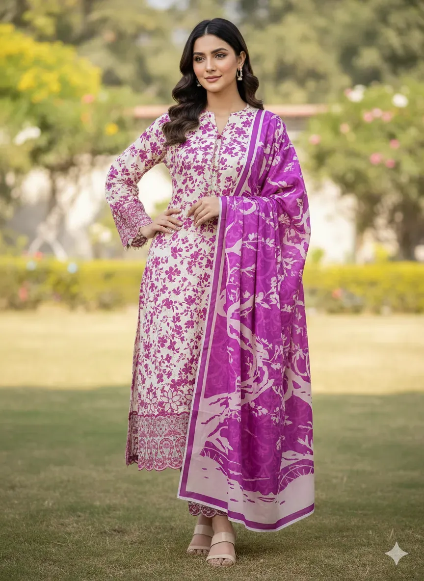 Step into elegance with our most demanded Baroque Winter 2025 collection. This premium quality (72/72) 3-piece linen suit is a masterpiece of design, showcasing a sophisticated, all-over floral digital print in striking shades of purple and magenta on a classic off-white base.