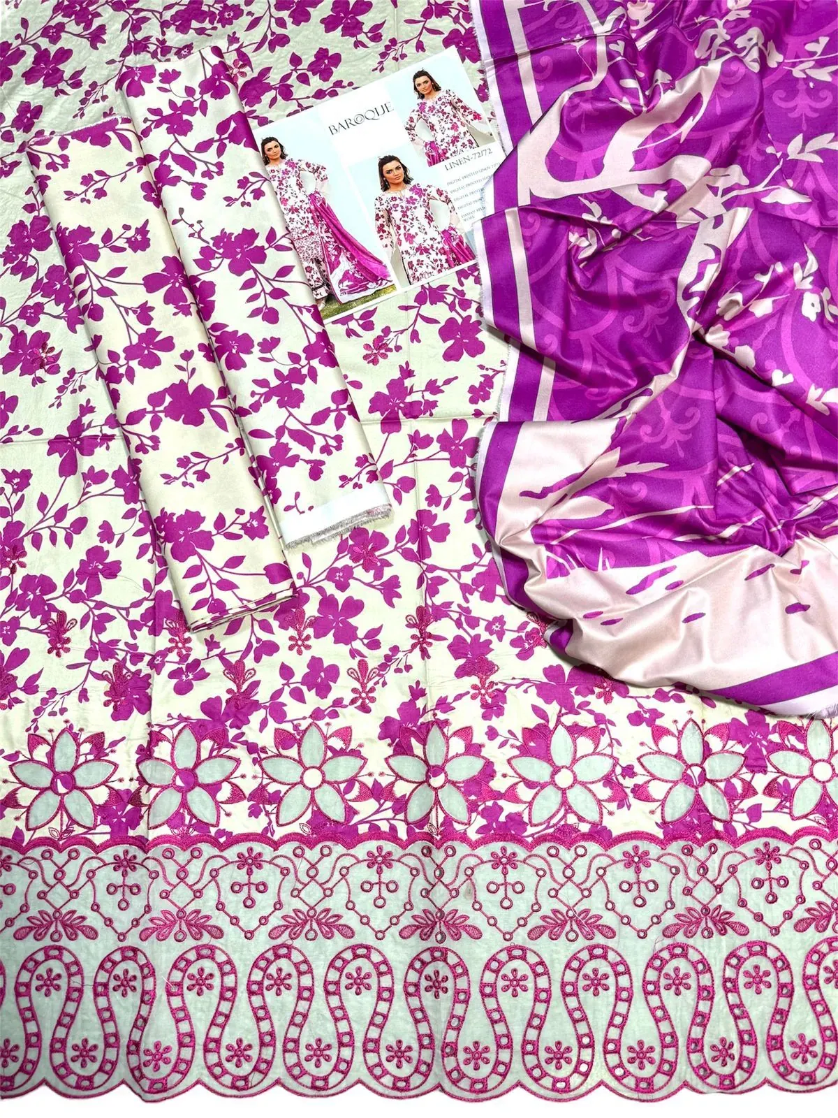 Baroque Winter 2025: Premium Linen Digital Printed 3-Piece Unstitched Suit with Heavy Embroidered Cutwork Daman and Dupatta in Purple and Magenta
