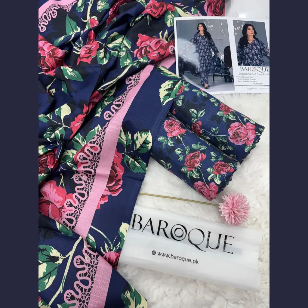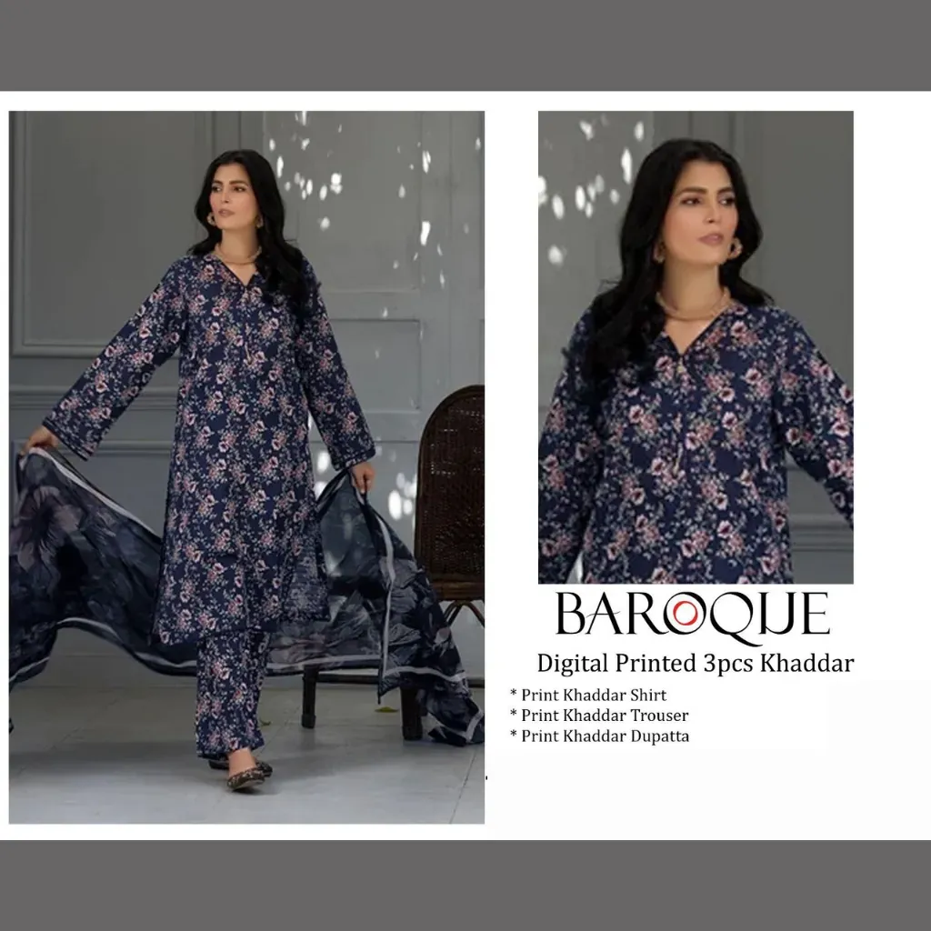 This unstitched suit includes a khaddar printed shirt, khaddar printed trouser, and a matching khaddar printed dupatta, giving you a complete outfit that can be styled for casual gatherings, office wear, university days, or family events. The high-quality khaddar fabric is specially designed to keep you cozy during cold weather while maintaining breathability and comfort.Brand: BAROQUE