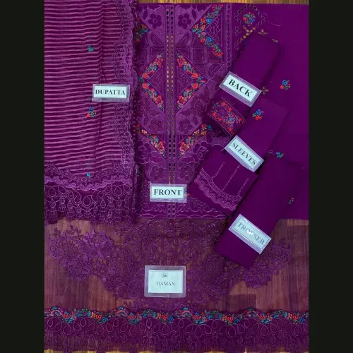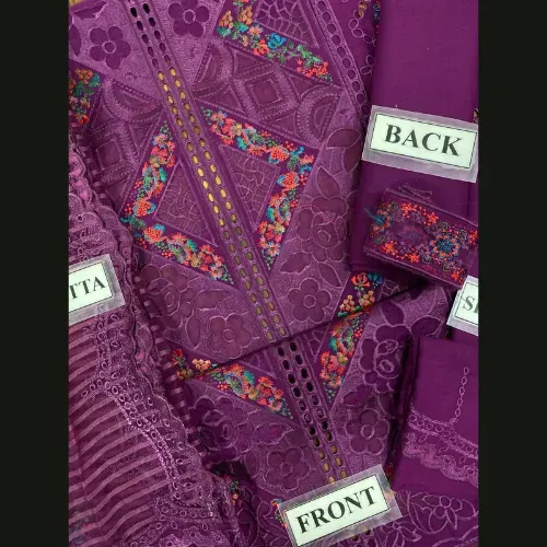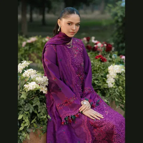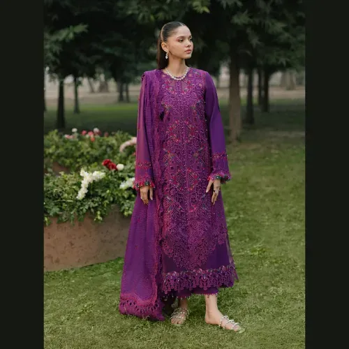 This BIN ILYAS luxury unstitched 3-piece set redefines elegance with its intricate chikankari craftsmanship. The lawn cotton front features delicate embroidery with a modern laser cut design, beautifully paired with embroidered organza borders and daman patches. The sleeves are embroidered with fine detailing, while the chikankari embroidered cuff adds an extra touch of refinement. The plain lawn cotton back is subtly enhanced with an embroidered patch, maintaining a perfect balance of simplicity and luxury.