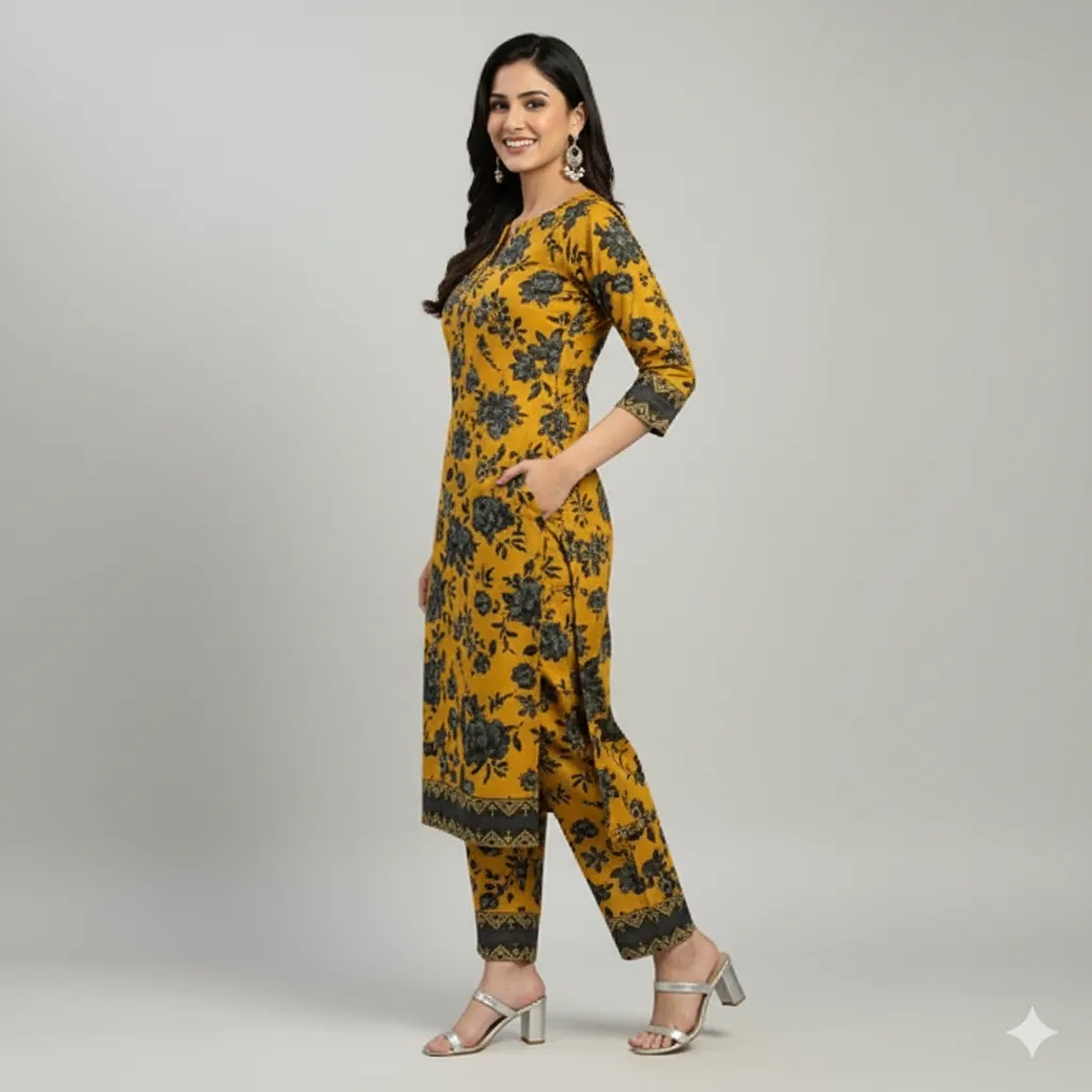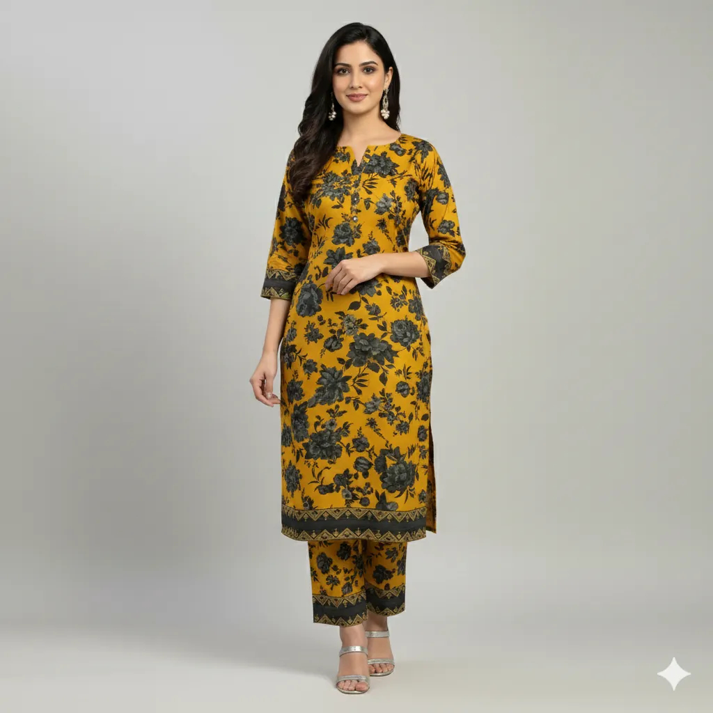 BIN SAEED Original 2-Piece Printed Lawn Suit - Dark Gray Floral Print on Golden-Yellow Base. Shop the original BIN SAEED 2-piece printed lawn collection. This suit features a stunning large floral print in dark gray on a golden-yellow base, with a stylish black and white geometric border. The set includes a printed lawn shirt and a matching trouser. Experience the elegance and comfort of the BIN SAEED 2-Piece Printed Lawn Collection. This 100% original suit features a striking large-scale floral print in a deep, almost black, gray color, set against a vibrant golden-yellow background with a subtle striped texture. The border is a bold black with a white geometric pattern. The set includes a beautifully designed printed lawn shirt and a matching printed lawn trouser. The fabric is a generous 5-meter cutting, providing ample material for a perfect fit. Ideal for daily wear, office, or casual outings, this summer collection offers both style and breathability.
