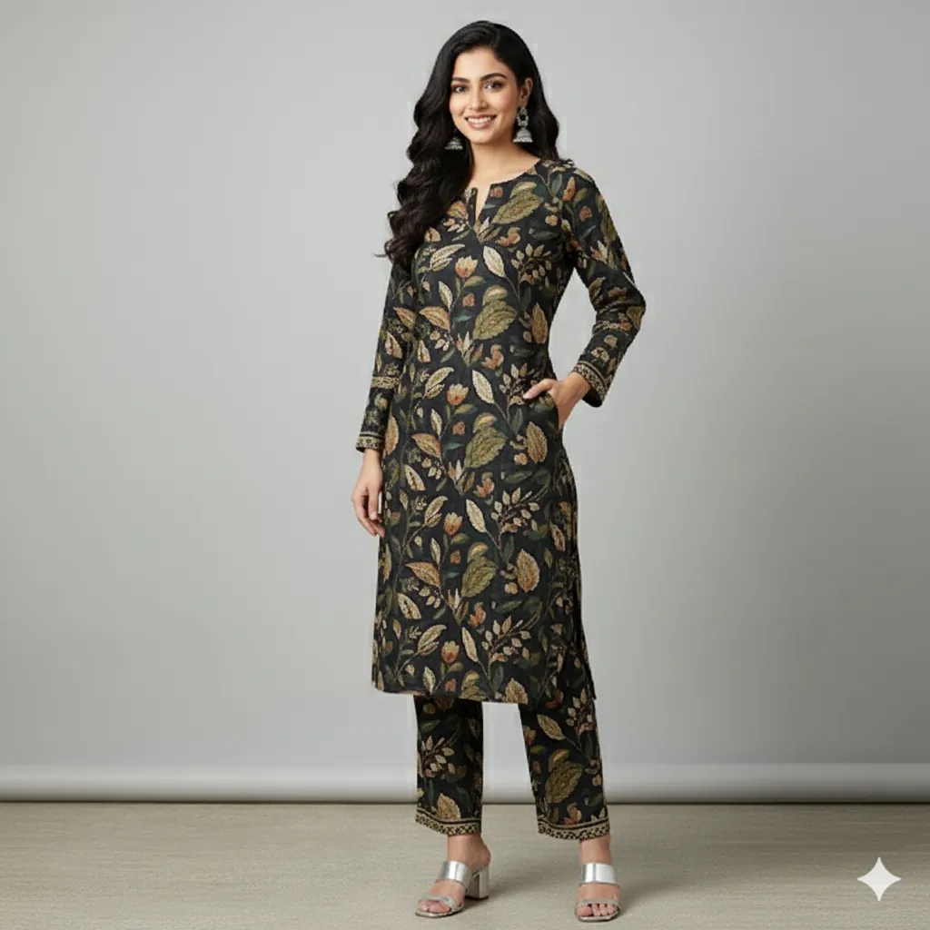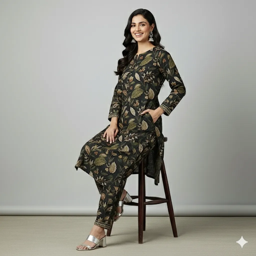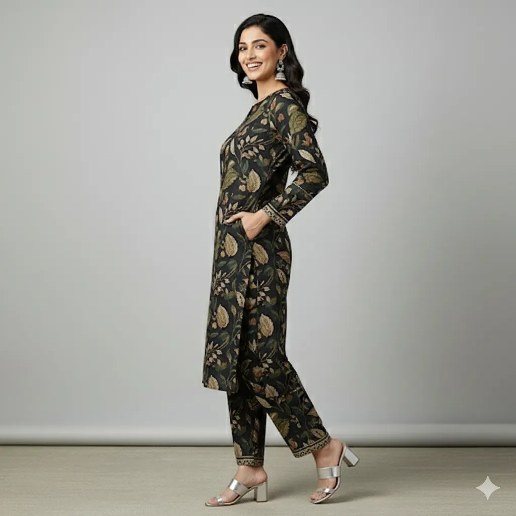 BIN SAEED Original 2-Piece Printed Lawn Suit - Green & Brown Floral Print on Black Base.Shop the original BIN SAEED 2-piece printed lawn collection. This suit features an intricate floral and leafy print in shades of green, brown, and orange on a chic black base with a patterned border. The set includes a printed lawn shirt and a matching trouser. Experience the elegance and comfort of the BIN SAEED 2-Piece Printed Lawn Collection. This 100% original suit features a striking floral and leafy pattern in shades of green, brown, and a light orange, all set against a deep black background. The border is a detailed, light-colored patterned design that adds a touch of sophistication. The set includes a beautifully designed printed lawn shirt and a matching printed lawn trouser. The fabric is a generous 5-meter cutting, providing ample material for a perfect fit. Ideal for daily wear, office, or casual outings, this summer collection offers both style and breathability.