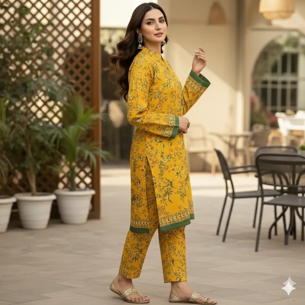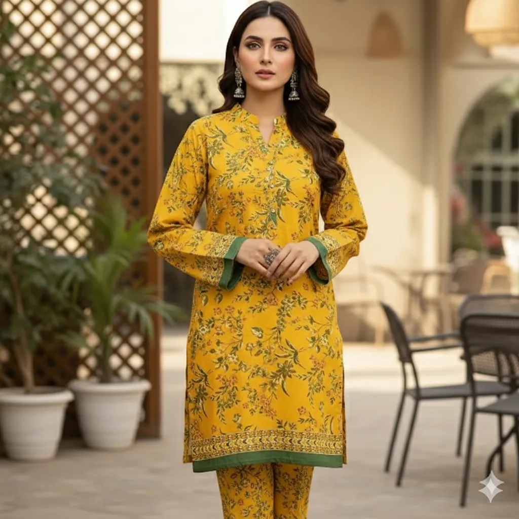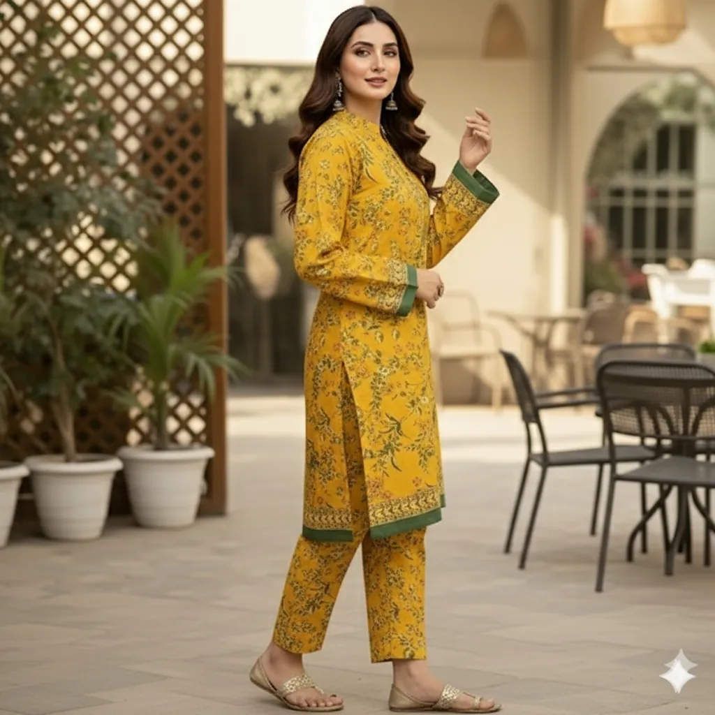 BIN SAEED Original 2-Piece Printed Lawn Suit - Yellow & Green Floral Print on Yellow Base. Experience the elegance and comfort of the BIN SAEED 2-Piece Printed Lawn Collection. This 100% original suit features a stunning floral print in shades of green and a hint of orange on a vibrant yellow base, with a striking green patterned border. The set includes a beautifully designed printed lawn shirt and a matching printed lawn trouser. The fabric is a generous 5-meter cutting, providing ample material for a perfect fit. Ideal for daily wear, office, or casual outings, this summer collection offers both style and breathability.