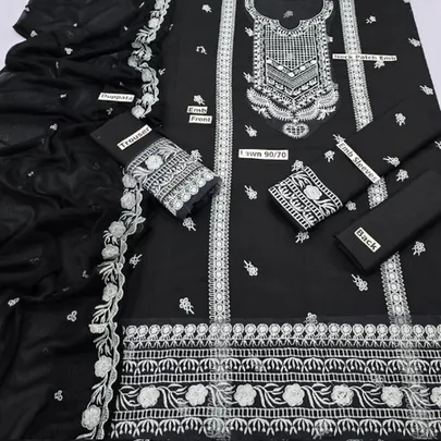 This striking black 3-piece lawn suit showcases beautiful white embroidery on a breathable lawn fabric. The set includes a detailed shirt front, plain back and trousers, and embroidered sleeves, paired with a stylish bamber dupatta. Perfect for a sophisticated yet comfortable look. Key features include intricate embroidery, breathable lawn fabric, a bamber dupatta, and a classic black and white color combination. Embrace timeless elegance with this exquisitely detailed 3-piece unstitched suit, a classic black canvas brought to life with stunning white embroidery. This ensemble showcases the beauty of intricate threadwork on premium "Lawn 90/70" fabric, offering both a luxurious feel and exceptional breathability. The shirt is a masterpiece of traditional design, featuring elaborate white embroidery that graces the front panel, creating a captivating focal point around the neckline and flowing downwards in intricate motifs. The sleeves are also beautifully embroidered, adding a cohesive touch to the overall design. The borders of the shirt are finished with delicate and detailed embroidered patterns, elevating its sophistication.