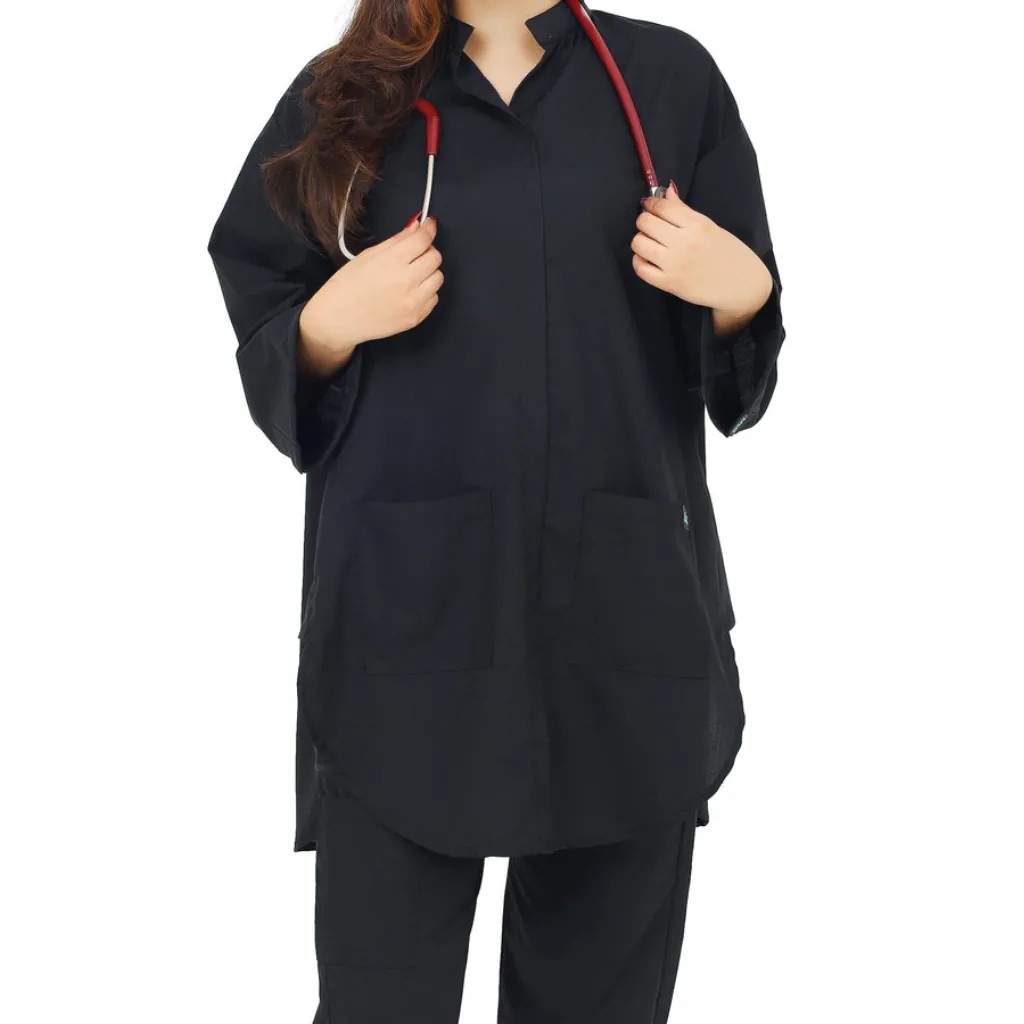 The frock-style top with a loose fit ensures easy movement during long shifts, while the full sleeves provide additional coverage and protection. Its classic black color adds a touch of sophistication, making it a perfect choice for both hospital and clinical settings.