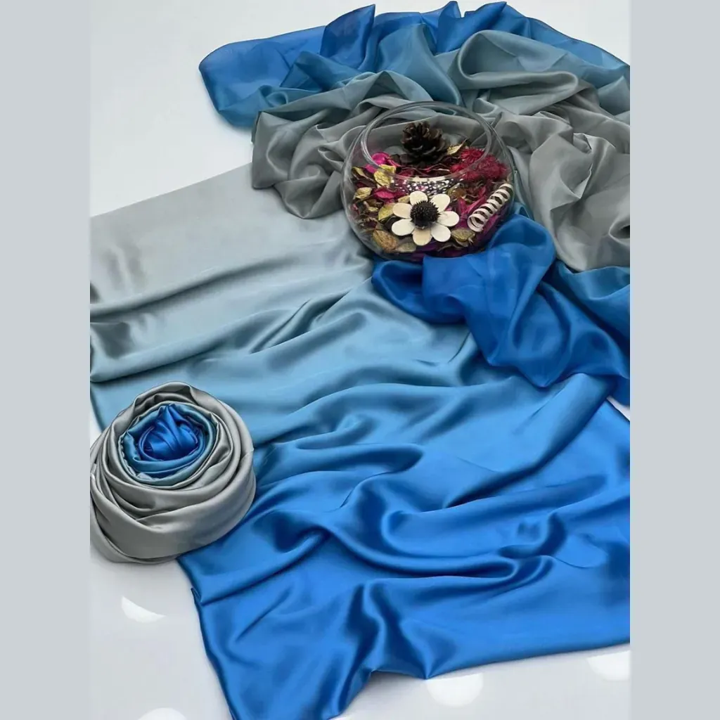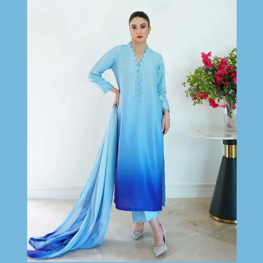 Step into elegance with this Blue Ombre Shamooz Silk Unstitched 3 Piece Suit, designed for women who value timeless style and modern sophistication. Crafted from premium shamooz silk, this outfit features a beautiful gradient blend from light sky blue to rich navy blue. The set includes a shirt, trouser, and dupatta – all in matching ombre tones. Its soft and breathable texture ensures comfort, while the graceful design makes it ideal for festive events, parties, or everyday elegance.