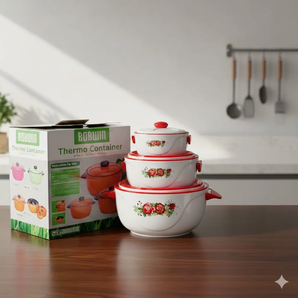 BOBBIN 3-Piece Insulated Thermos Container Hot Pot Set | Premium Floral Design Casserole with Side Handles | Double-Wall Thermal Food Storage for Kitchen & Dining | Multi-Size Serving Dish Set