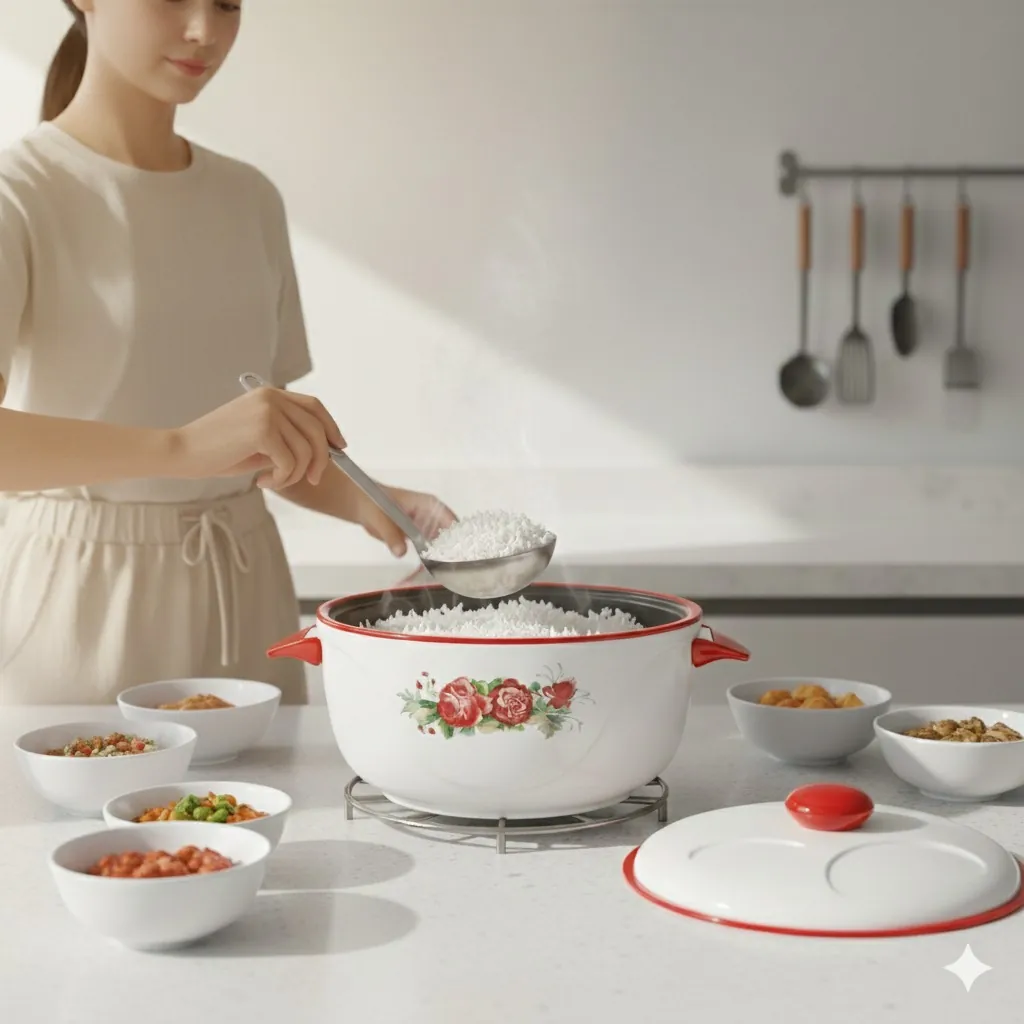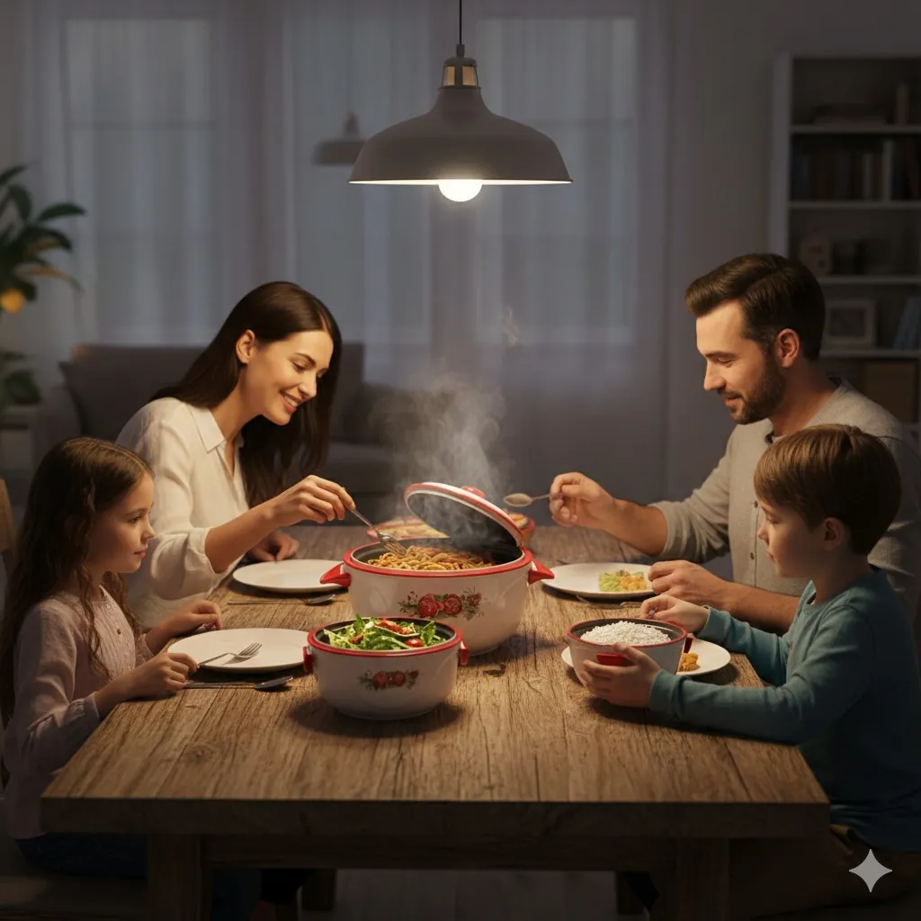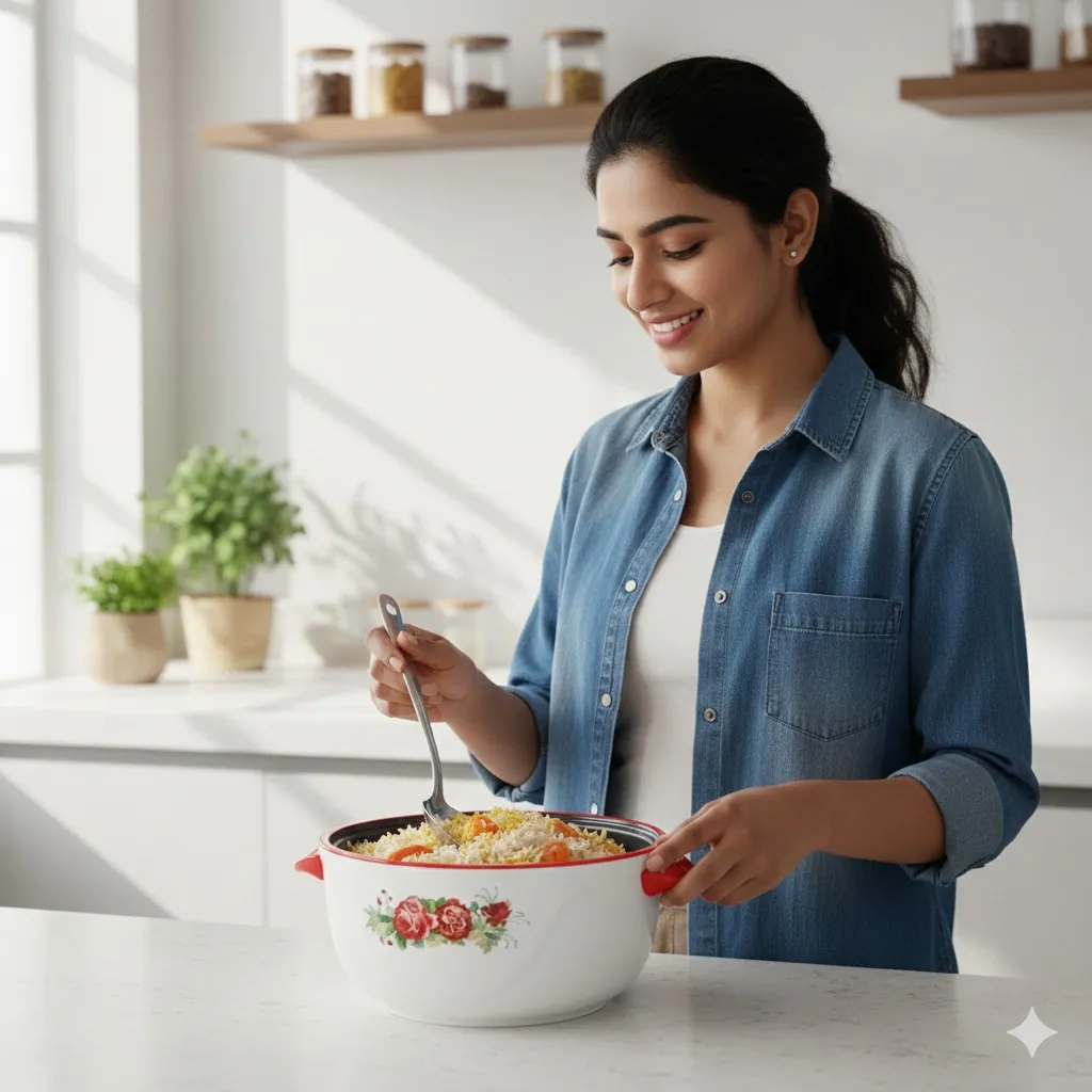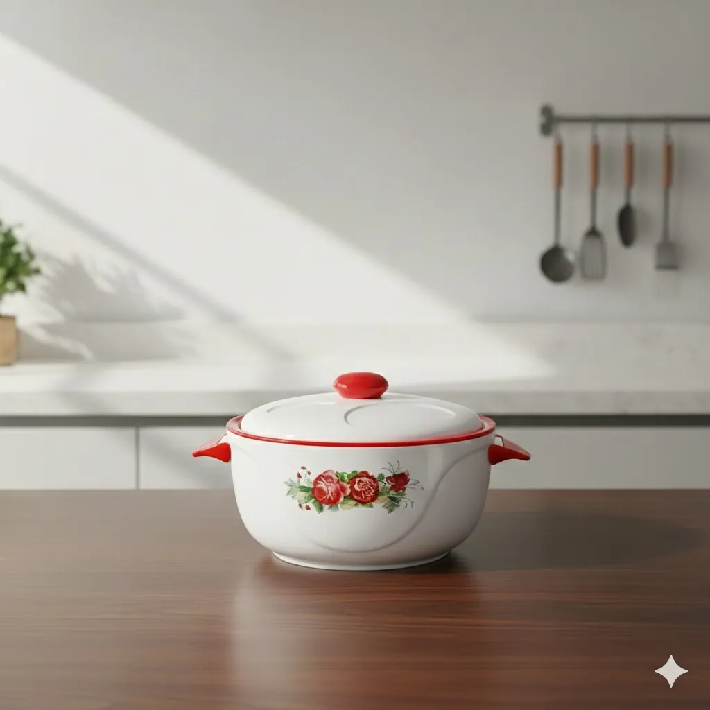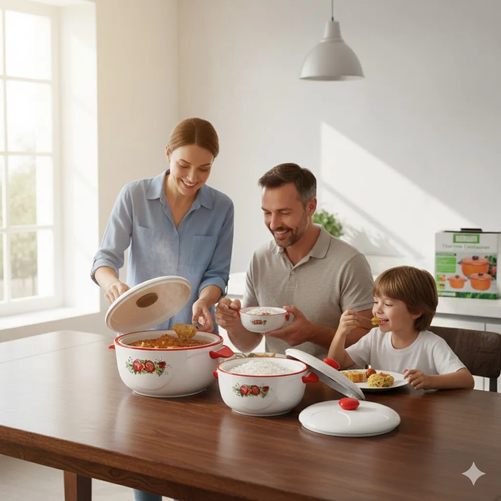 The BOBBIN Insulated Thermos Container Set is a must-have for every kitchen, combining practical utility with a stylish aesthetic. This set includes three different-sized casseroles, each designed with double-wall insulation to lock in heat and flavor effectively. The high-quality food-grade interior is paired with a durable outer shell featuring a classic rose floral motif and vibrant red trim. Equipped with sturdy side handles for easy carrying and a snug-fit lid to prevent heat loss, this set is ideal for family dinners, outdoor picnics, and festive gatherings. Whether it's rice, rotis, or curries, serve them at the perfect temperature every time.