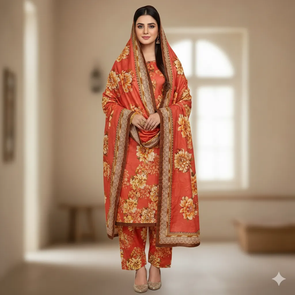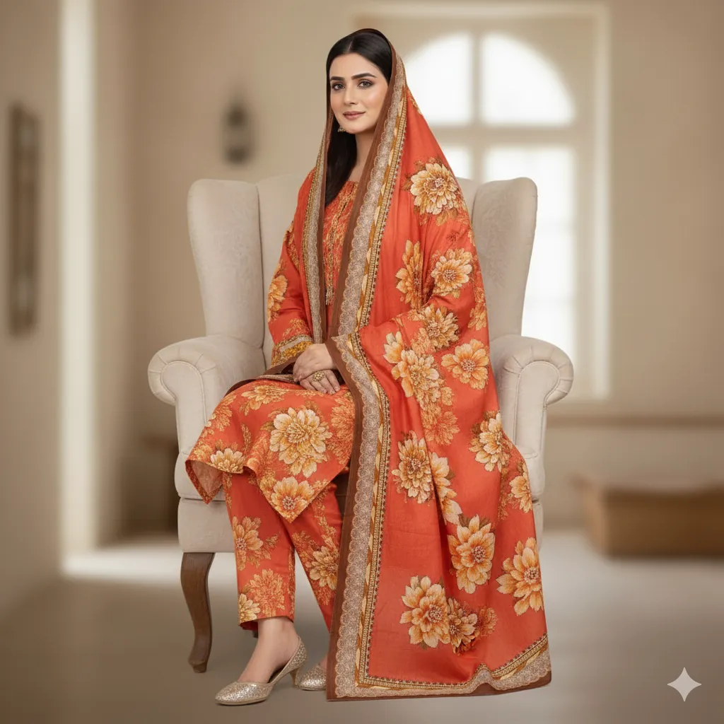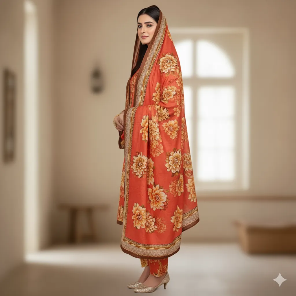 Ideal for daily wear or casual gatherings, this Bonanza suit promises both style and comfort in every stitch. The vibrant orange floral tones and border lace prints add a luxurious touch to your winter look.