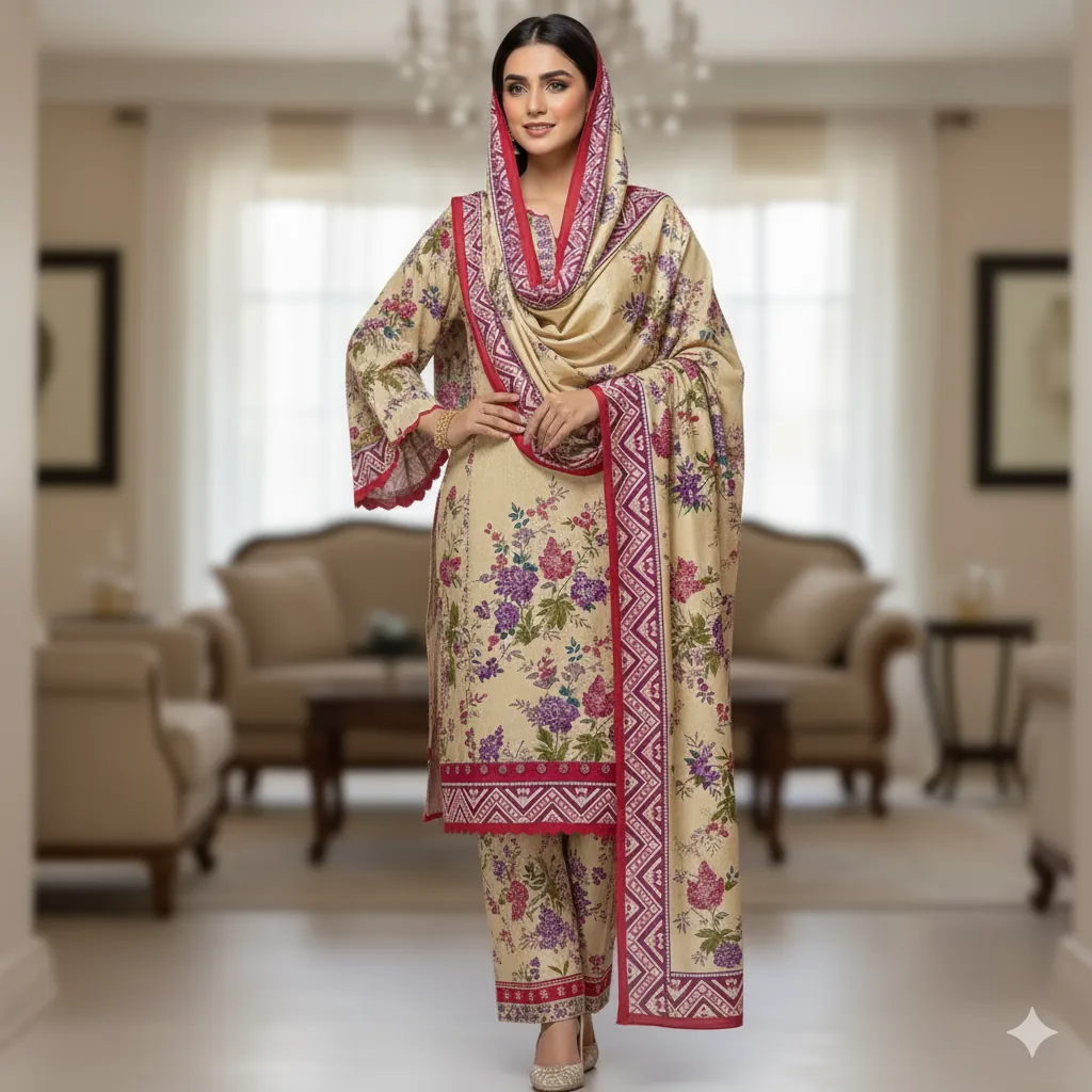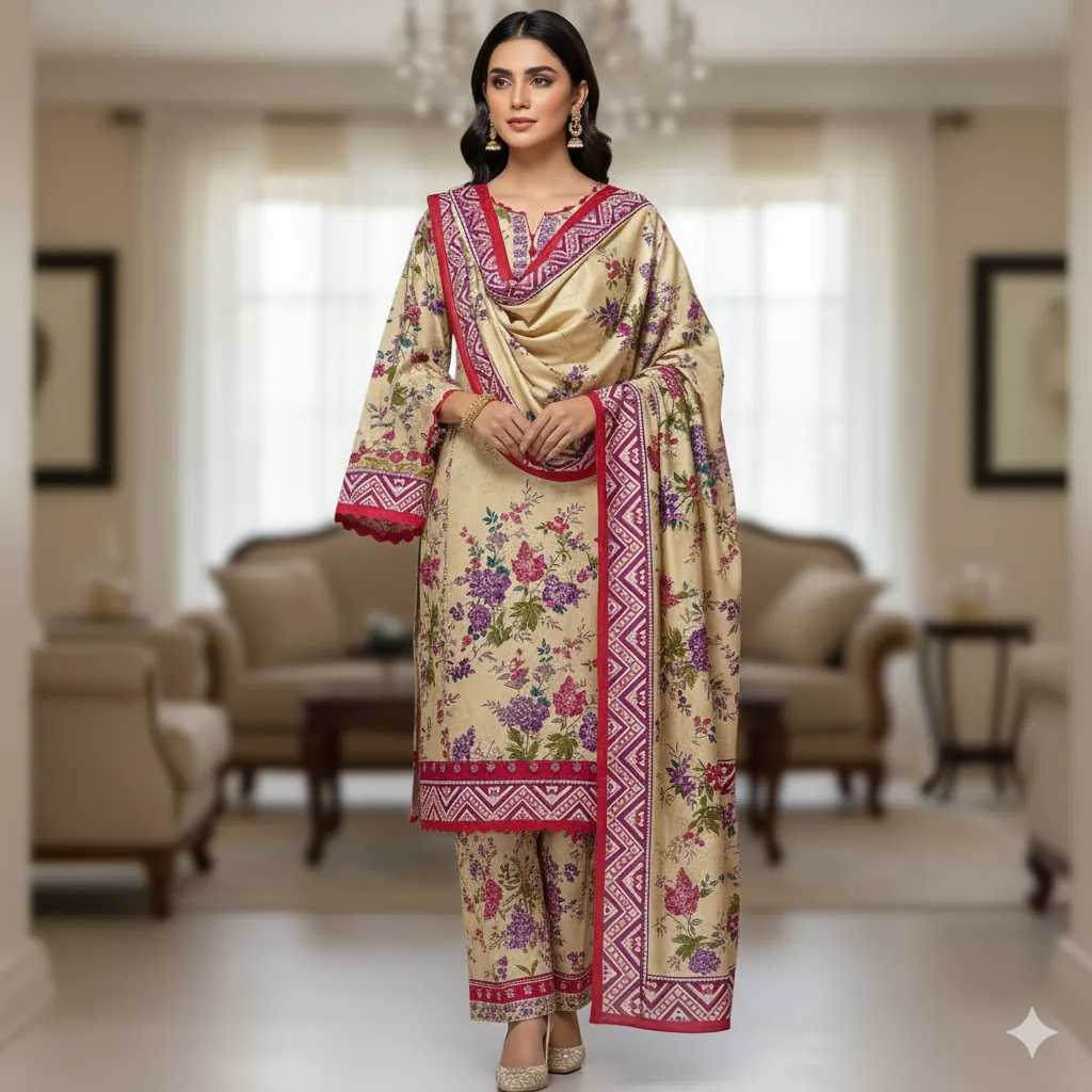 Bonanza Original Printed Linen 3-Piece Suit for Women | Cream Floral Allover Design with Pink Border | Premium Winter Collection 2025