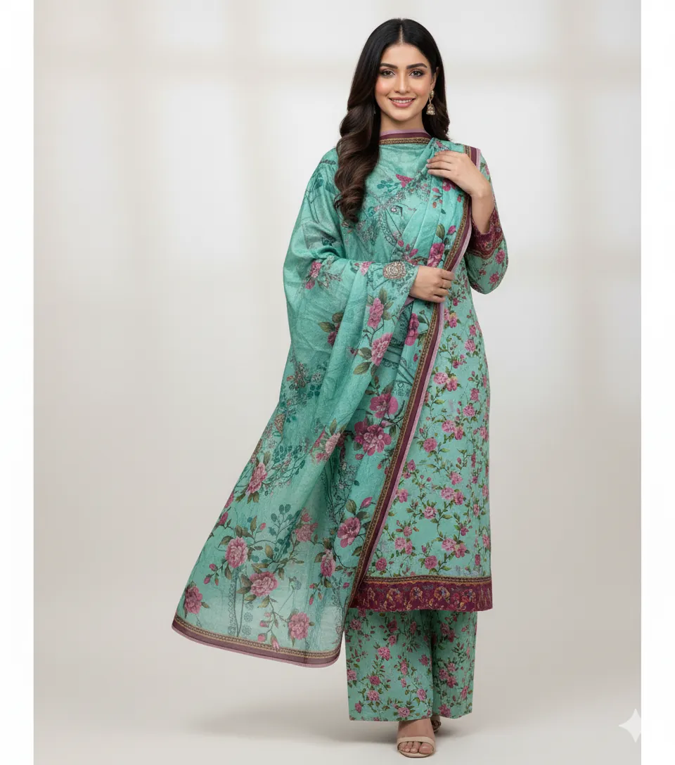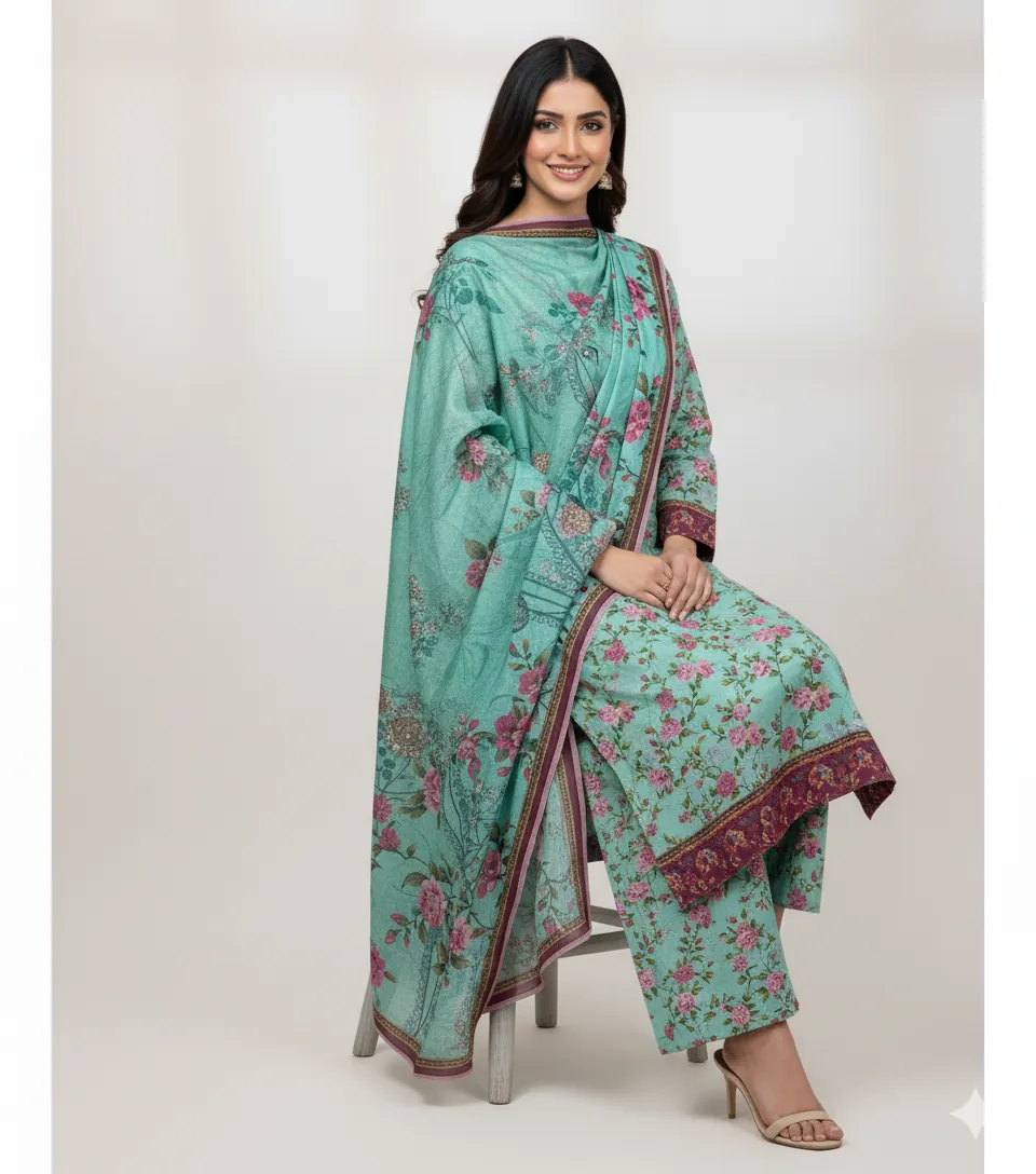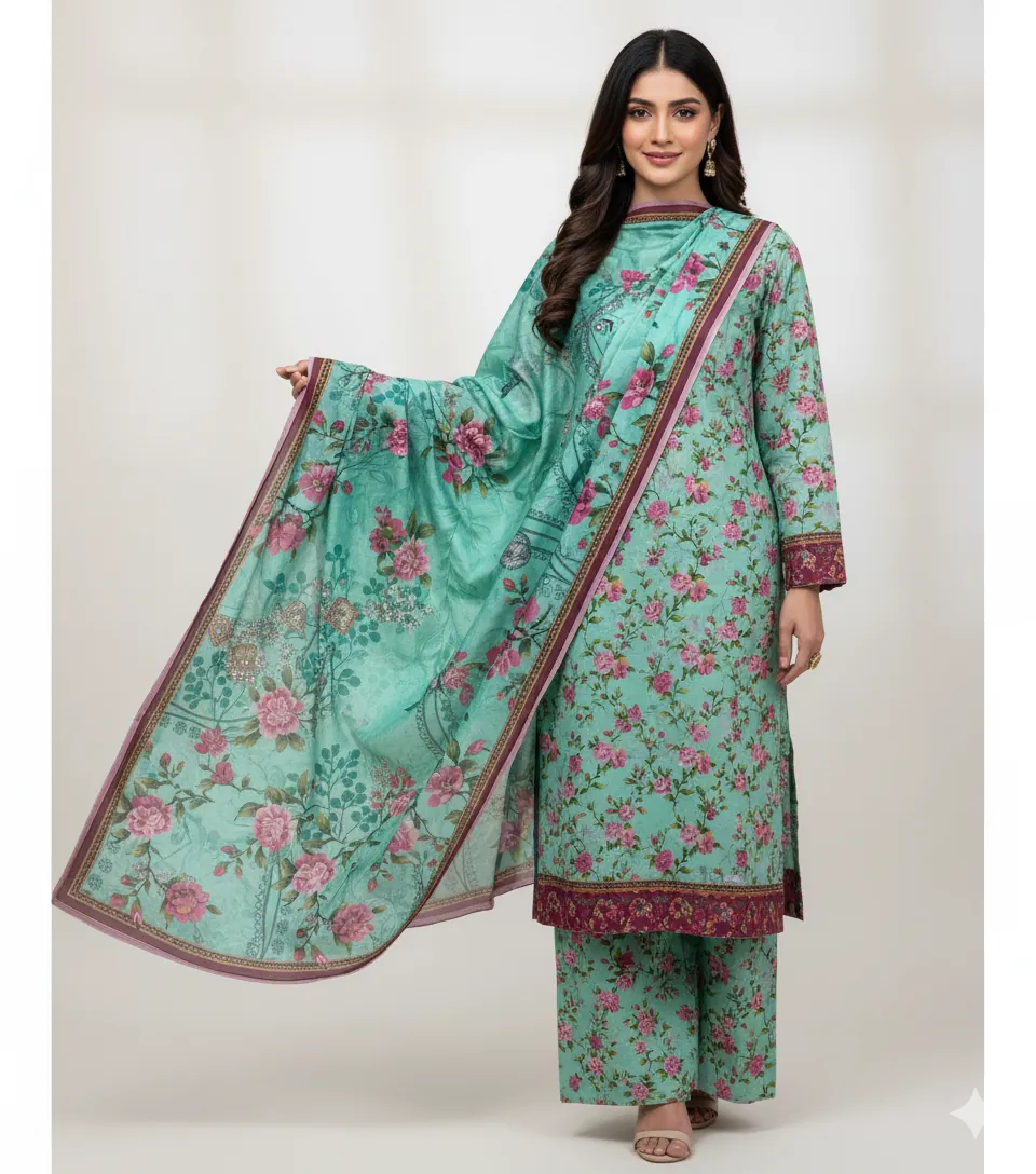 Crafted from soft and durable printed linen, this 3-piece suit includes a beautifully designed shirt, matching dupatta, and printed trouser, all ensuring both style and comfort.
